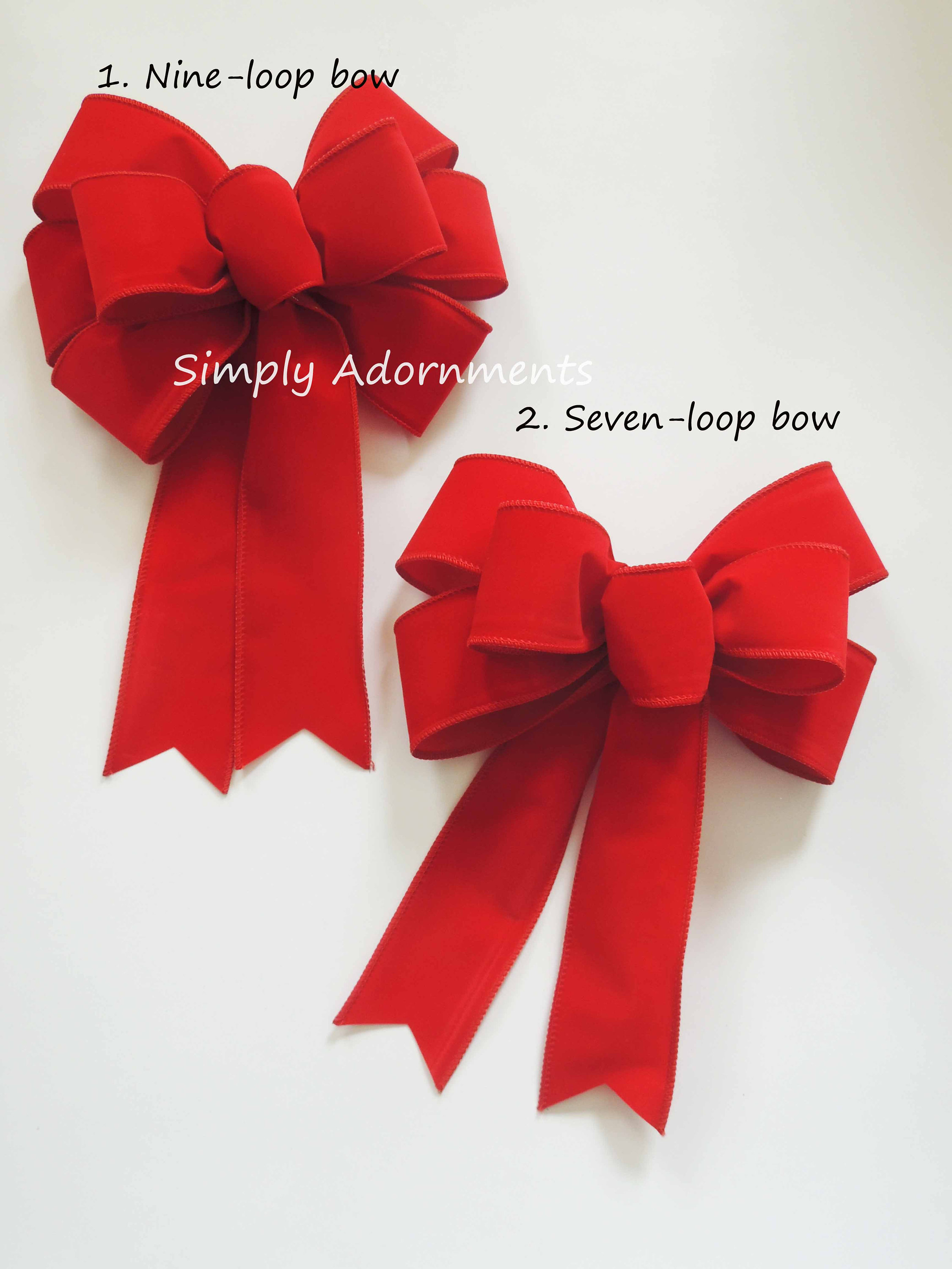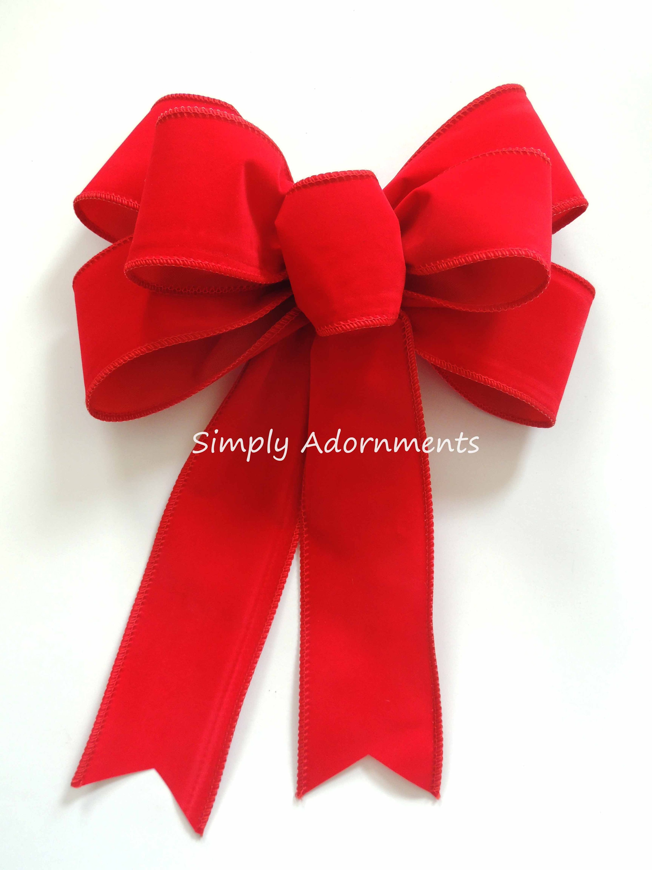 This bow is made with a 2.5" width red velvet wired ribbon. The bow length (L)is measured from the top of the bow to the end of the longest tail. Please select the "Bow Size and Style" option before checking out.