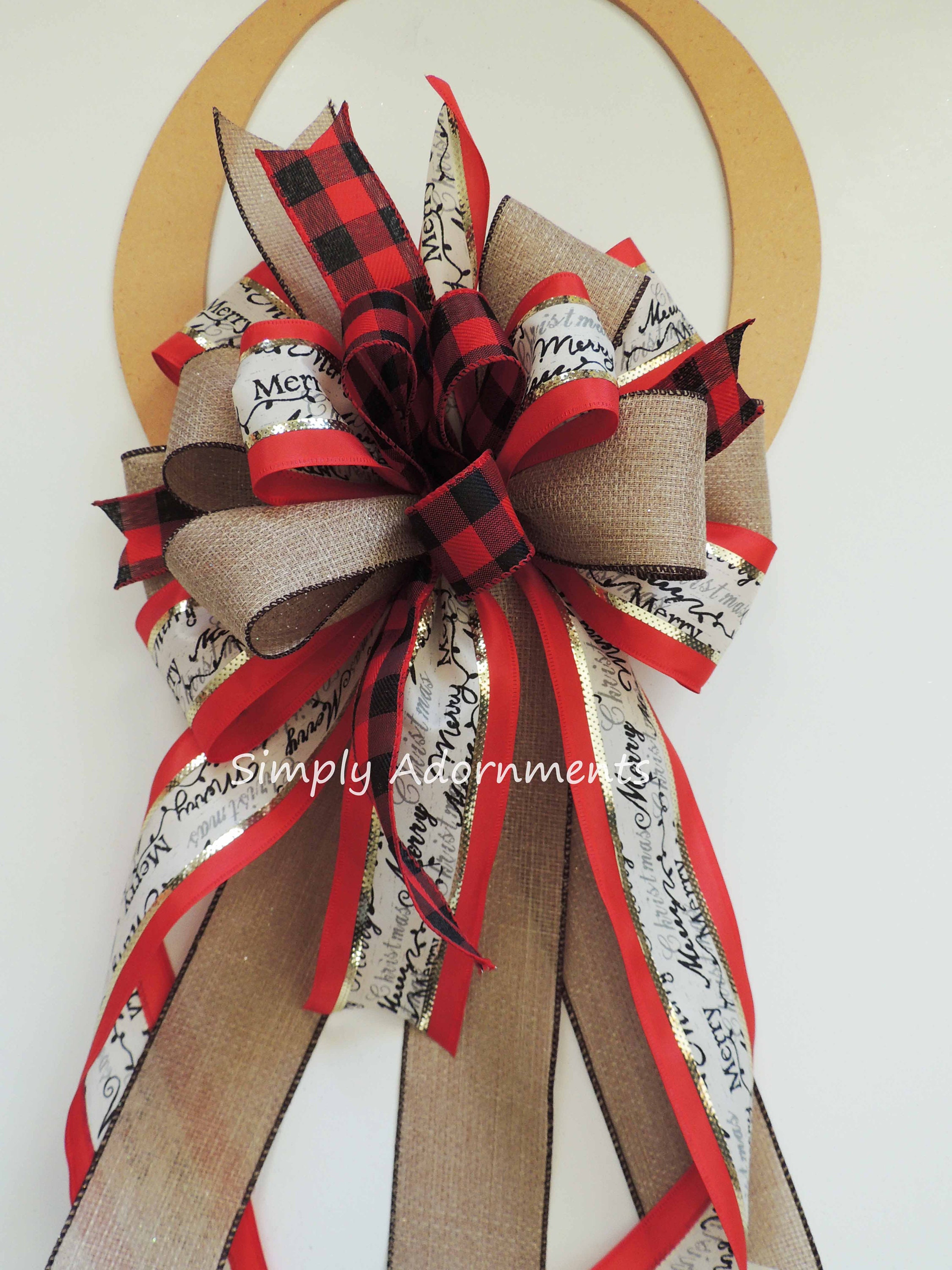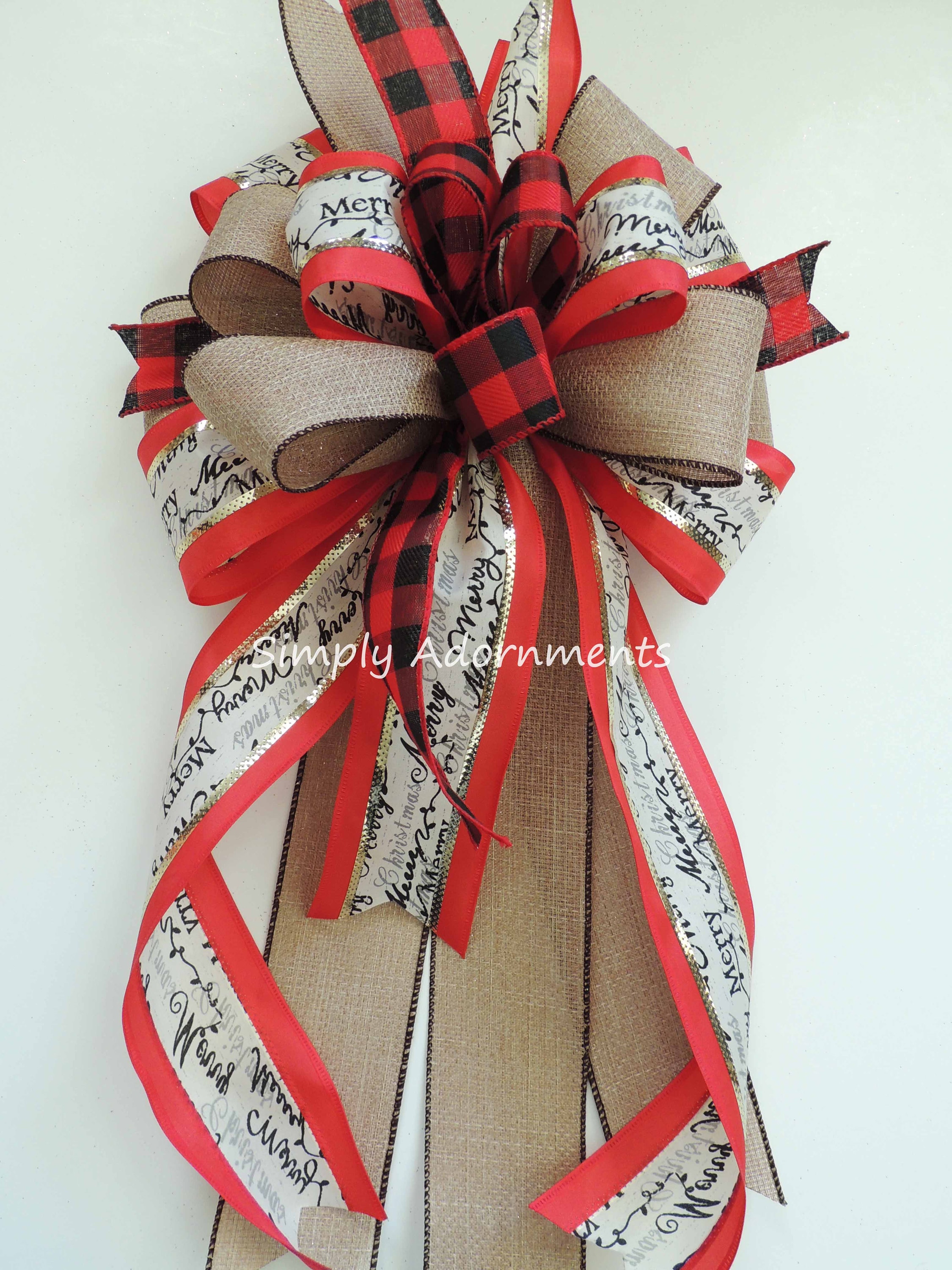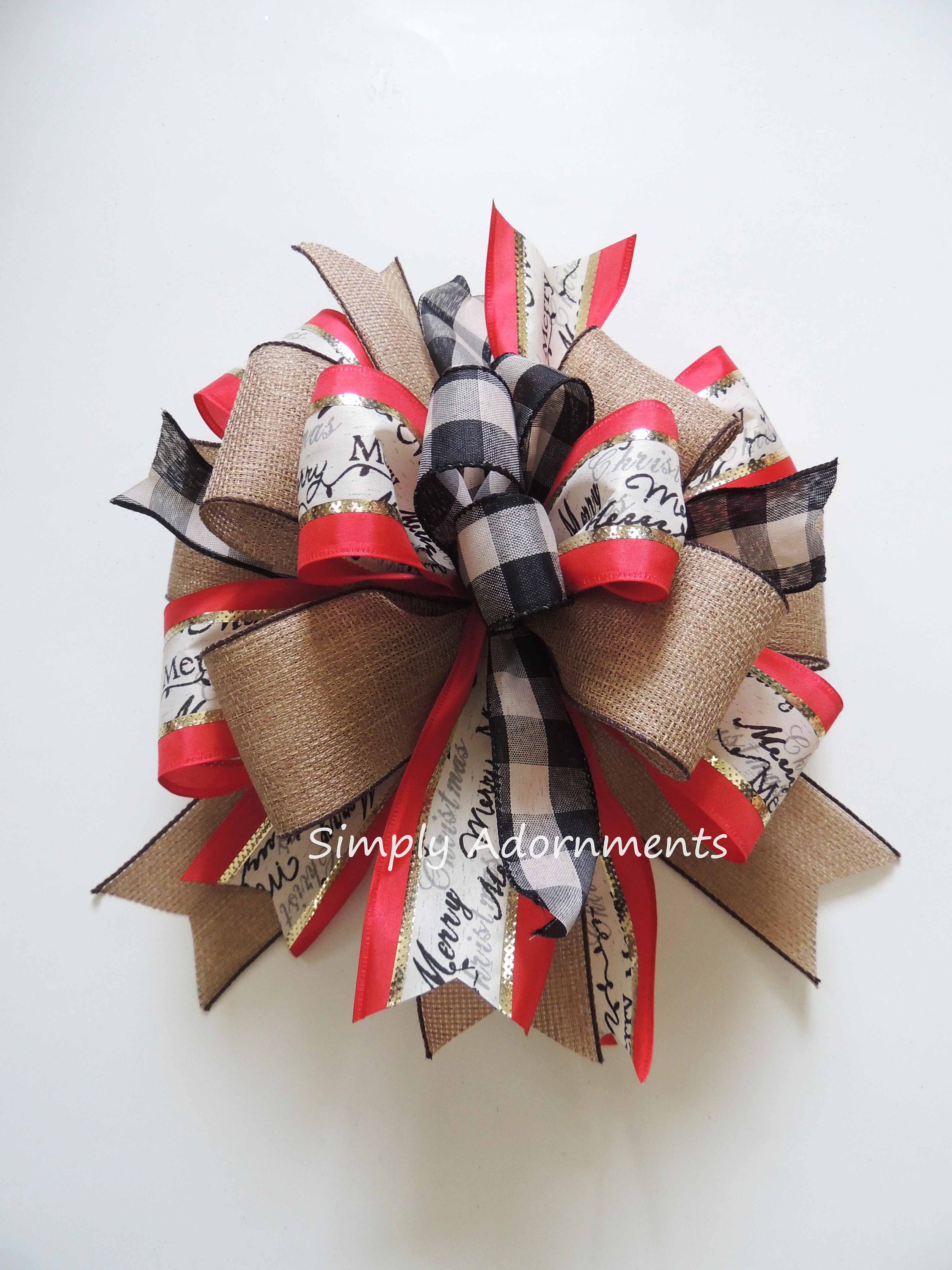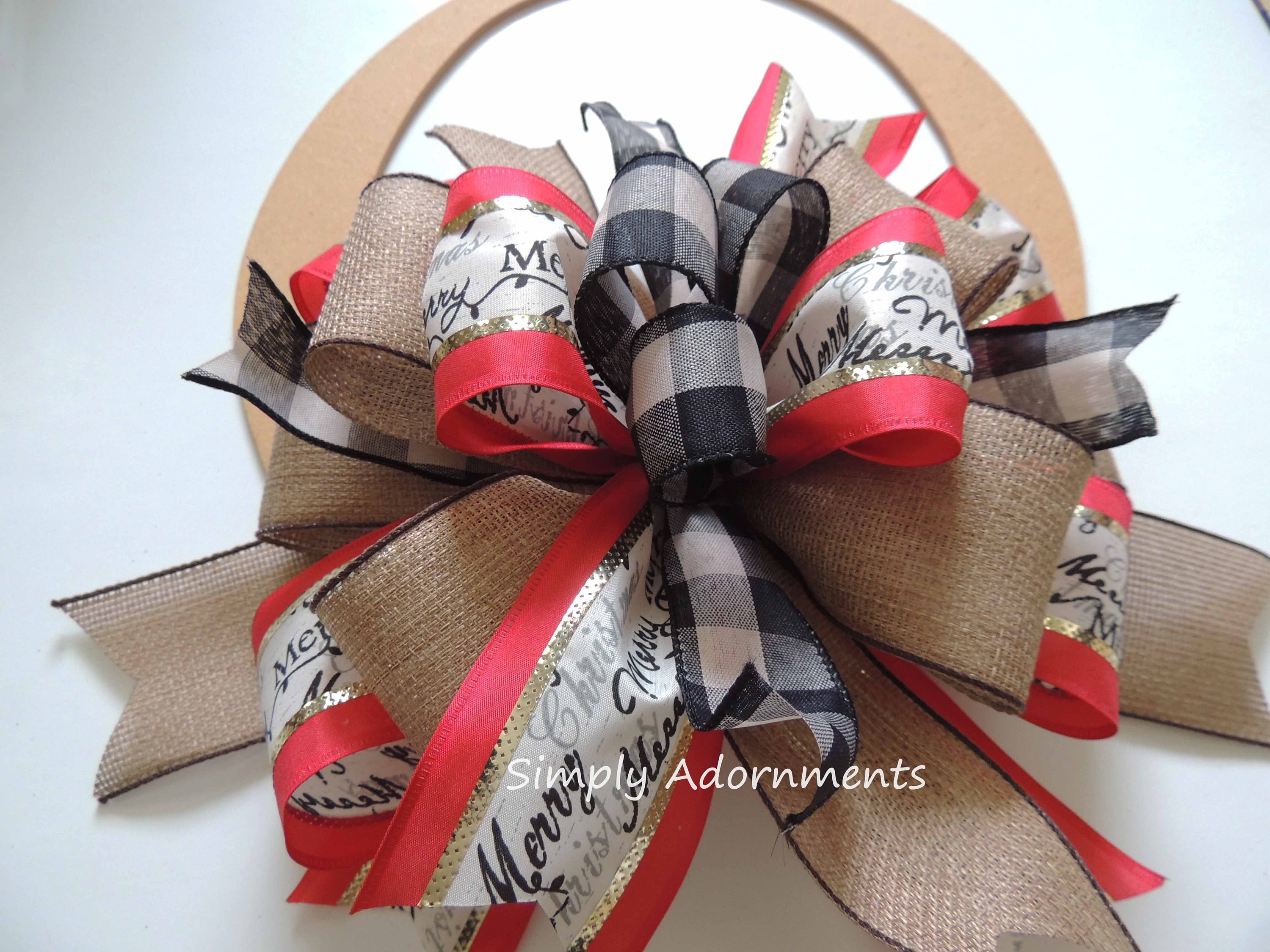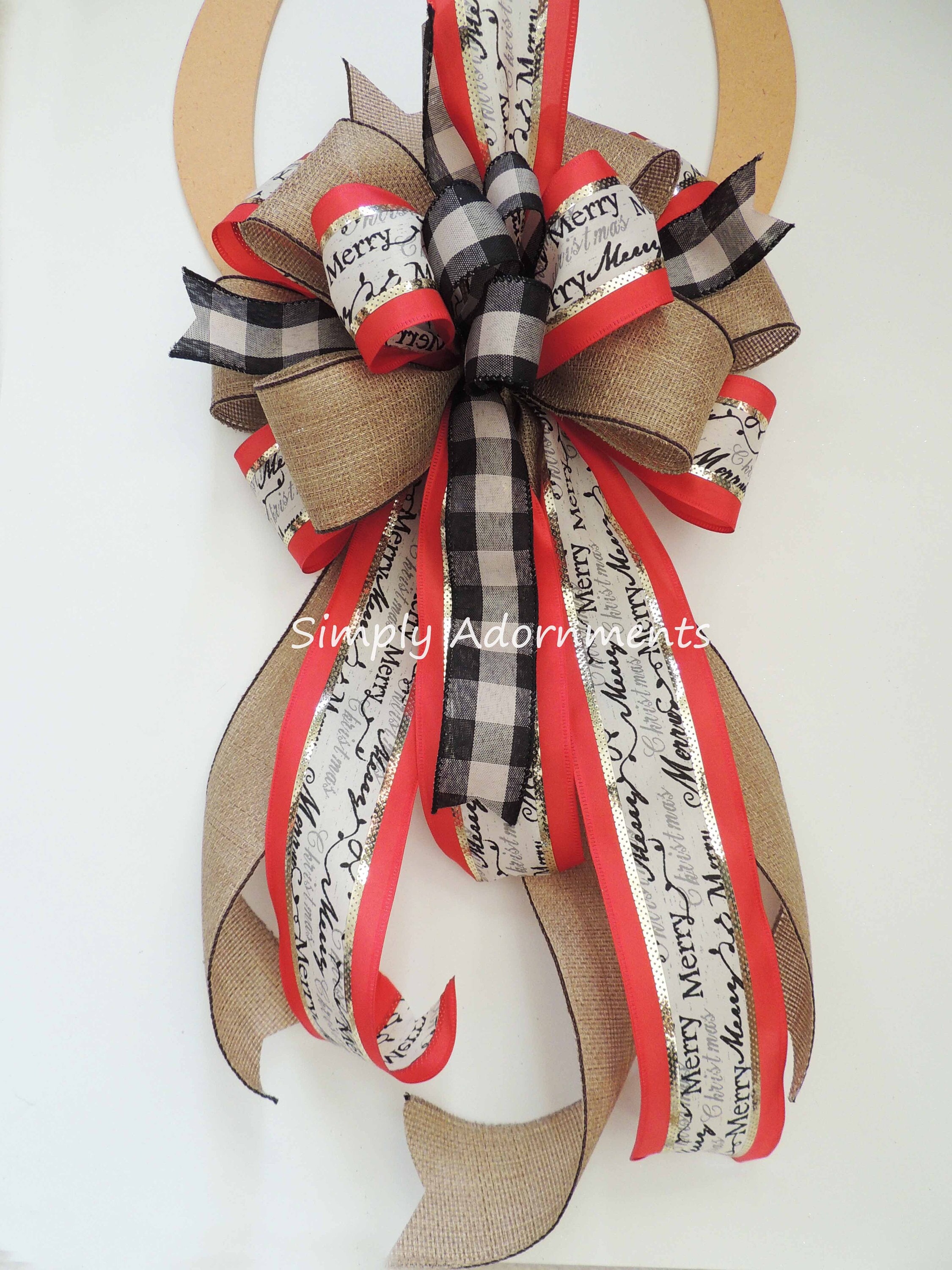 Red Black Christmas Scripts Bow, Farmhouse Christmas Scripts Wreath Bow, Farmhouse Christmas Tree Topper Bow, Red black Tree Bow, Gifts Bow