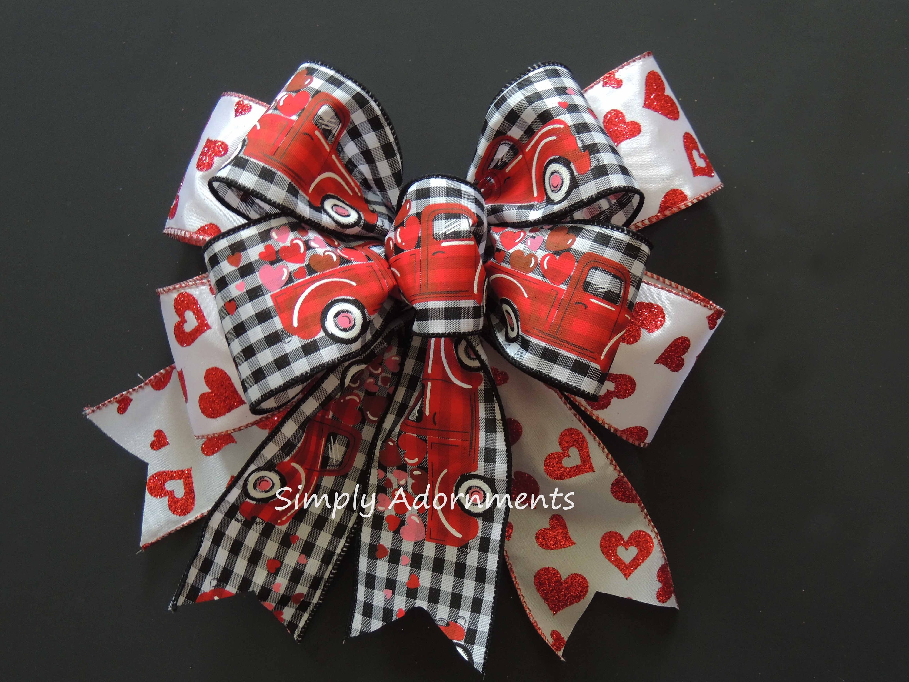 This ribbons bow that uses 2.5" and 1.5" width wire-edged ribbons. This particular bow has 4 tails (2 tails of each type of ribbons). The length bow is measured from top of the bow to the end of its tails. The bow is securely tied with florist wires and finished with chenille stem for easy attachment. Please select the "Bow Size" option before checking out.