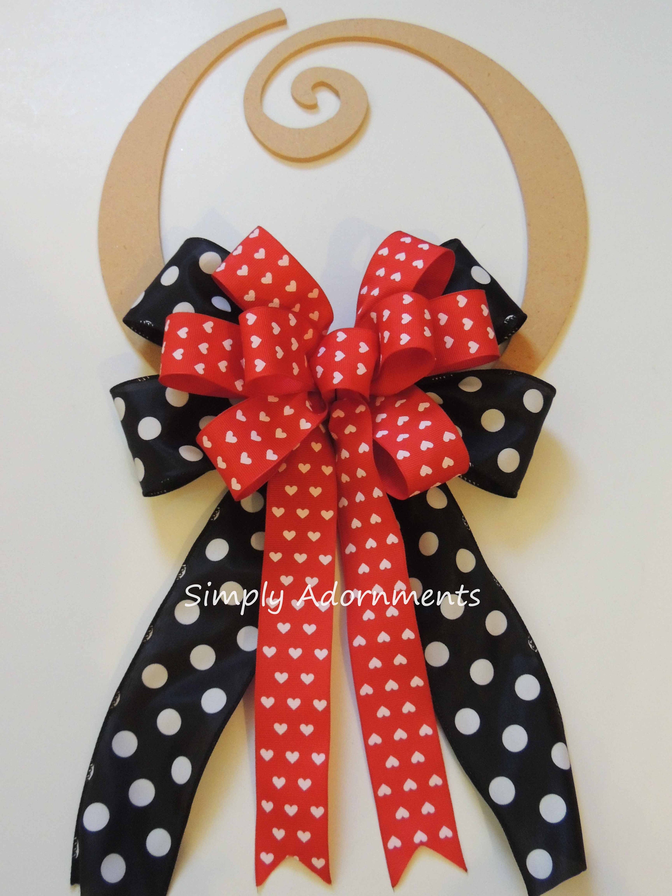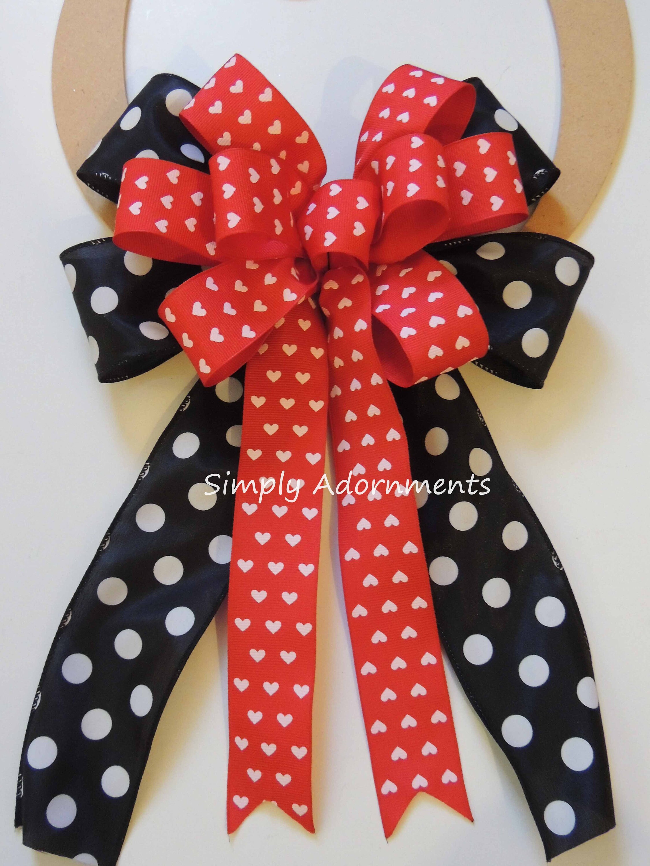 This ribbons bow that uses 2.5" and 1.5" width wire-edged ribbons. This particular bow has 4 tails (2 tails of each type of ribbons). The length bow is measured from top of the bow to the end of its tails. Please select the "Bow Size" and "Bottom Layer Ribbon" options before checking out.