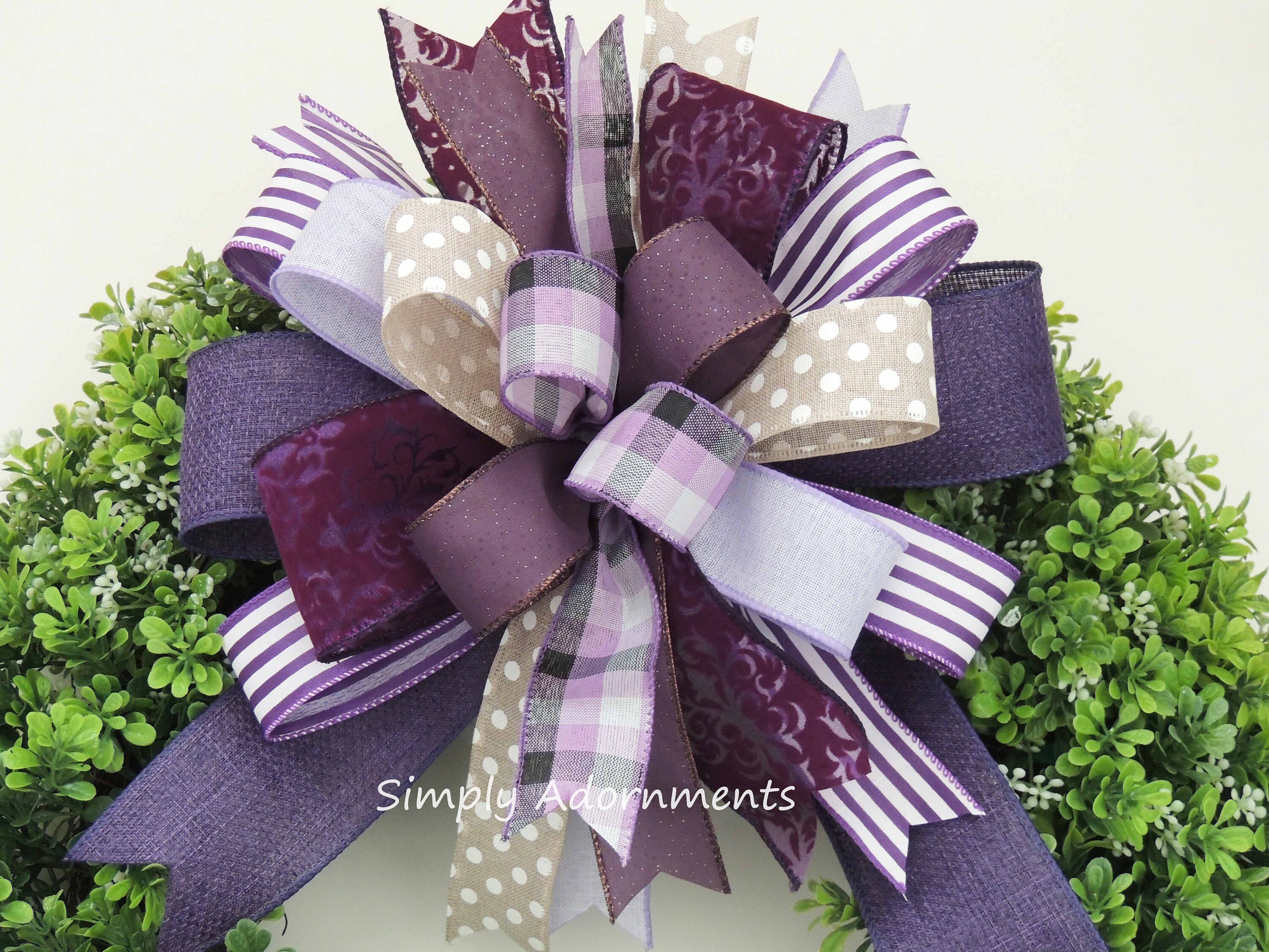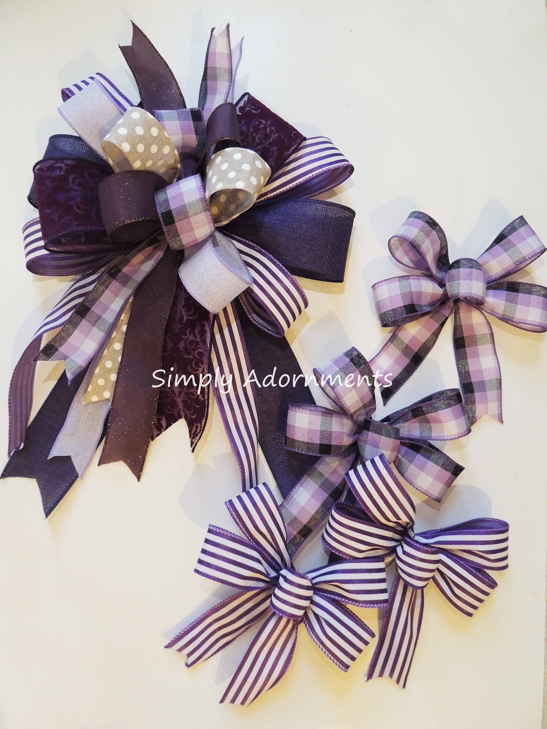 The large purple bow is created with 7 different wired ribbons. There are 2 of 2.5" wide ribbons and 5 of 1.5" in width wire-edged ribbons. It's around 10" wide and 11" long. The mini bow size is 6"wide and 6" long. The bow length is from top of the bow to the end of its tails. Please select the number of bows before checking out. If you select the "ONE LARGE BOW& 2 MINI BOWS" please send me a note about the pattern of your ribbon choice ( the purple stripes or the purple check ribbon) before checking out.