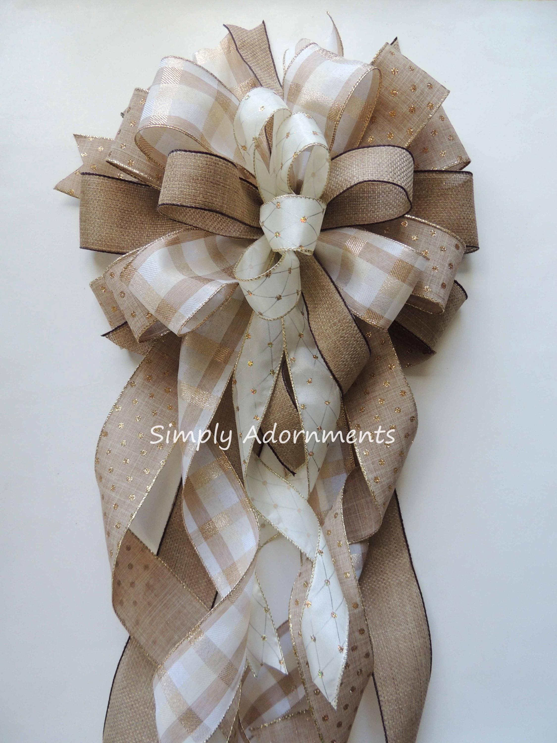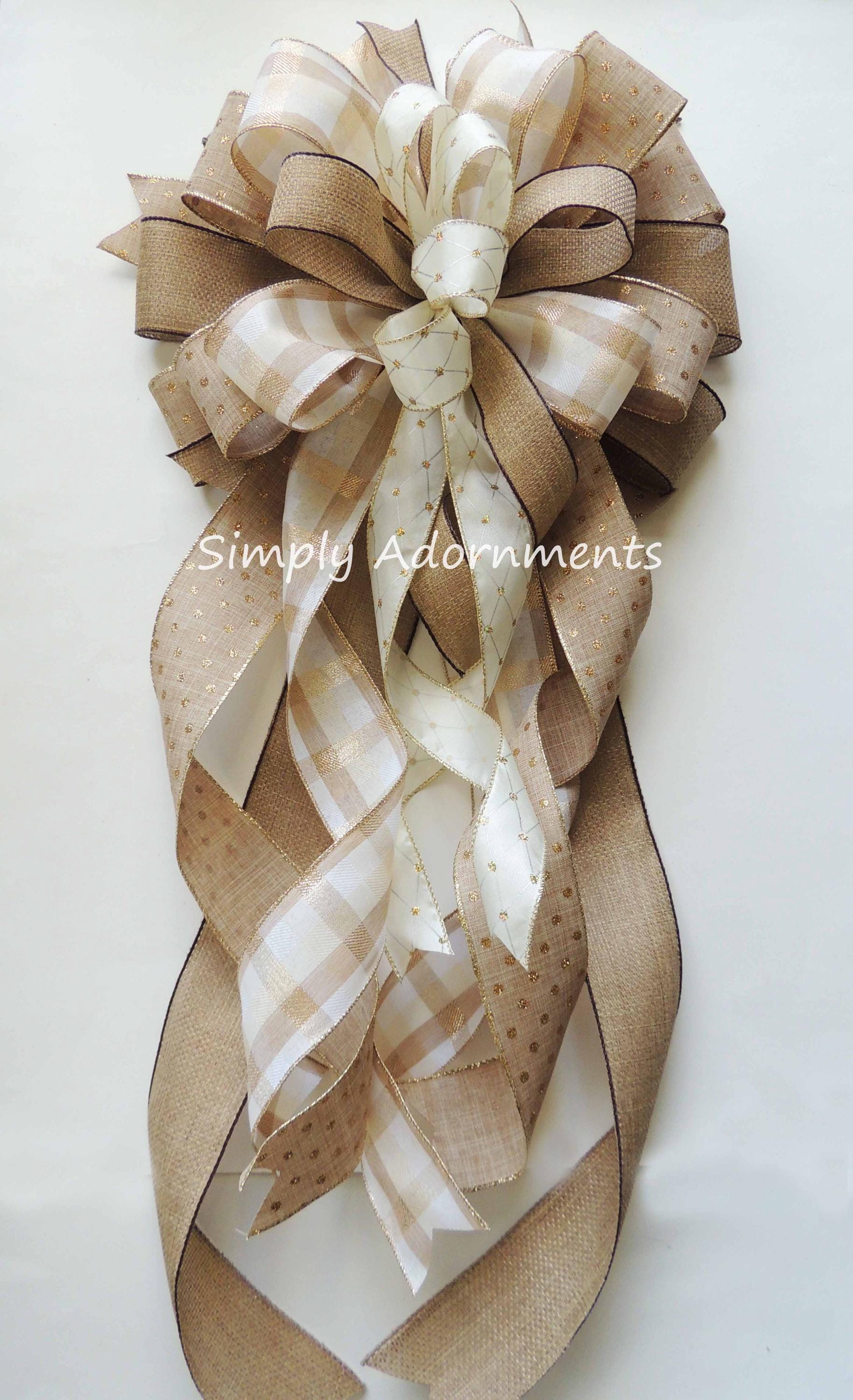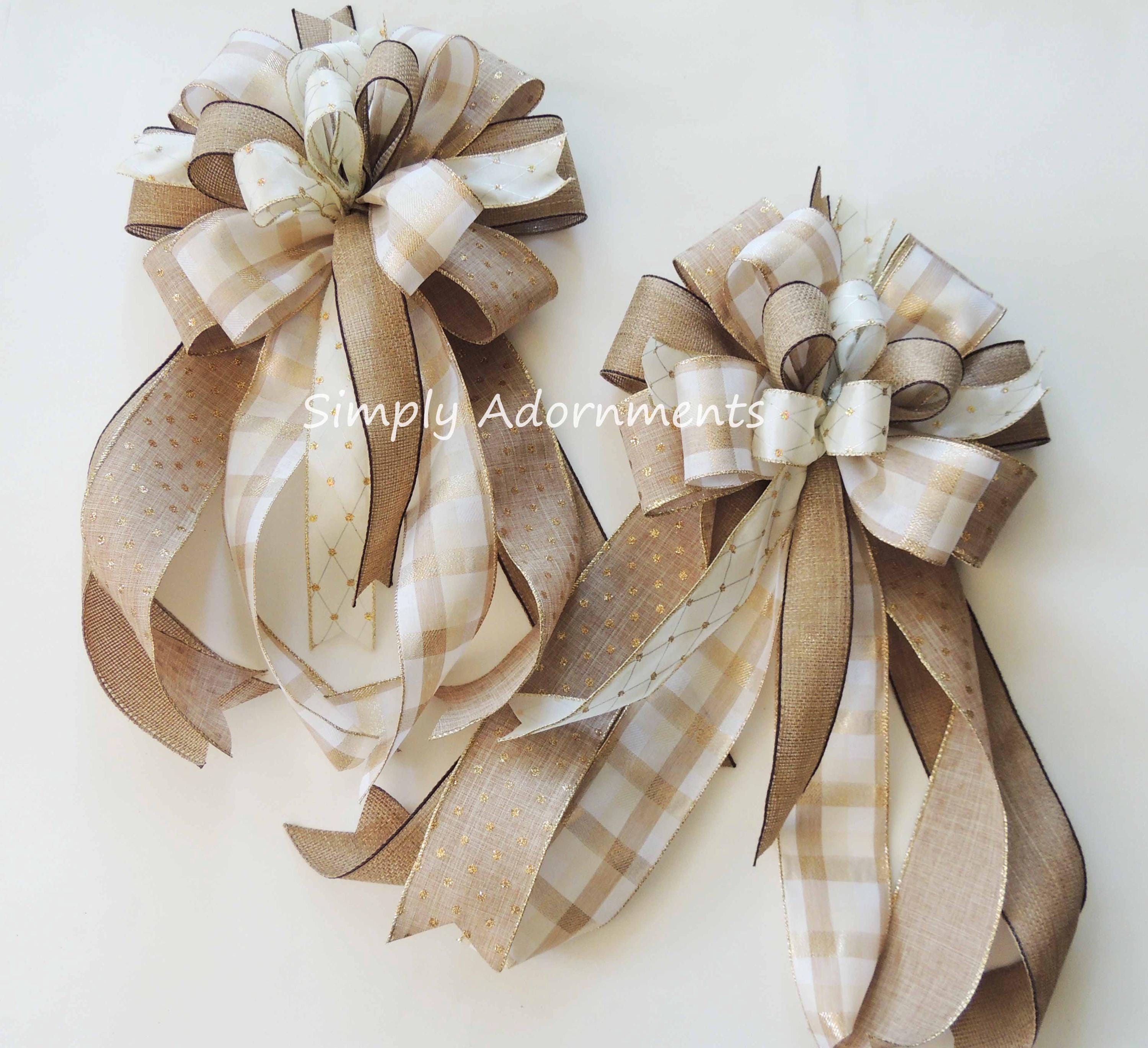 Ivory Tan Christmas Bow, Burlap Ivory Plaid Christmas Bow, Beige Cream Christmas Tree Topper bow, Christmas wreath Bow Christmas Lantern Bow