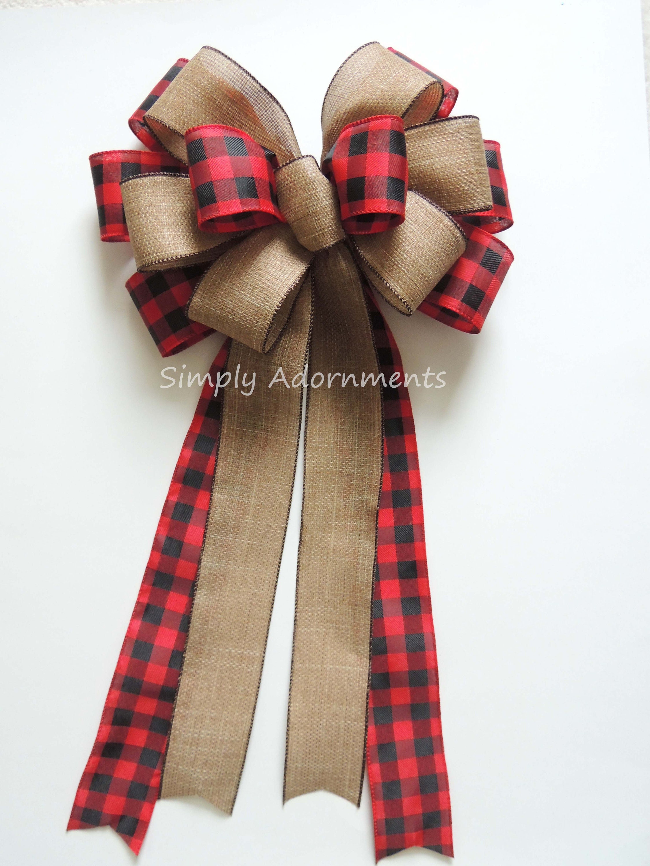This listing is for one large bow of your choice. This bow is made using 2.5" wide buffalo plaid check and faux burlap wire-edged ribbons. This particular bow has 4 tails with two tails of each ribbon. Please select the check/ plaid color and the bow size before checking out.