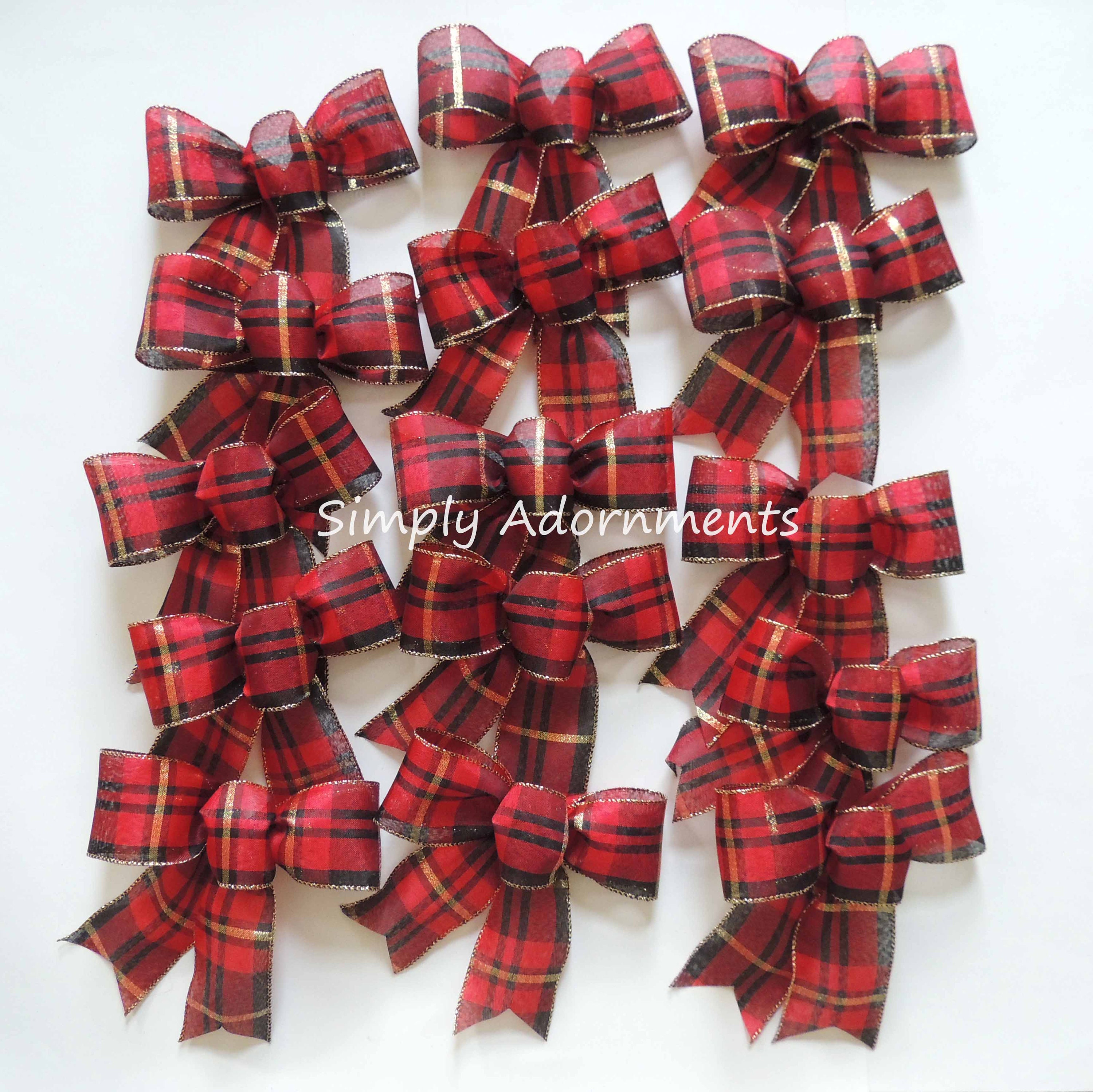 This listing is for 4 handmade Christmas mini bows. Each bow is made using 2.5" red black black check with gold trim wired ribbon. The bow length (L) in this listing is from the top of the bow to the end of the tails. Please select the number of the bows and the bow size before checking out.