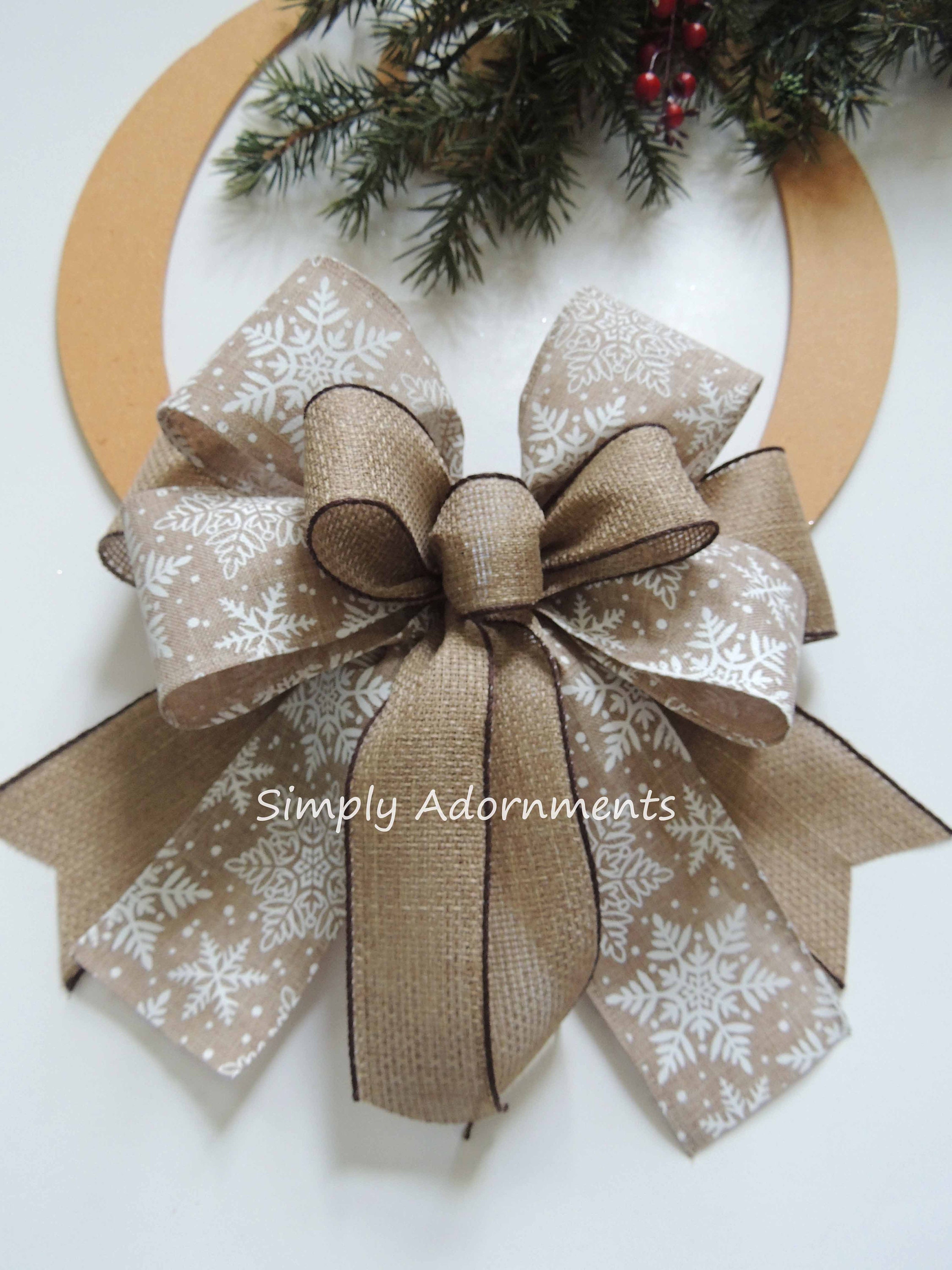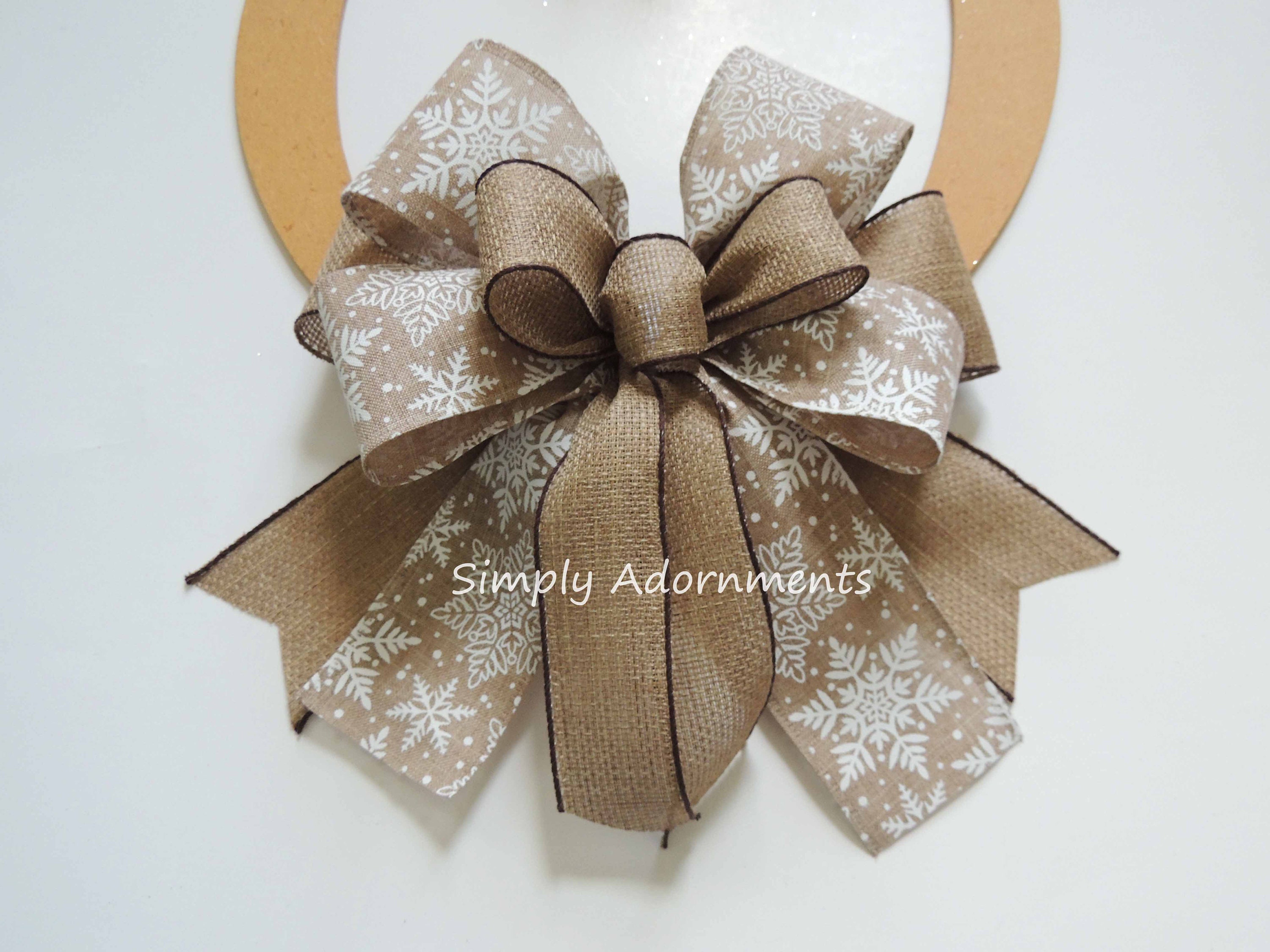 This listing is for a handmade Christmas ornamental / wreath bow. The bow is made using two 2.5" and one 1.5" wired ribbons. They are faux burlap and tan white snowflakes wired ribbons. The bow length (L) is from the top of the bow to the end of the tails. Please select the bow size before checking out.
