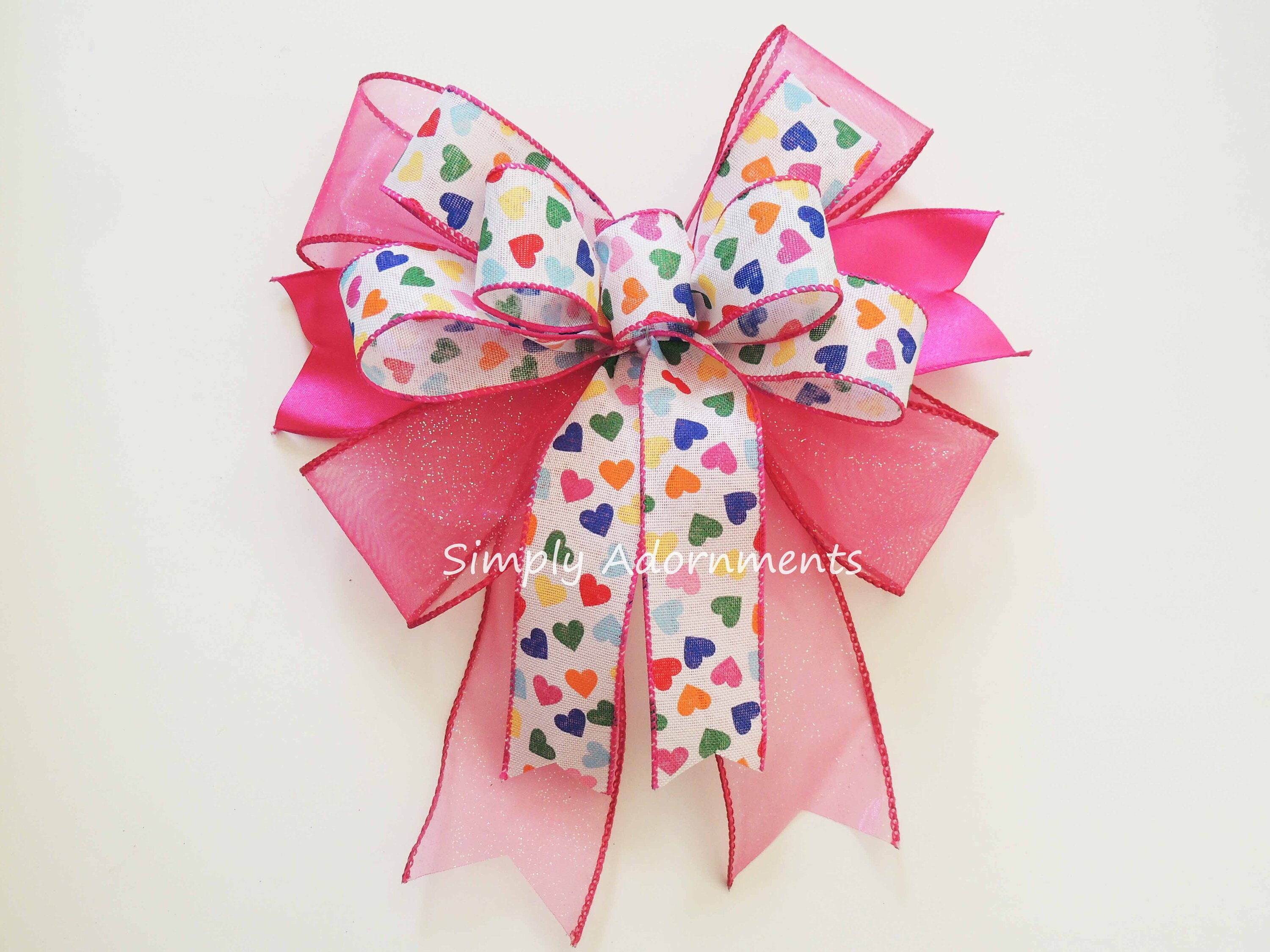 This listing is for a handmade Valentine BOW (S) ONLY, the WOODEN LETTER is NOT INCLUDED. The large bow is made using two 2.5" and one 1.5" wide wired ribbons. Each bow has 4 tails varying in length, measuring from the top of the bow to the end of the tails. Each mini bow is made using 1.5" multi-colored heart wired ribbon. It's 5"W x 5"L . Please select the bow size before checking out.