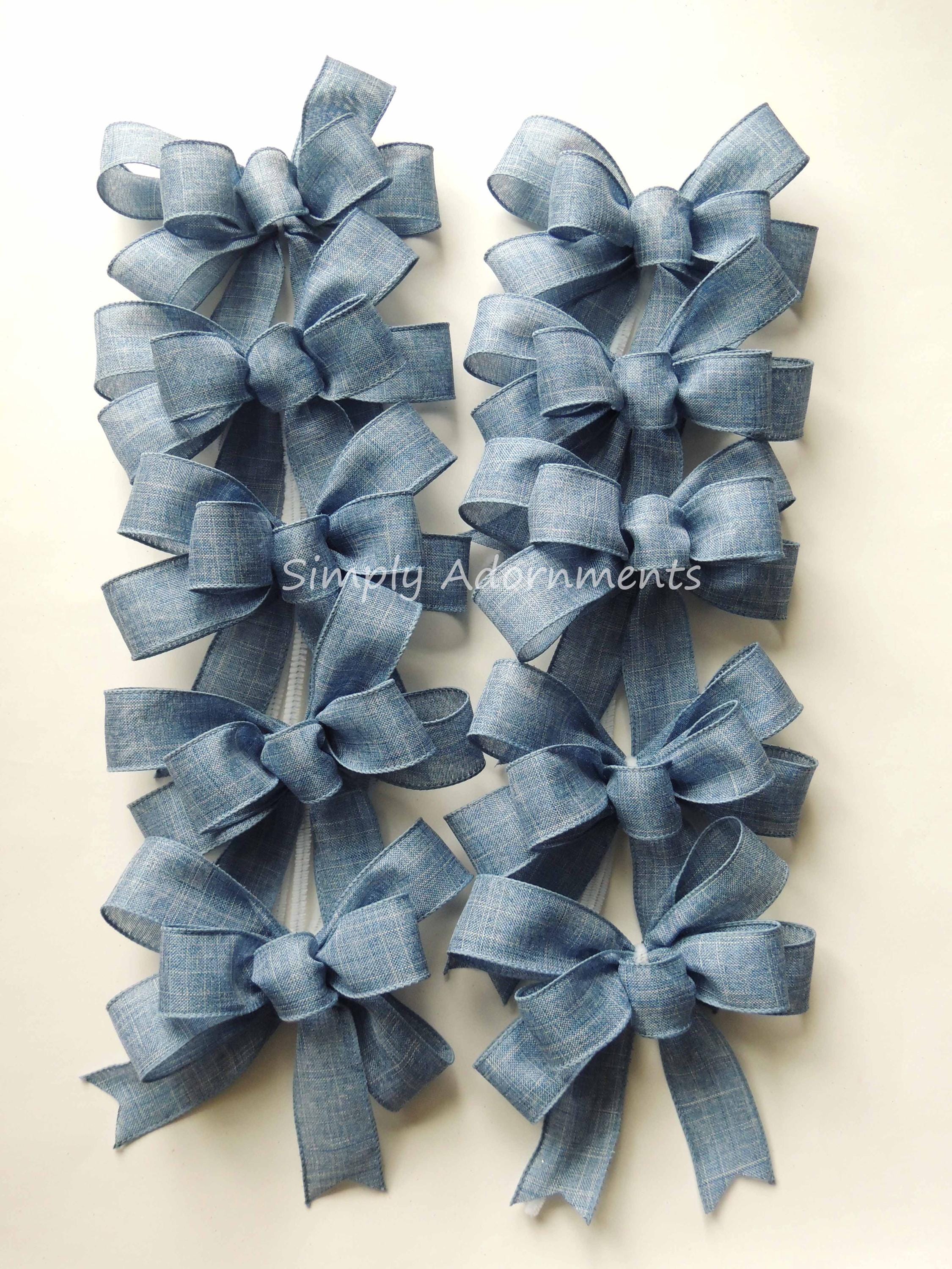 This listing is for 2 handmade mini bows. Each bow is made using 1.5" blue denim linen wired ribbon. The bow length (L) is from the top of the bow to the end of the tails. The bow has chenille stem for easy attachment. Please select the bow size before checking out.