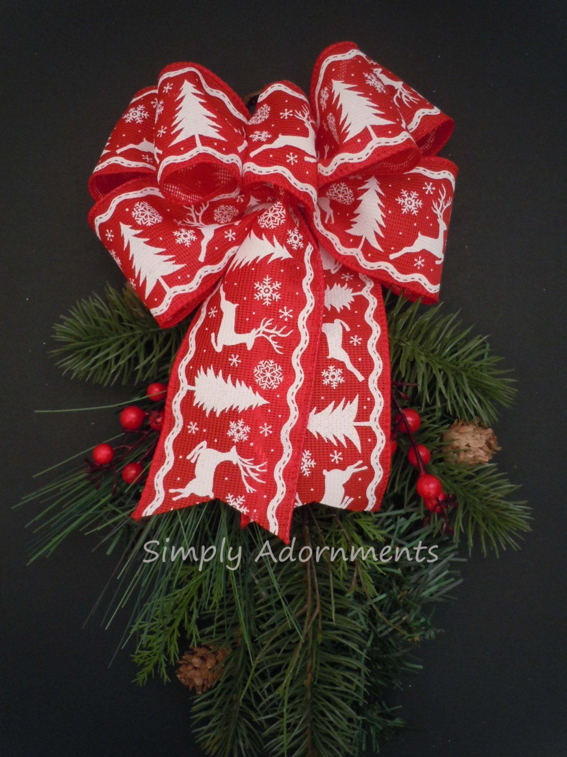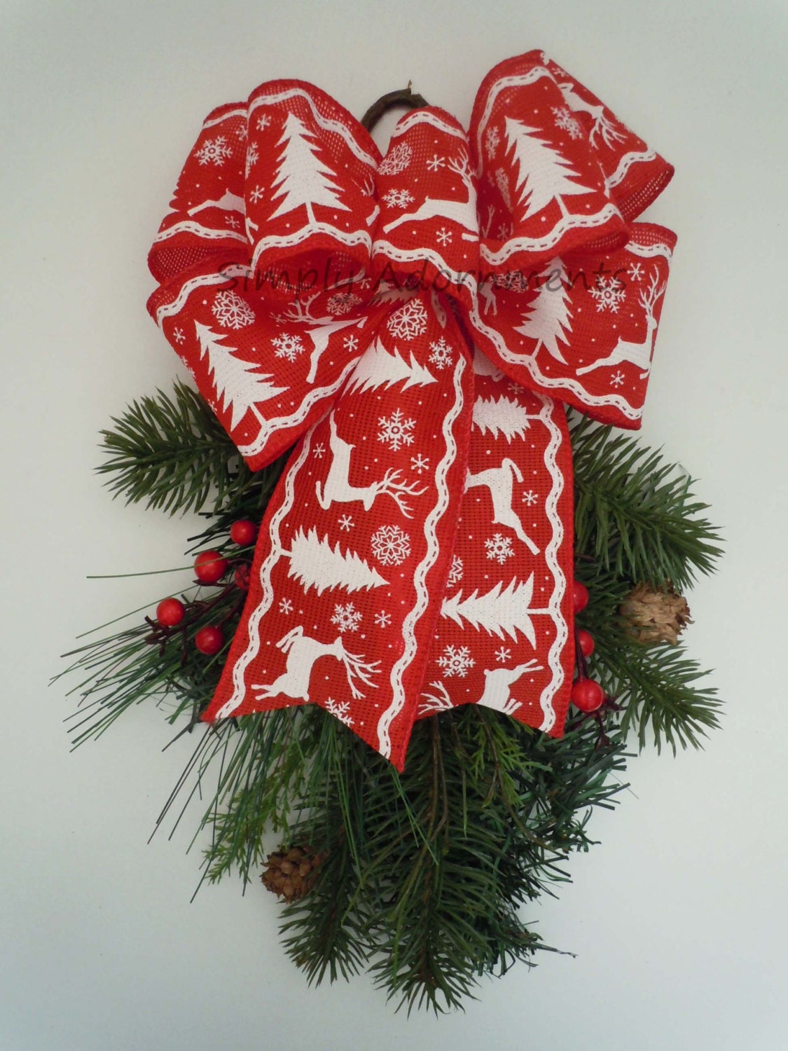 This listing is for a handmade burlap-liked Christmas ornamental / wreath BOW ONLY. The GREENERY and the WOODEN LETTER are NOT INCLUDED. This bow is made using 2.5" wide reindeer and tree burlap-liked wire-edged ribbon. For this particular bow, the bow LENGTH is measured from the top of the bow to the end of the tails. Please select the bow size before checking out.