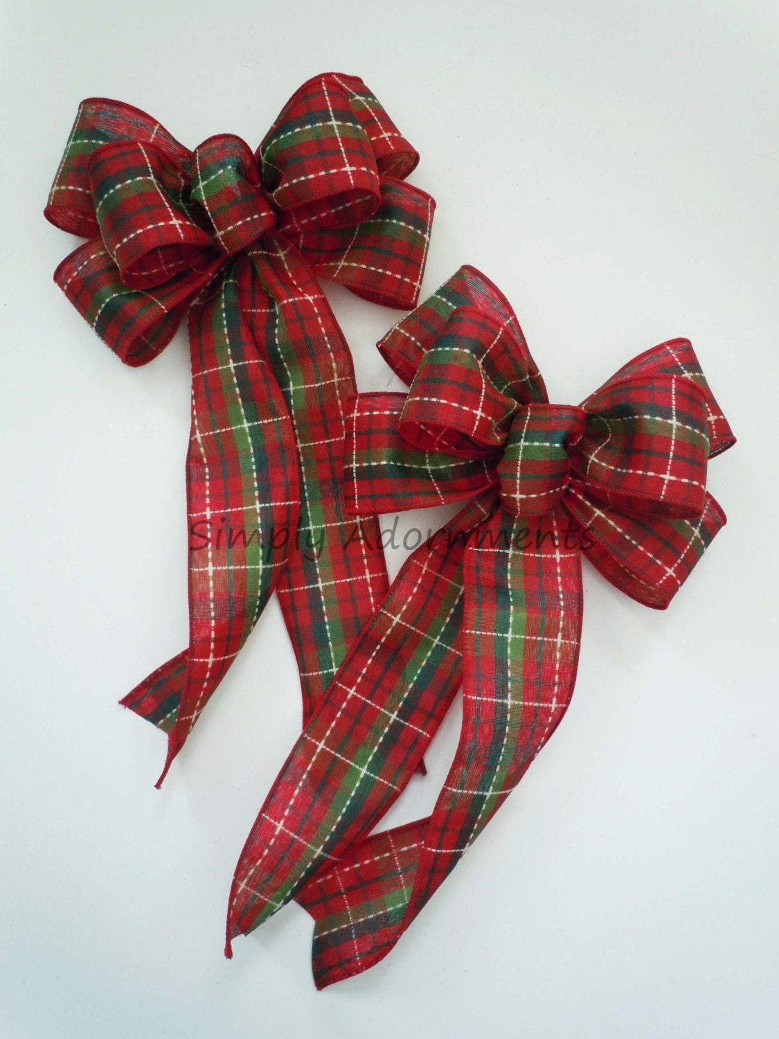 It is made using a 2.5" wide red green ivory plaid ( or red, moss hunter green plaid option) wire-edged ribbon. It's 10" wide and 20"L. The bow length (L) from top of the bow to the end of its tails.