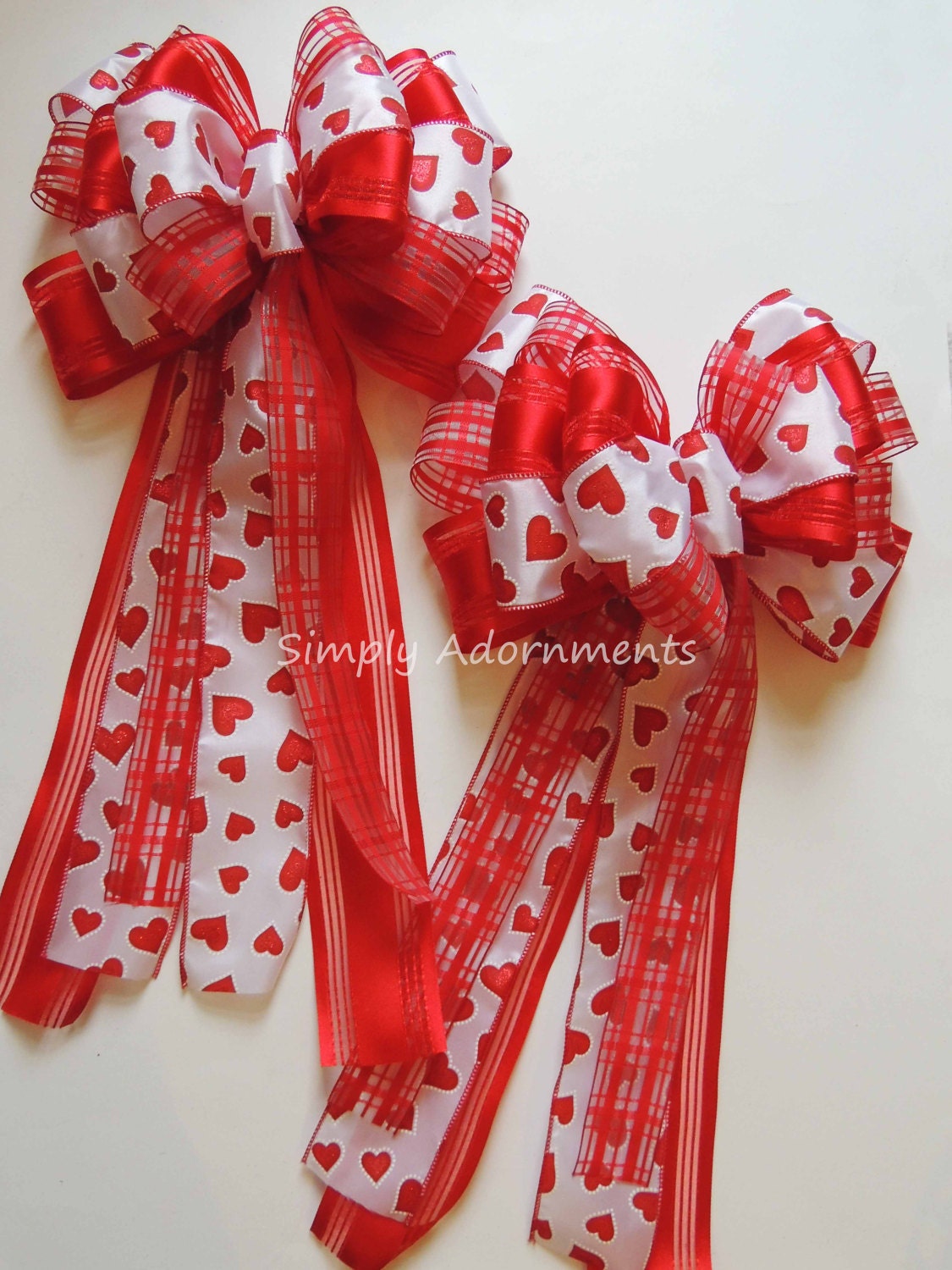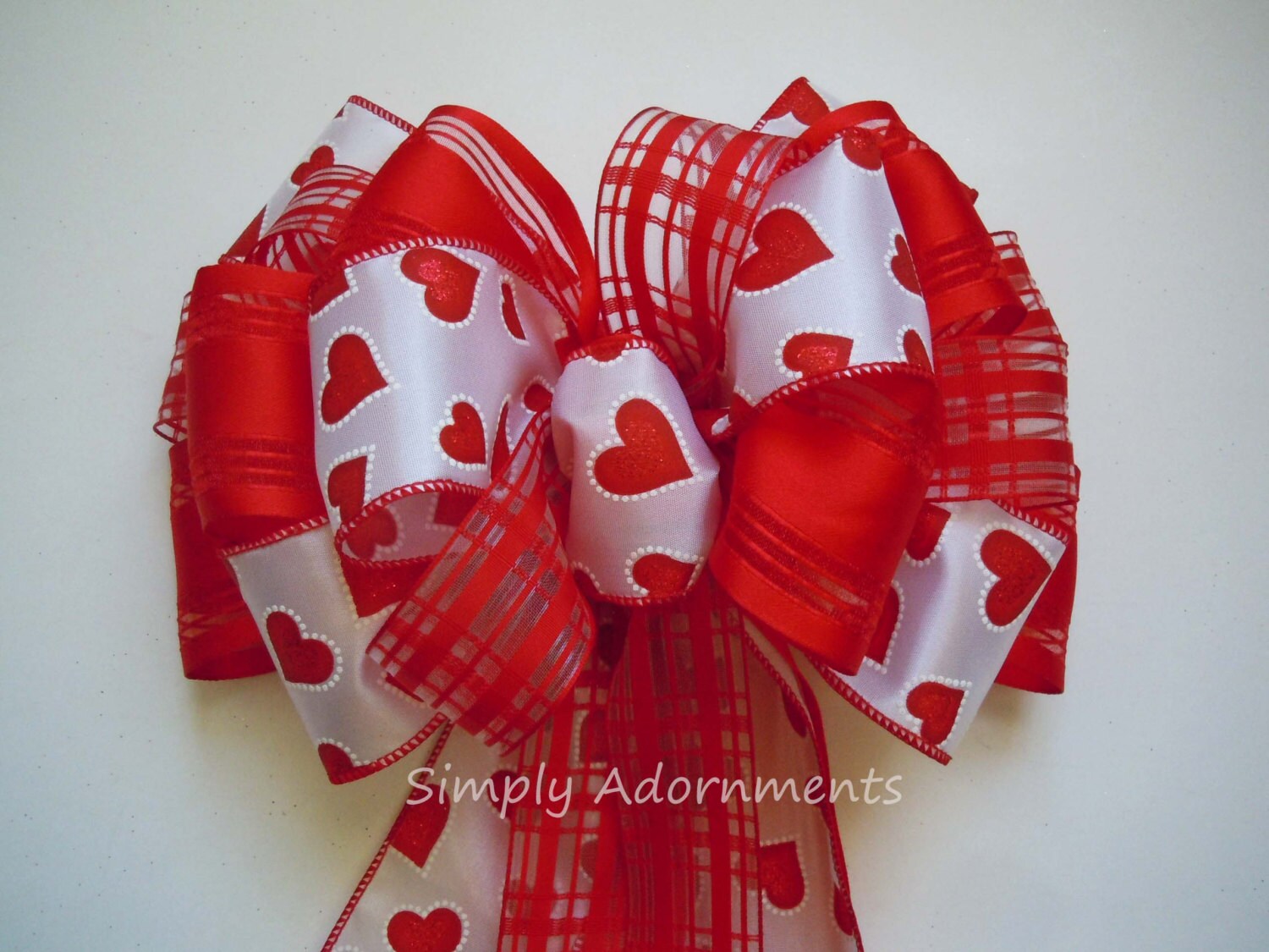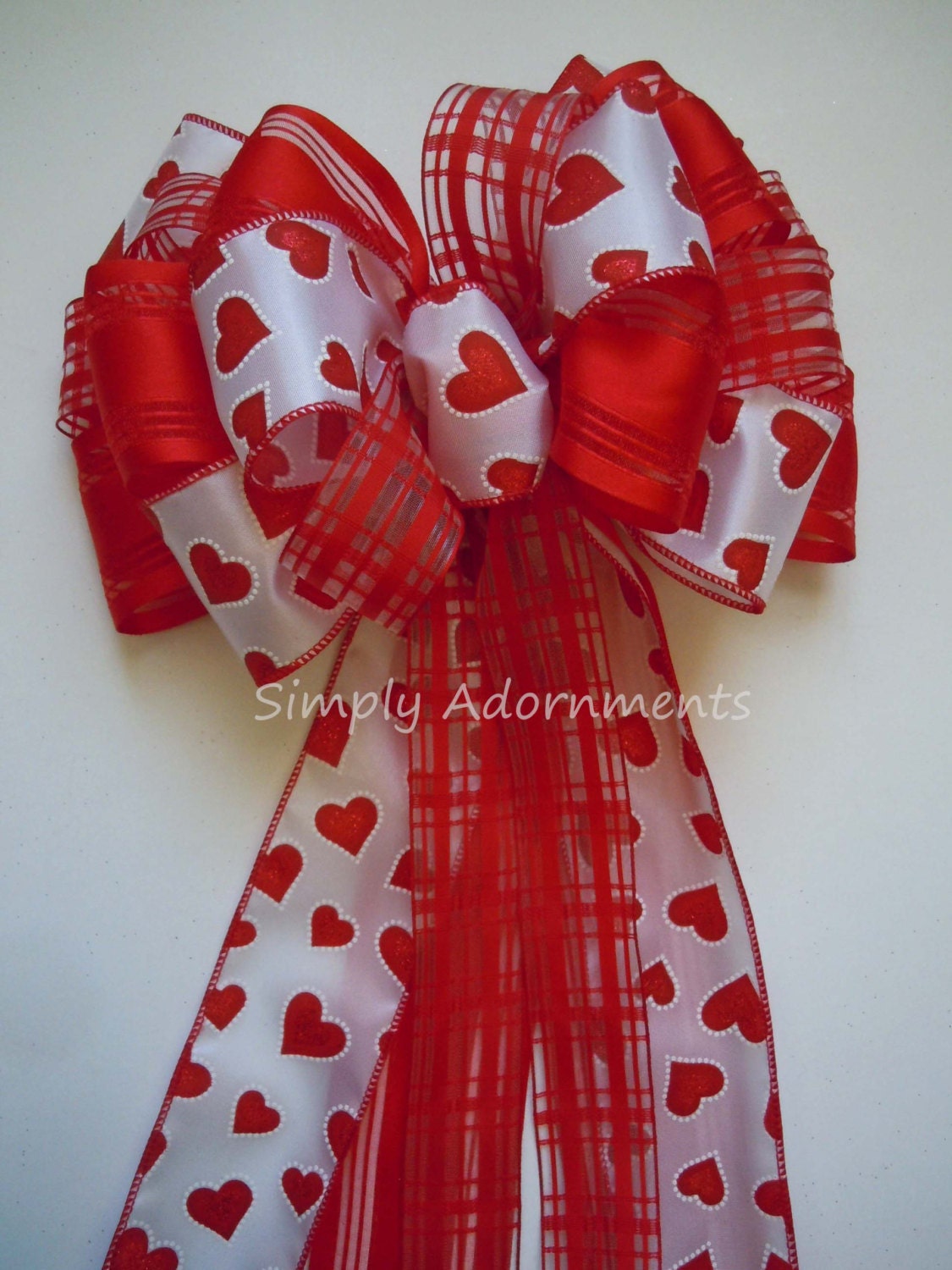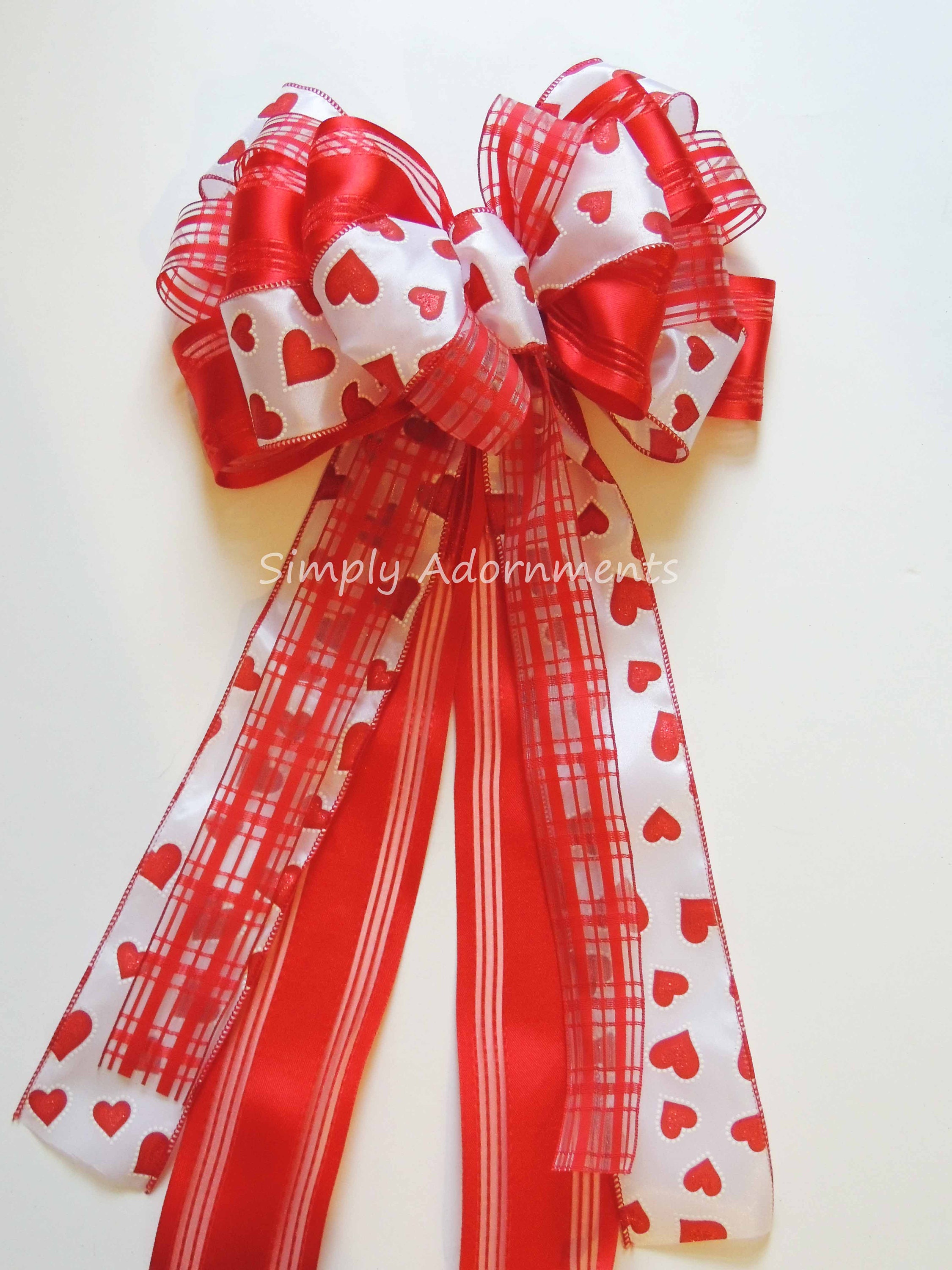 This bow is made using three types of ribbon. One ribbon is a 2.5" red heart on white satin wired ribbon and the second is a 2.5" width red satin with sheer stripes wired ribbon; And the third ribbon is 1.5" width red plaid sheer wired ribbon. It's 10"wide and 20-22" long. The bow has 6 varying streamers, two of each type of ribbons, with length measuring from the top of the bow to the end of the streamers.