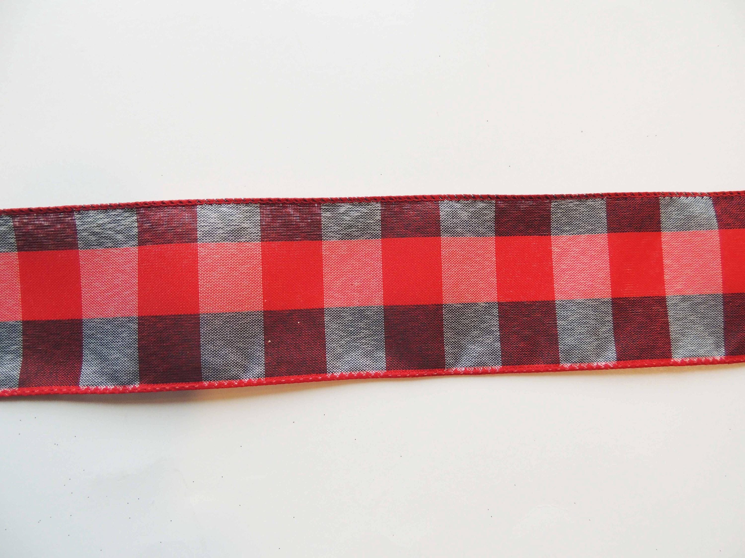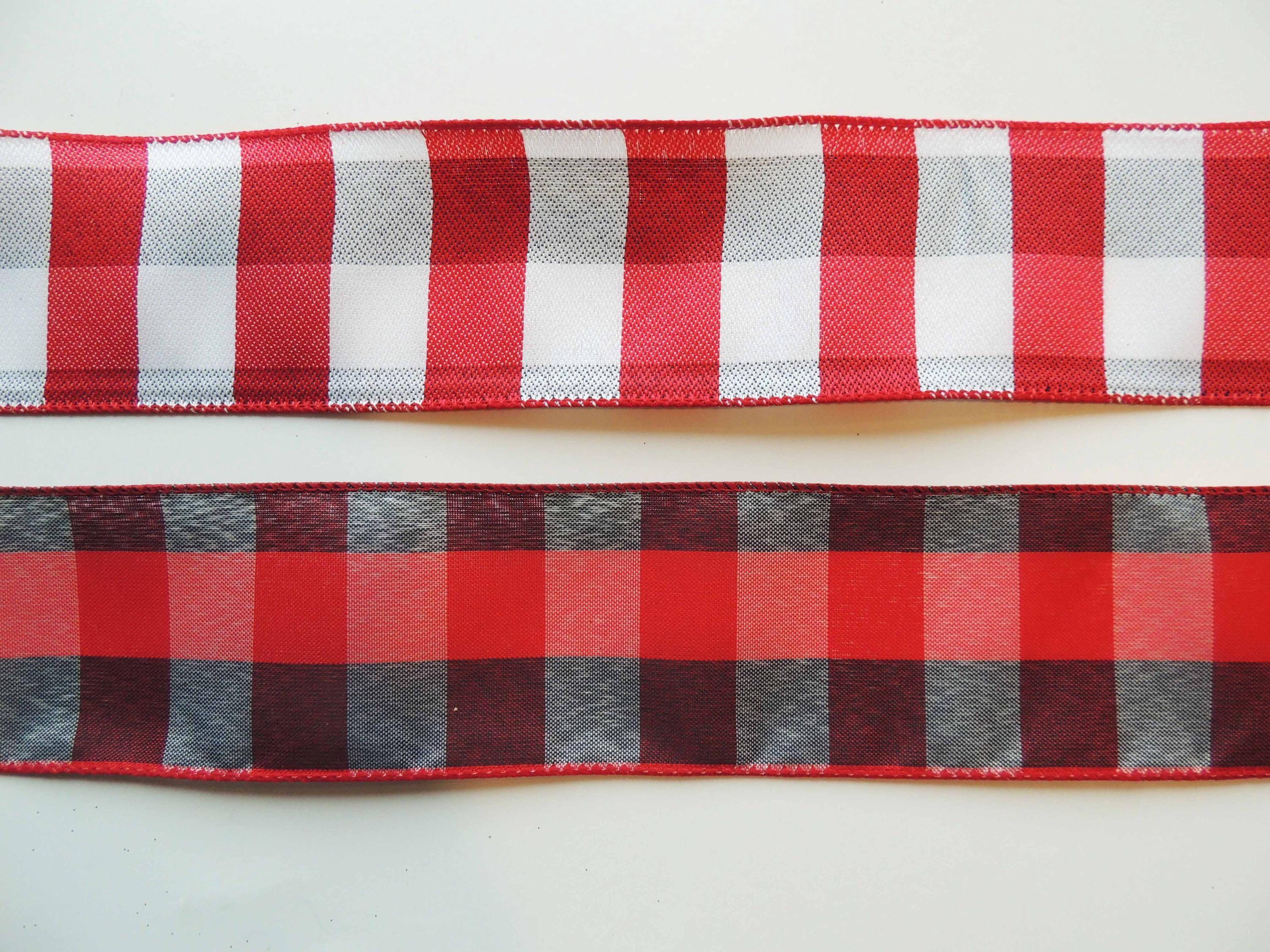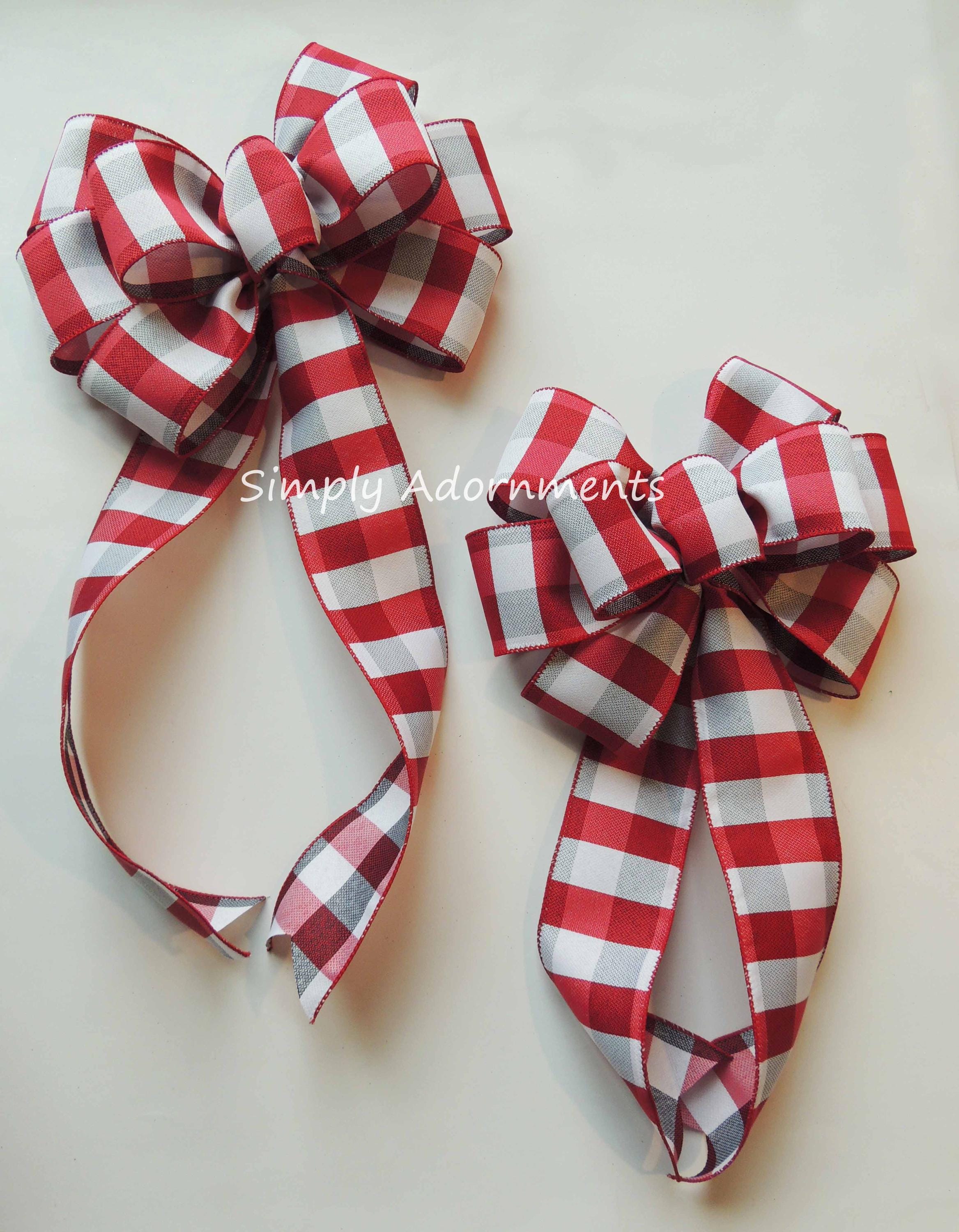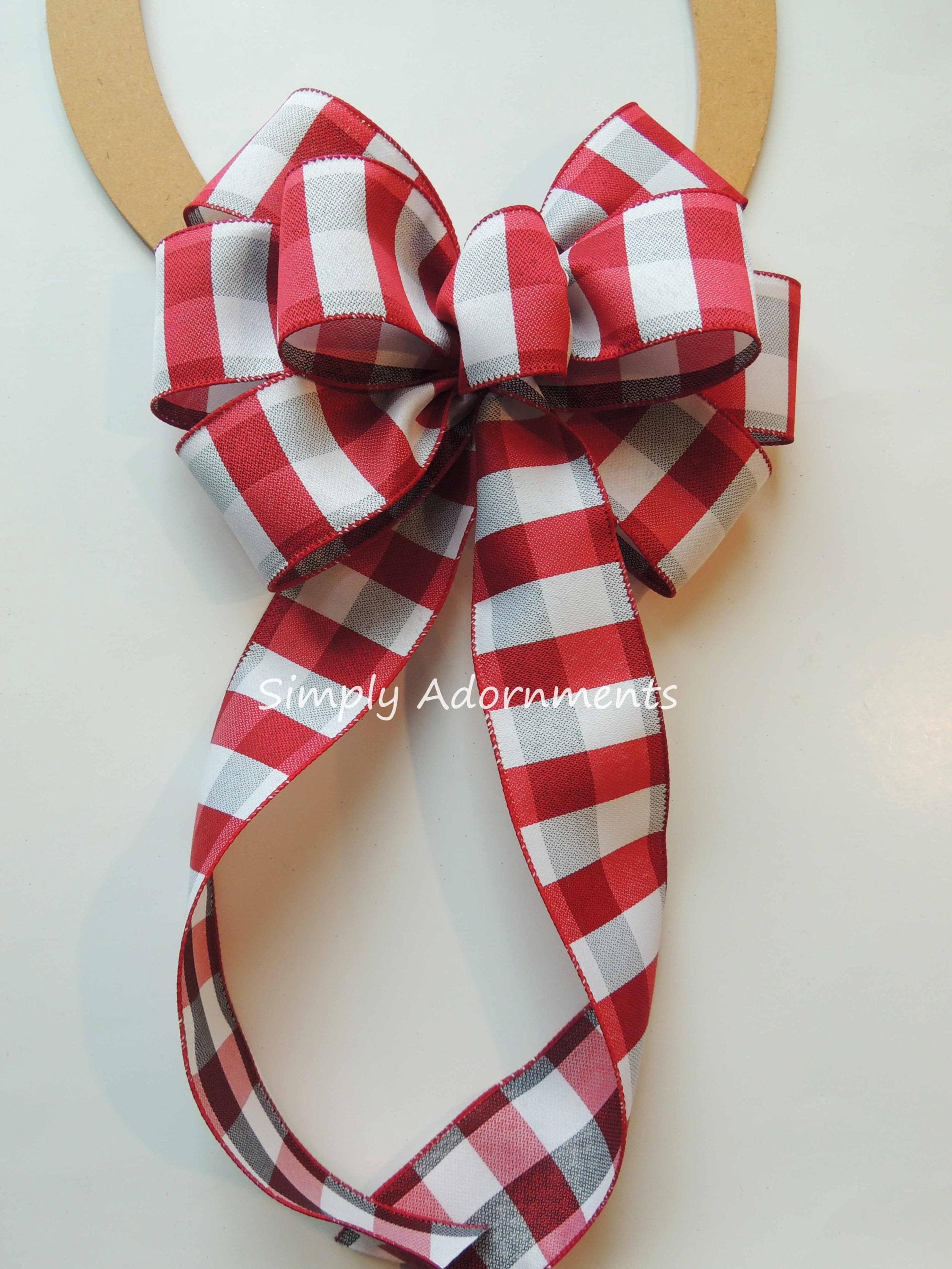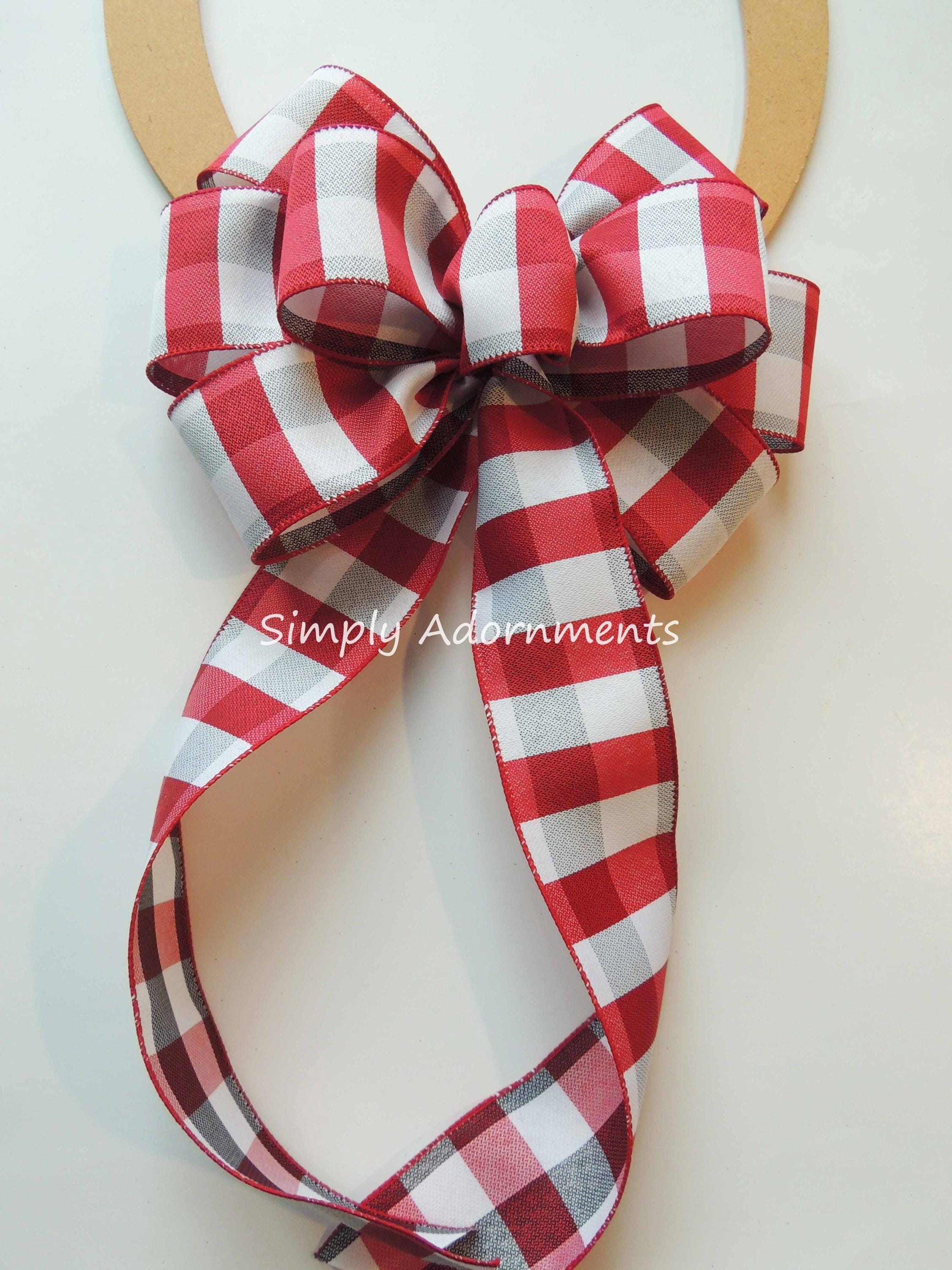This bow is made using 2.5" wide red white & light grey check wired ribbon. The bow length is measured from the top of the bow to the end of the tails. Please select the bow size and the ribbon choice before checking out.