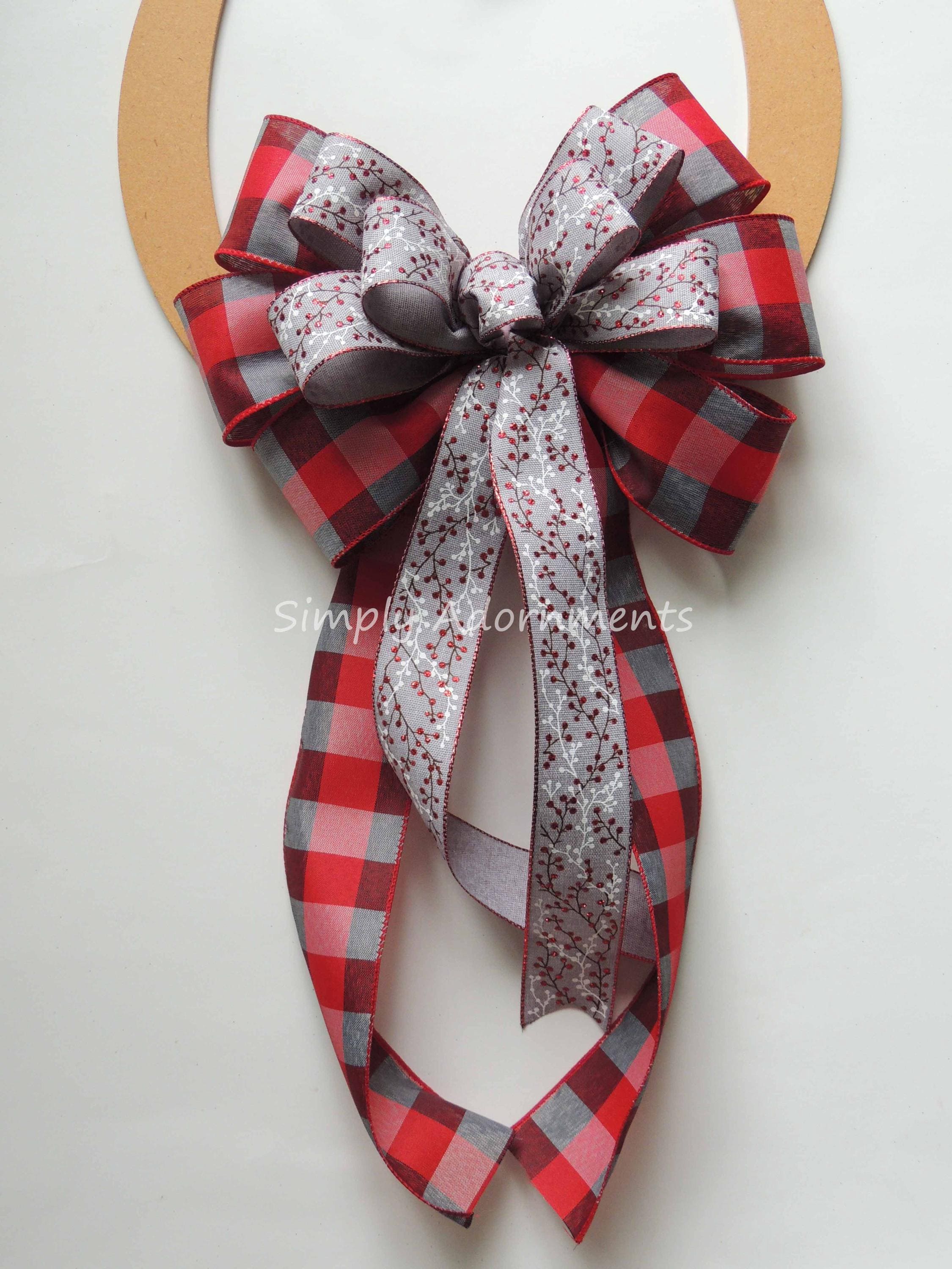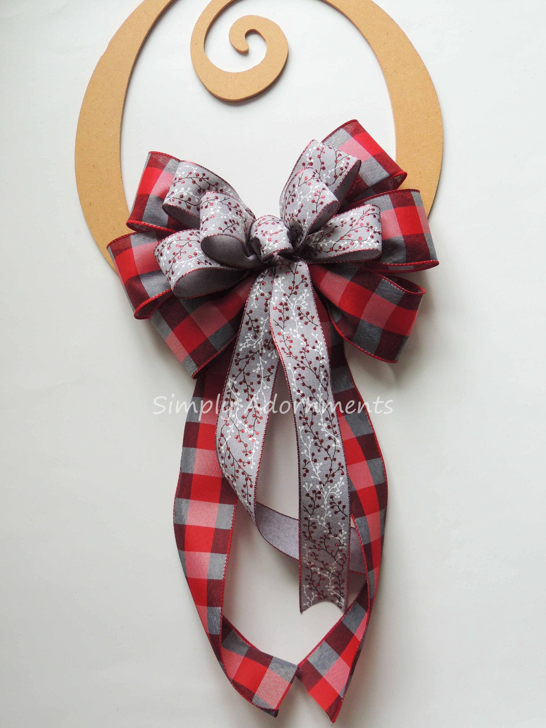Red Grey Farmhouse Bow, Buffalo check Christmas Bow, Winter Berries Decor, Wreath Accent, Tree topper
