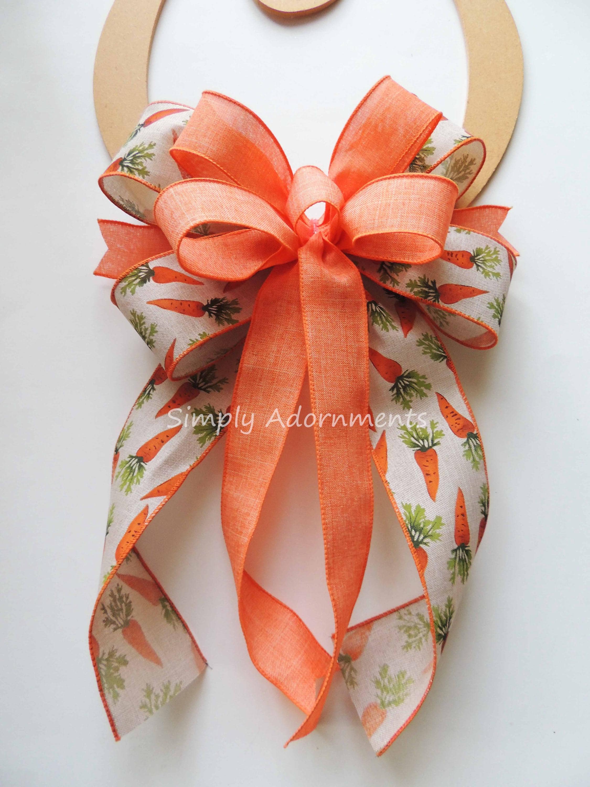 This rustic natural tan Easter bow is made of 2.5" wired white bunny & carrot pattern on natural linen and a 1.5" solid orange linen wired ribbond. The bow length(L) is from top of the bow to the end of it tails. Please select the bow size before checking out.
