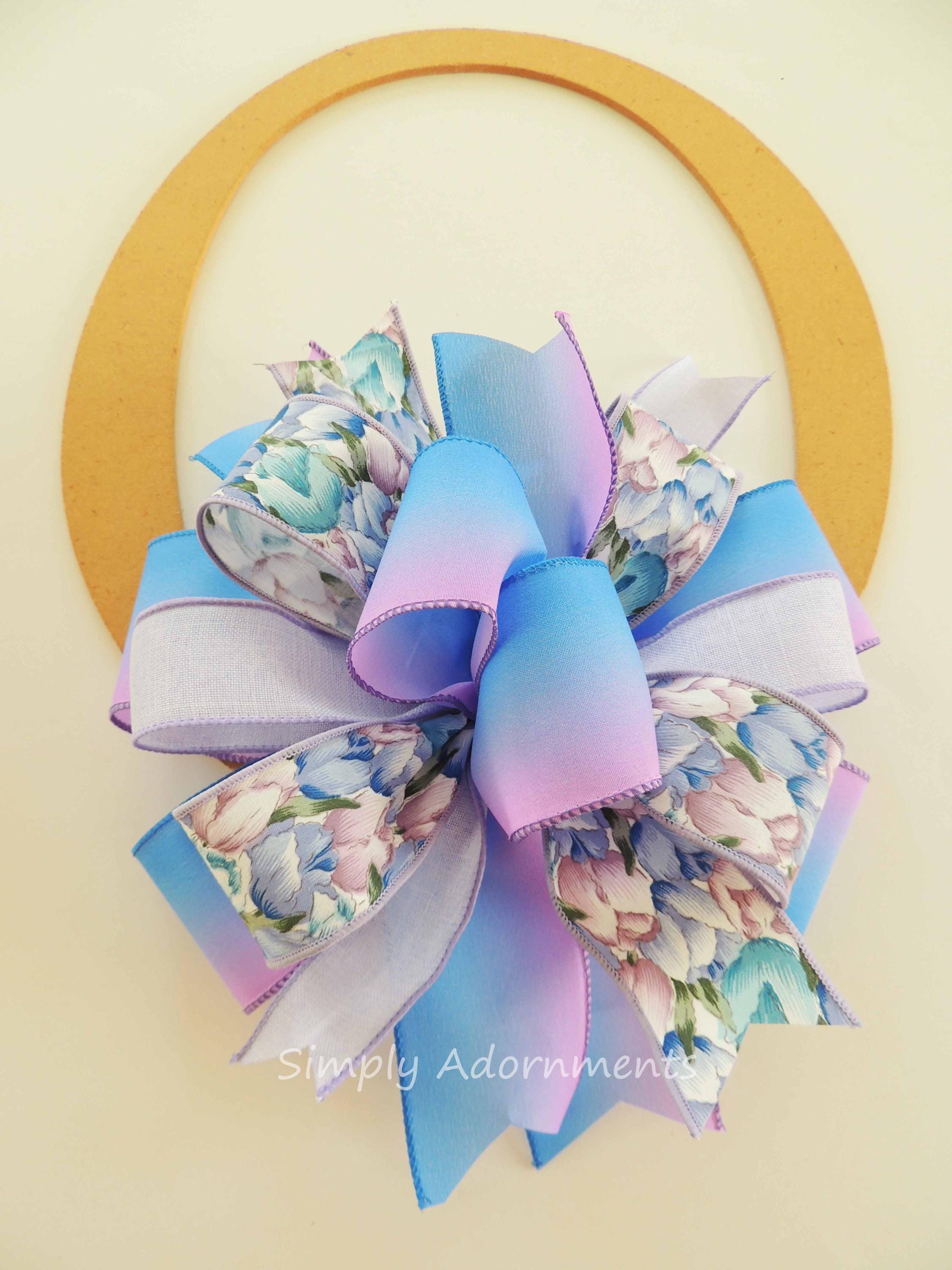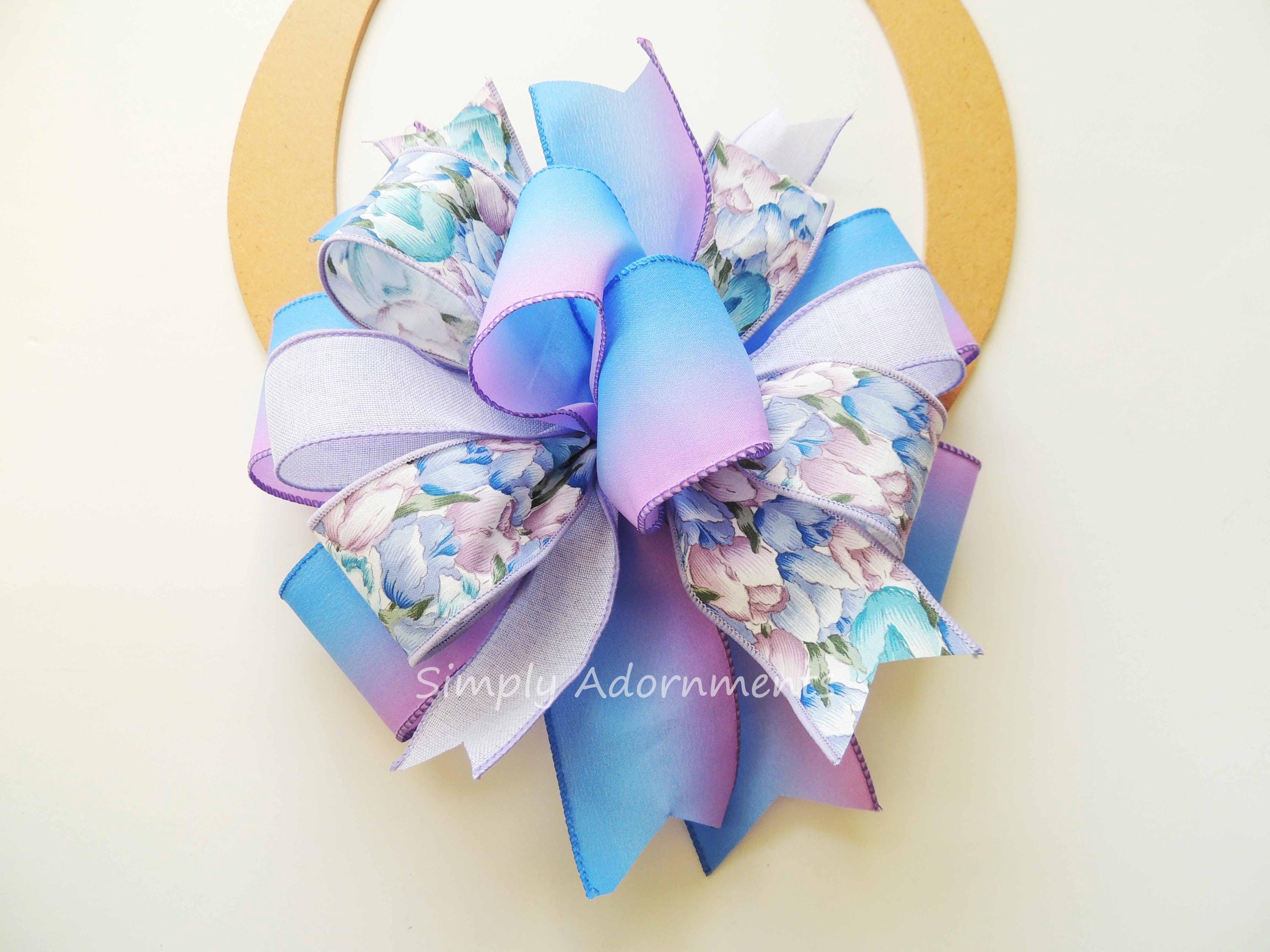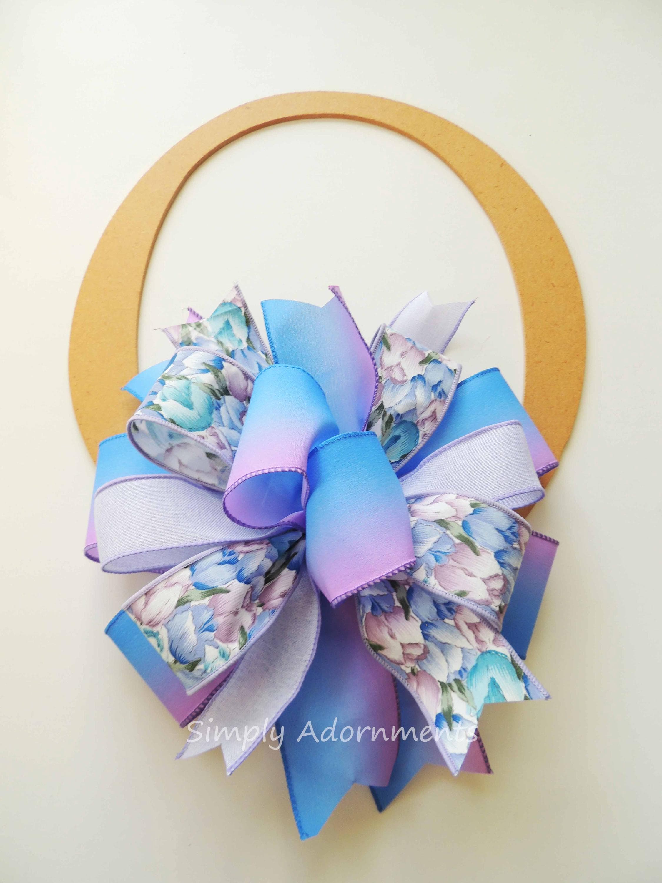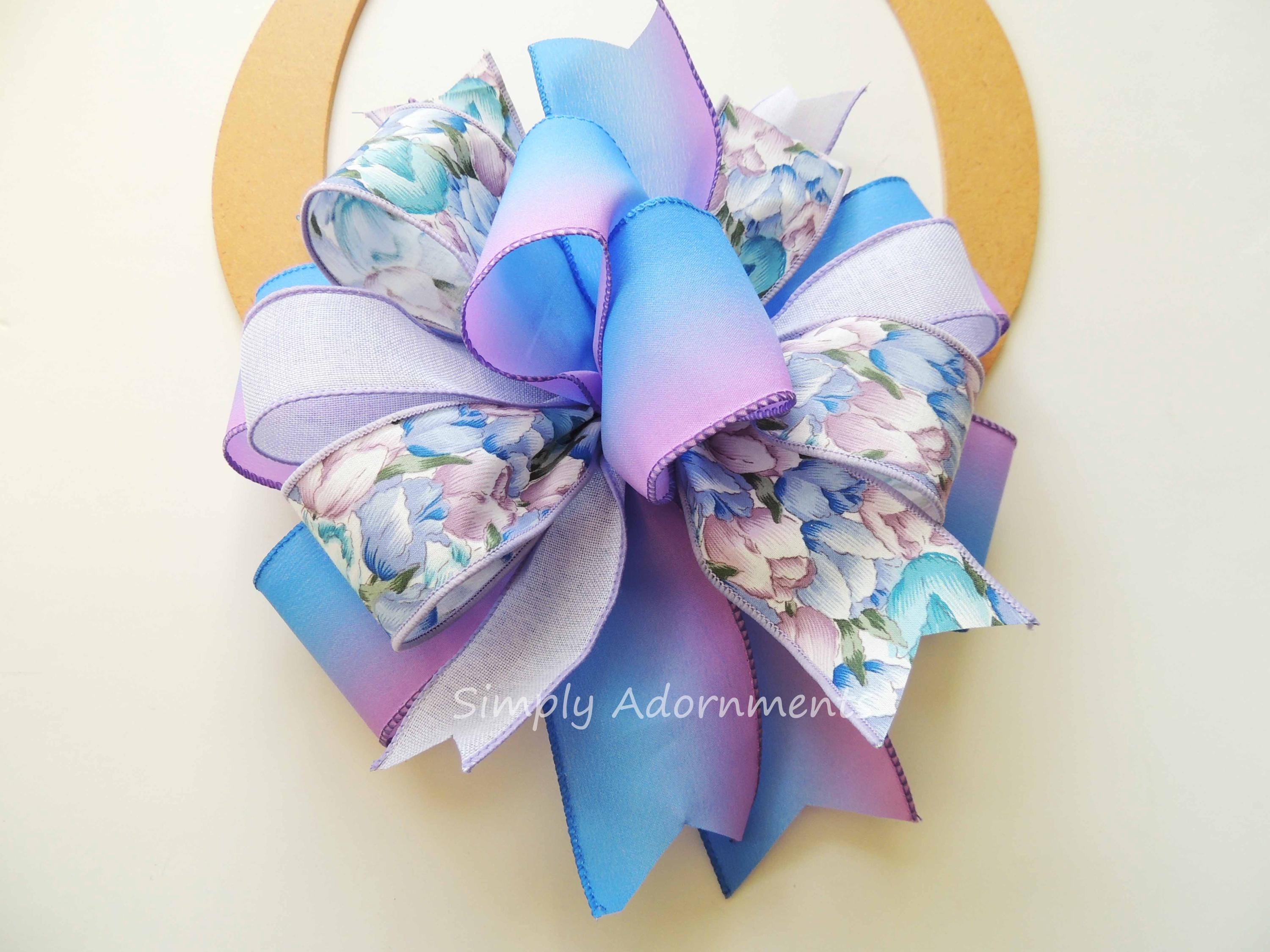 This spring blue purple tulip bow is created using three beautiful wired ribbons. The ribbons are 2.5" and 1.5" in width wire-edged ribbons. This particular bow is 10-10.5" wide and 11" long. The bow length (L) is from top of the bow to the end of its tails. The bow is securely tied with florist wires and finished with chenille stem for easy attachment.