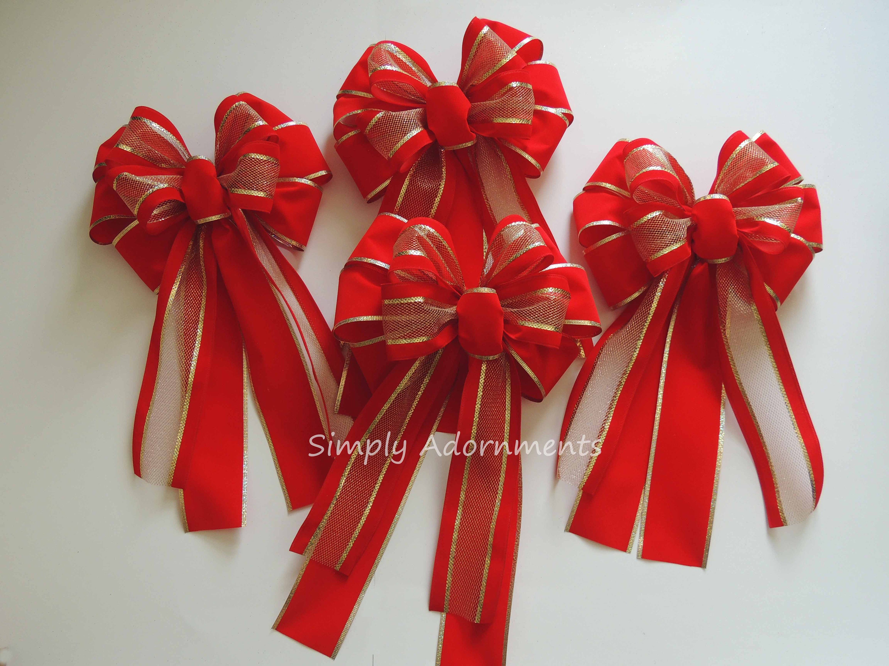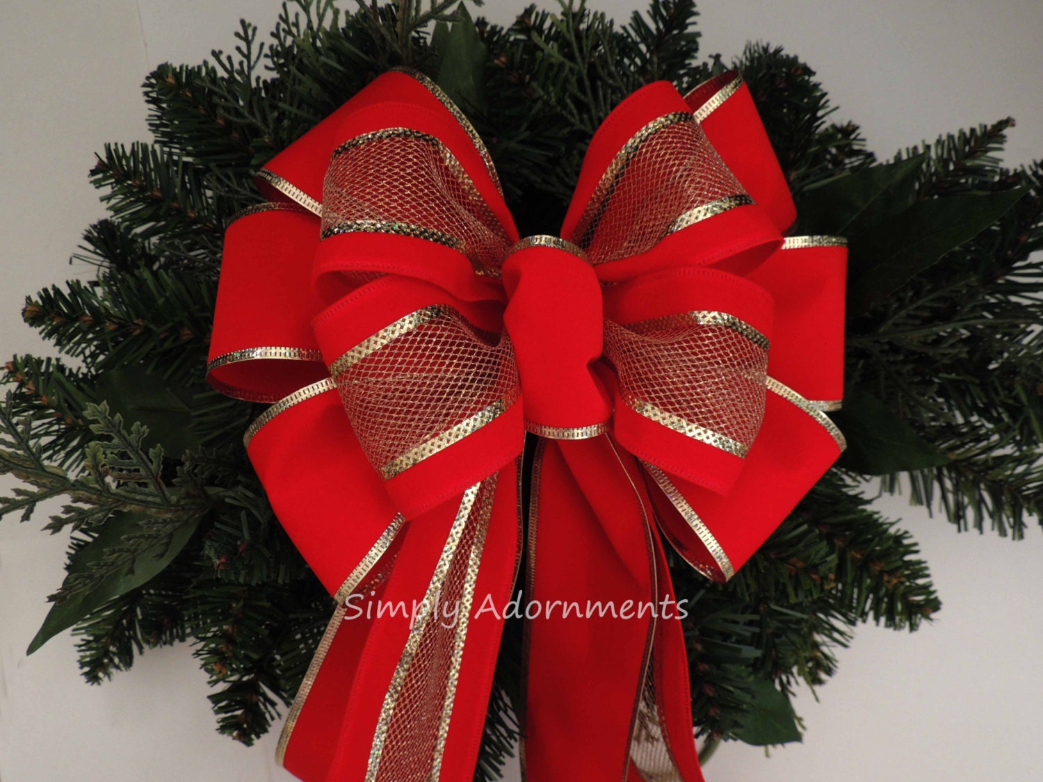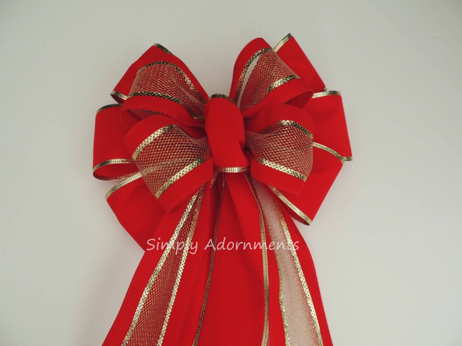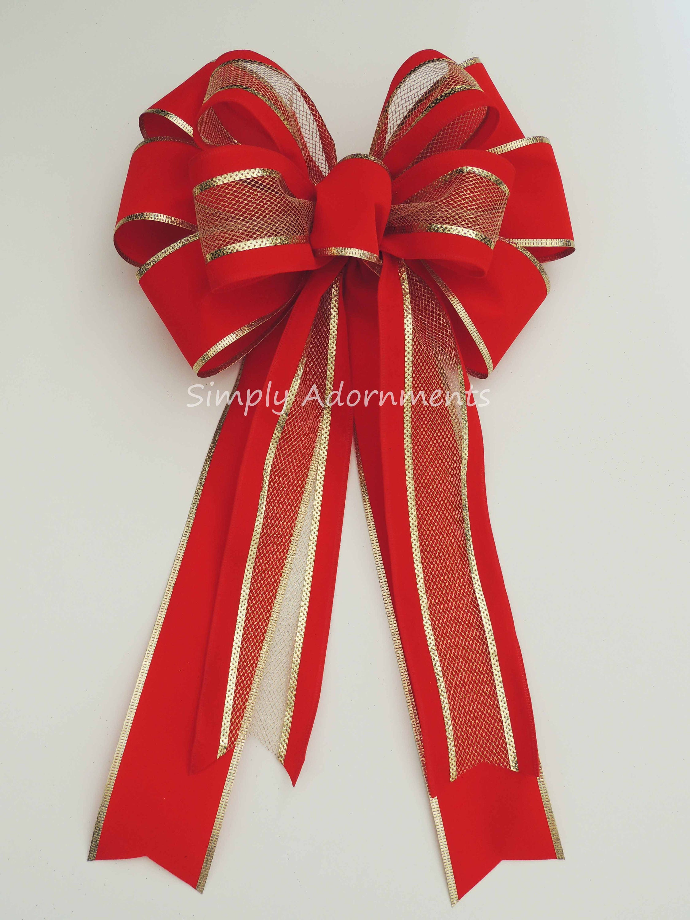 Red Gold Christmas Bow, Red Velvet Christmas Wreath Bow, Red Gold Christmas Tree Bow, Door Bow, Christmas Swag Bow, Christmas Gift Bow
