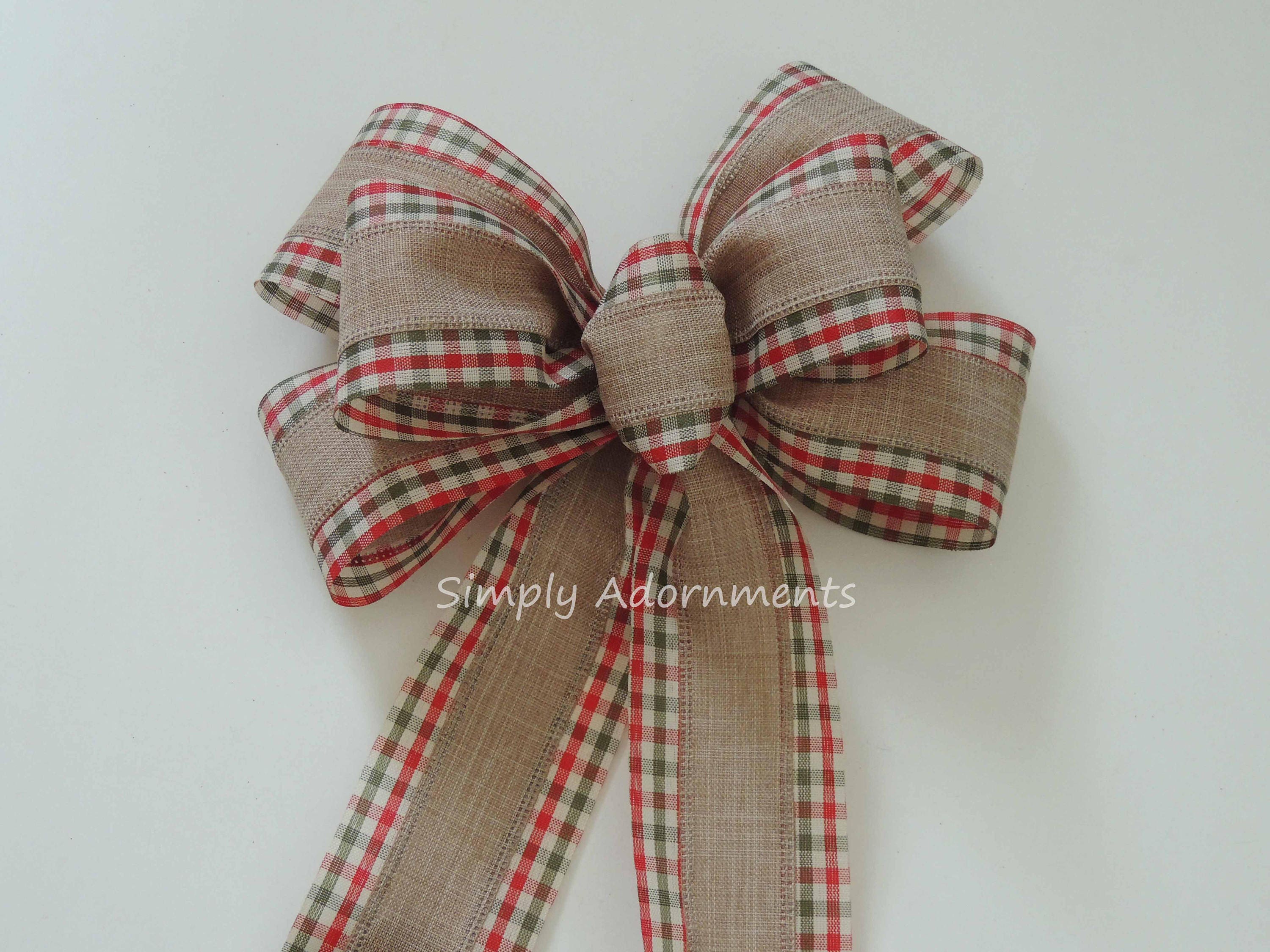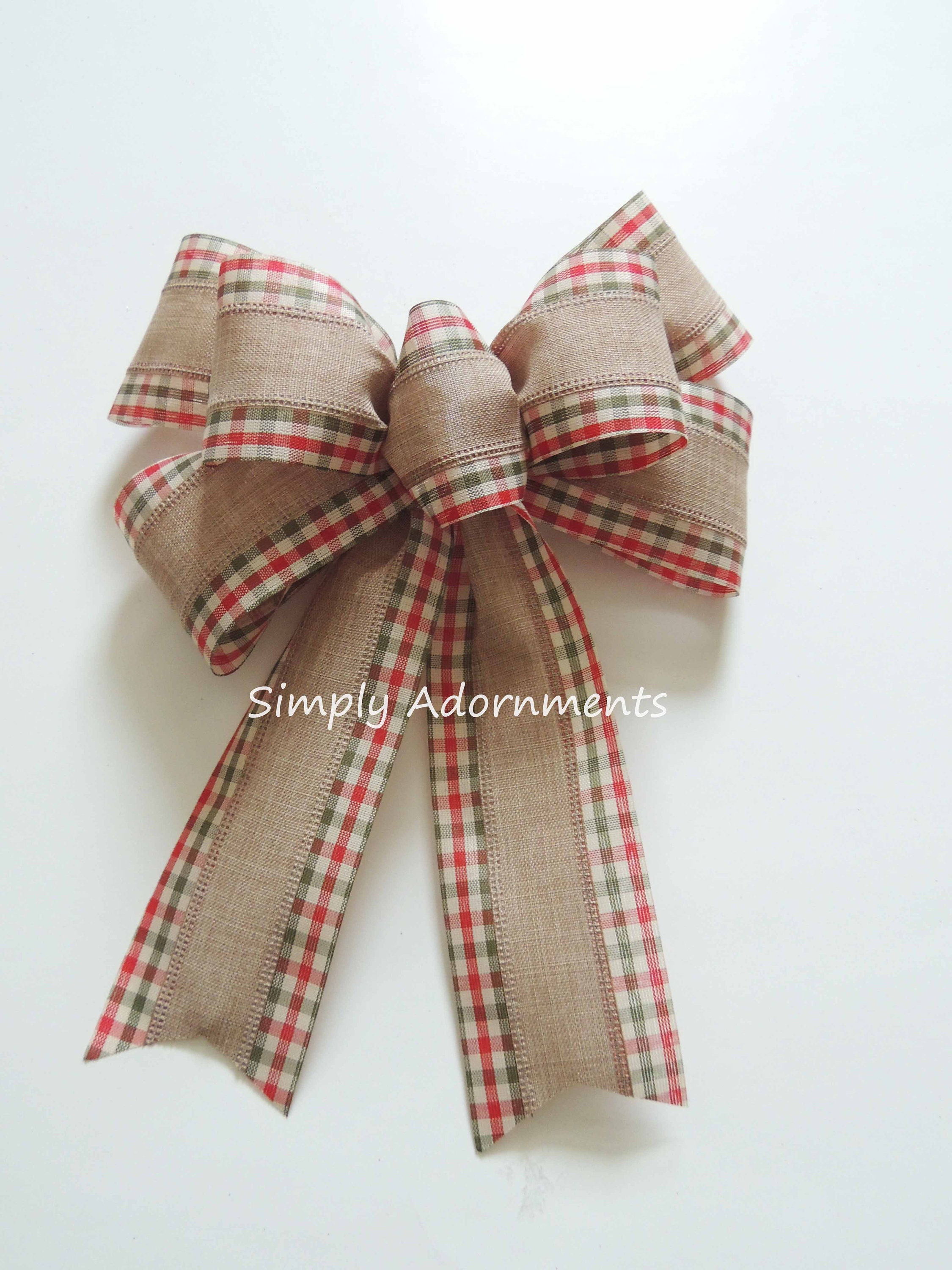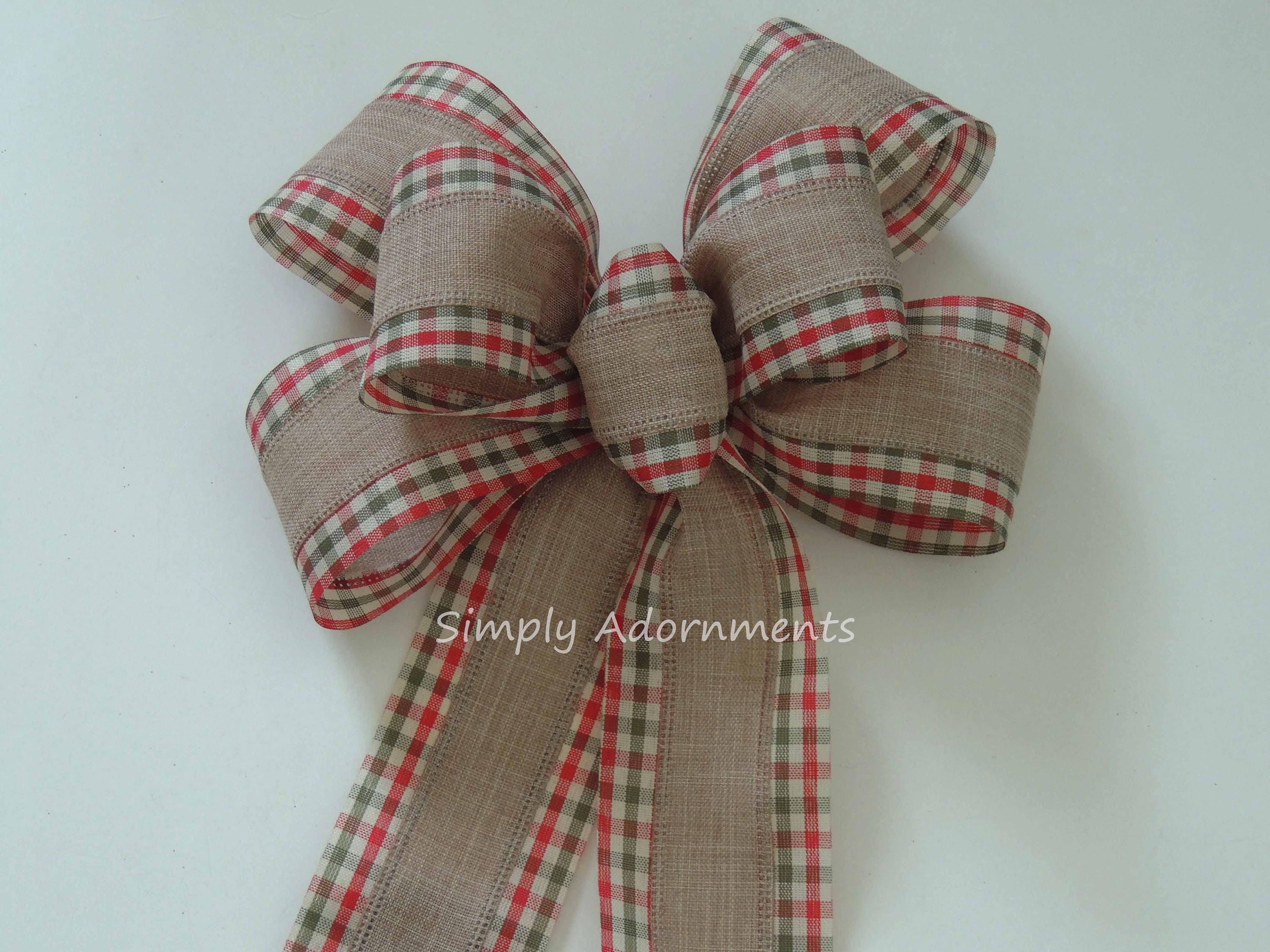 This bow is made using 2.5" wide tan with red green check edged wired ribbon. The bow measures approximately 8" across and 10" long, measuring from the top of the bow to the end of the tails. Please select the ribbon choice before checking out.