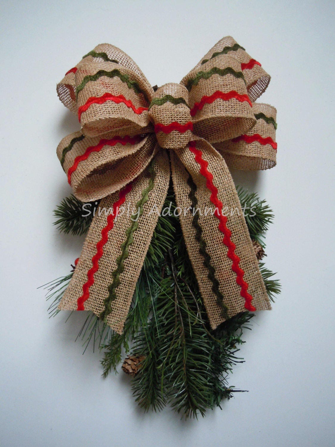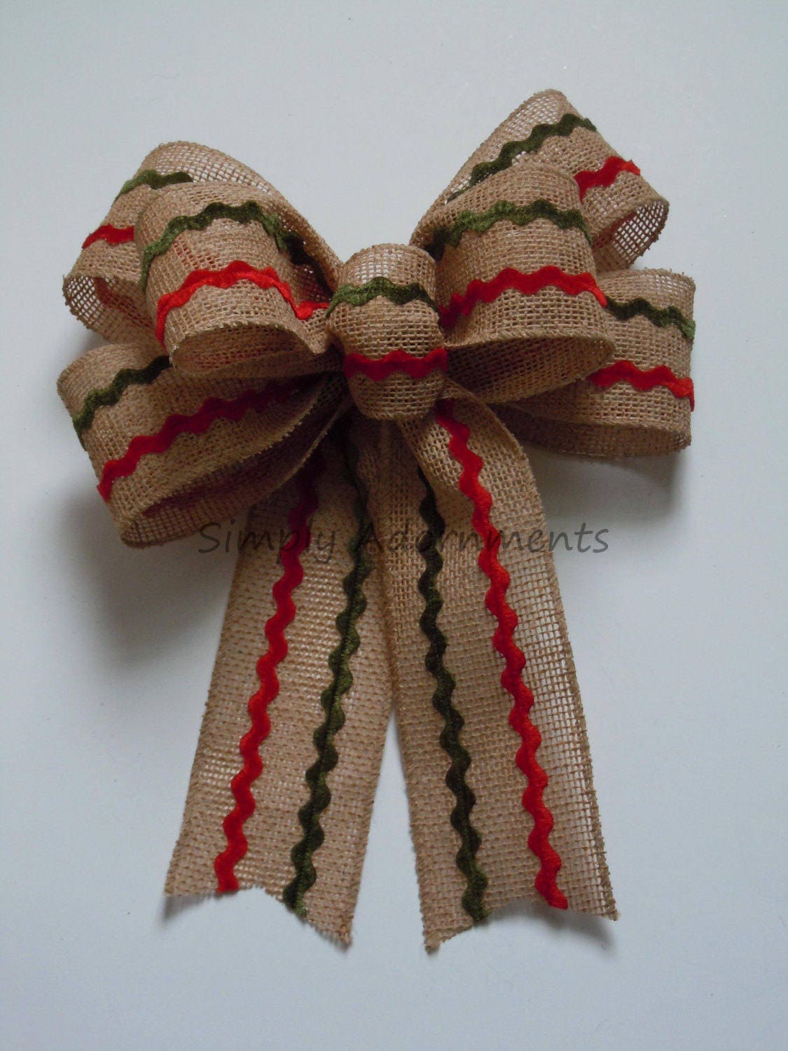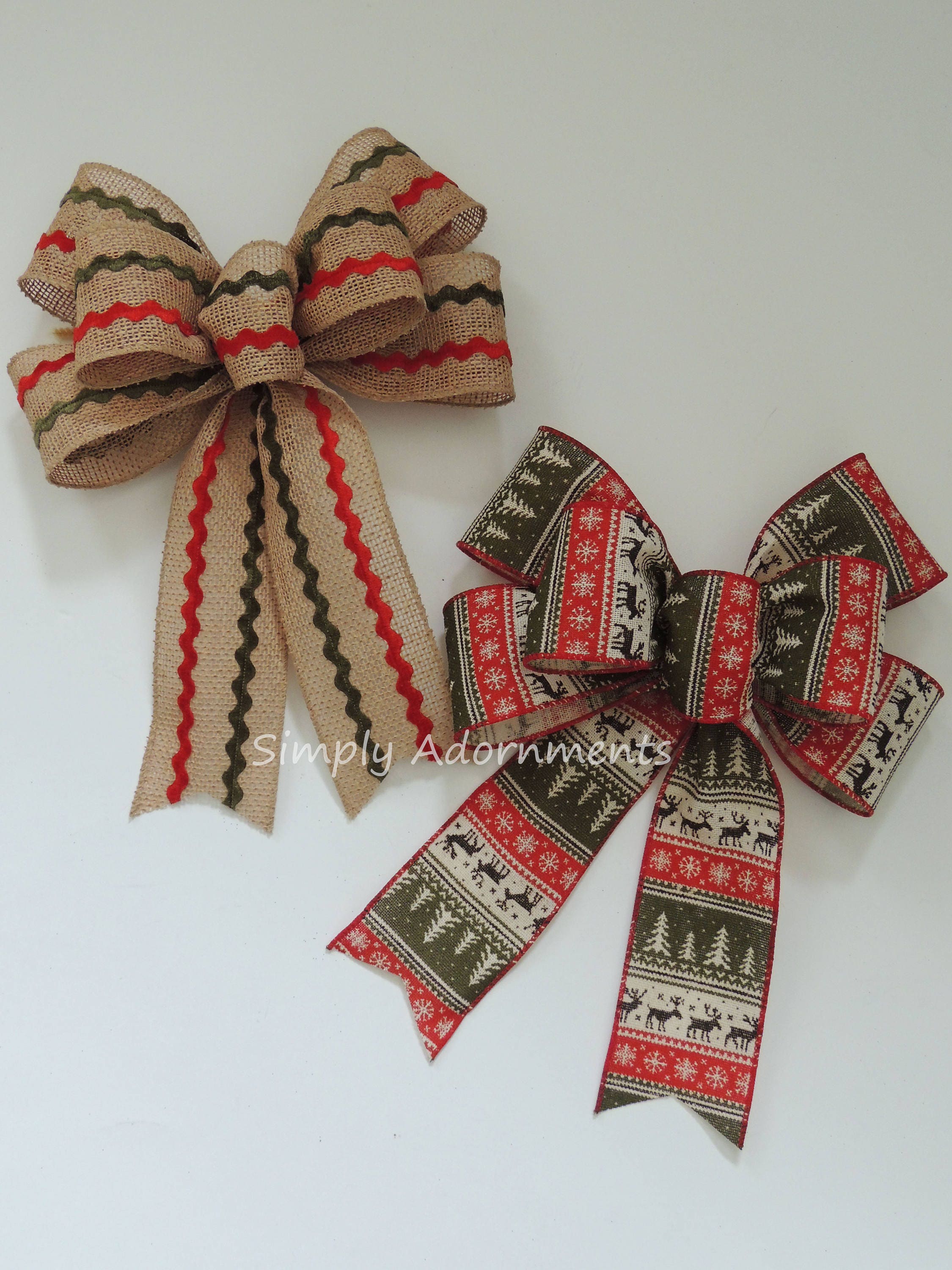 This bow is made using 2.5" wide Christmas sweater canvas wired ribbon OR red green zigzag burlap wired ribbon. The bow measures approximately 8" across and 11" long, measuring from the top of the bow to the end of the tails.