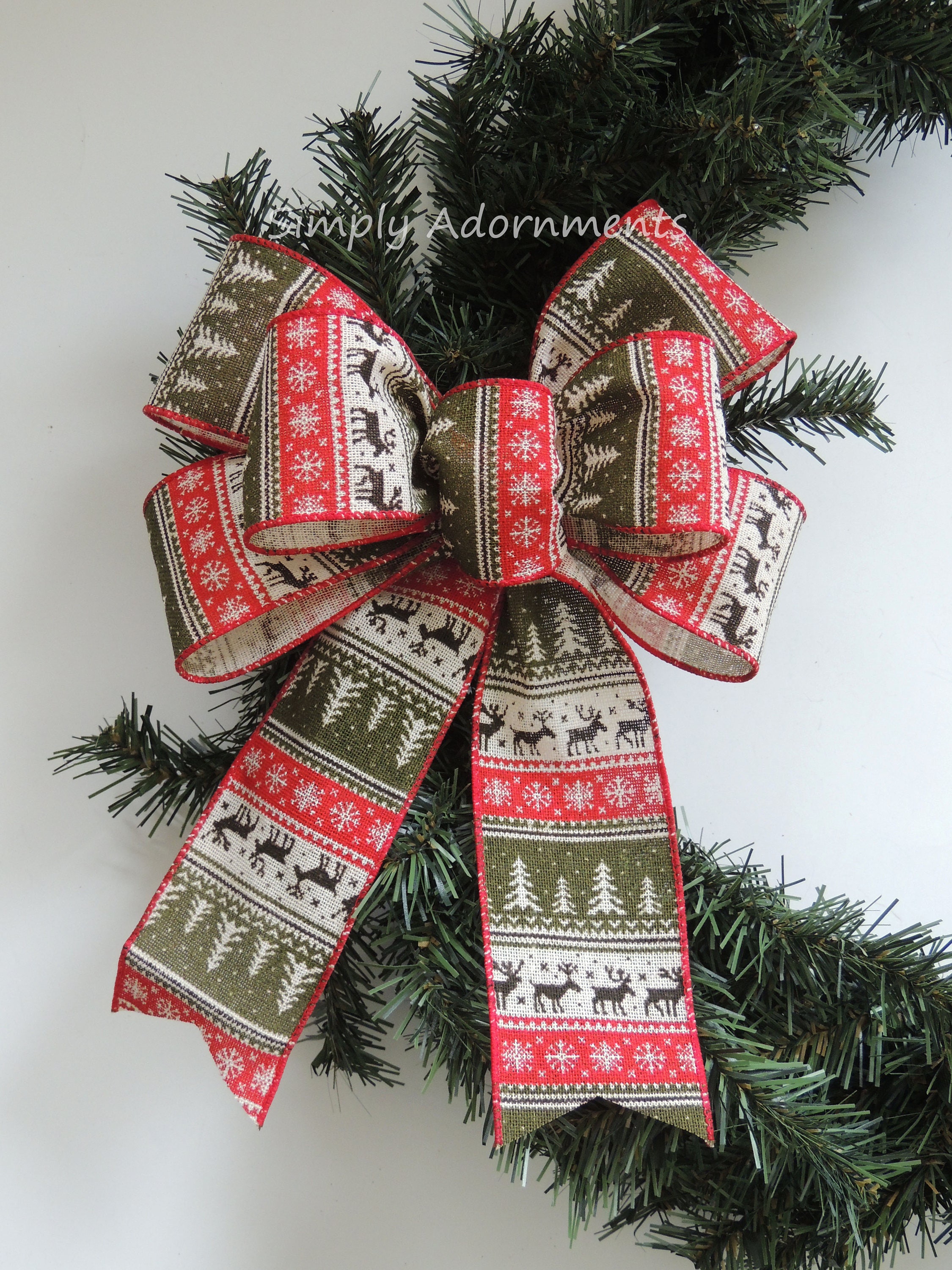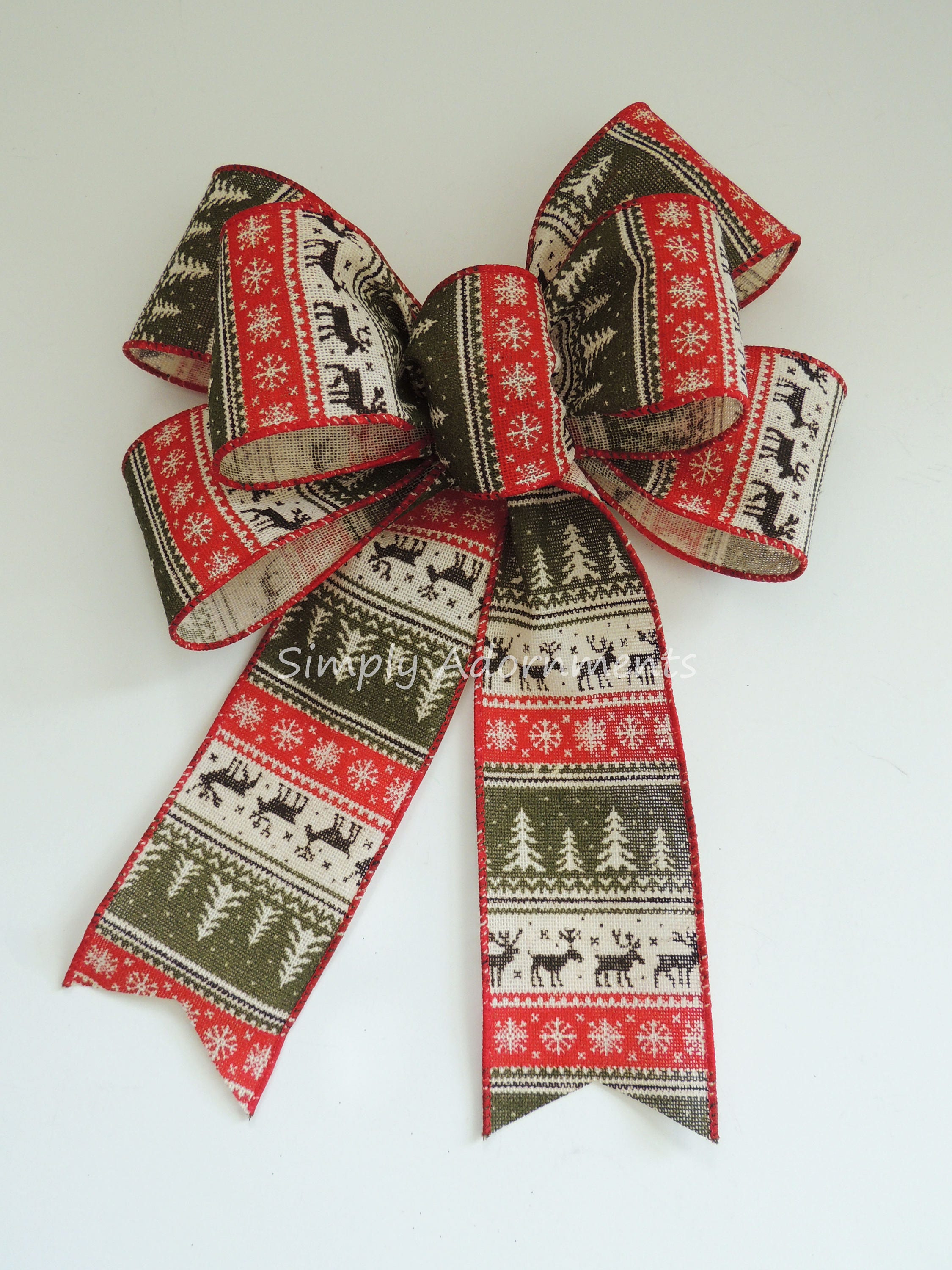 Red Green Nordic Reindeer Bow, Red Moss Rustic Christmas Sweater Wreath Bow, Christmas Sweater Bow, Nordic Burlap Christmas Bows, Gift bow