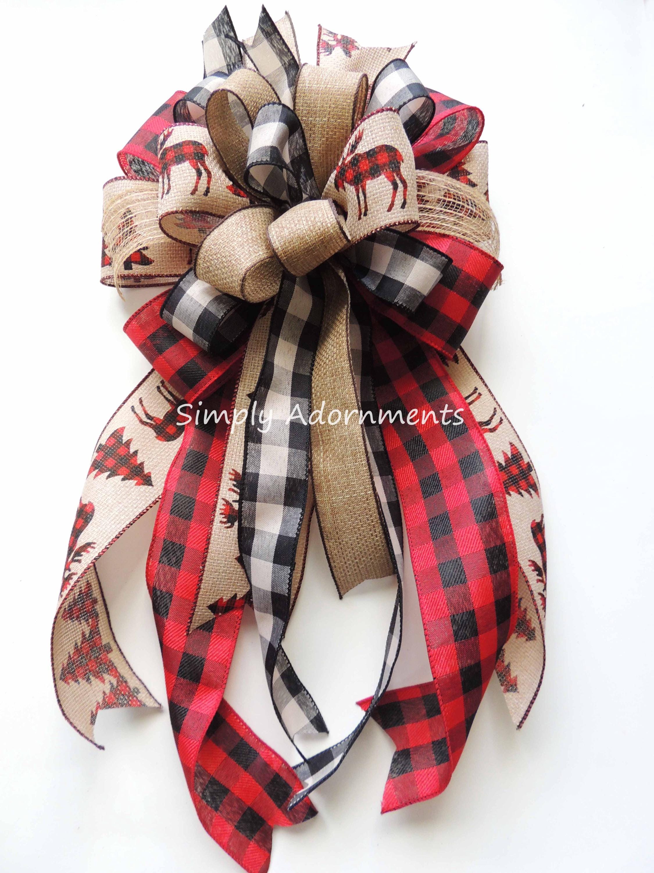 Farmhouse Christmas Wreath Bows Rustic Farmhouse Red Black Tan Christmas Bow. Farmhouse Tree Bows, Red Black buffalo Check Tree Topper Bow