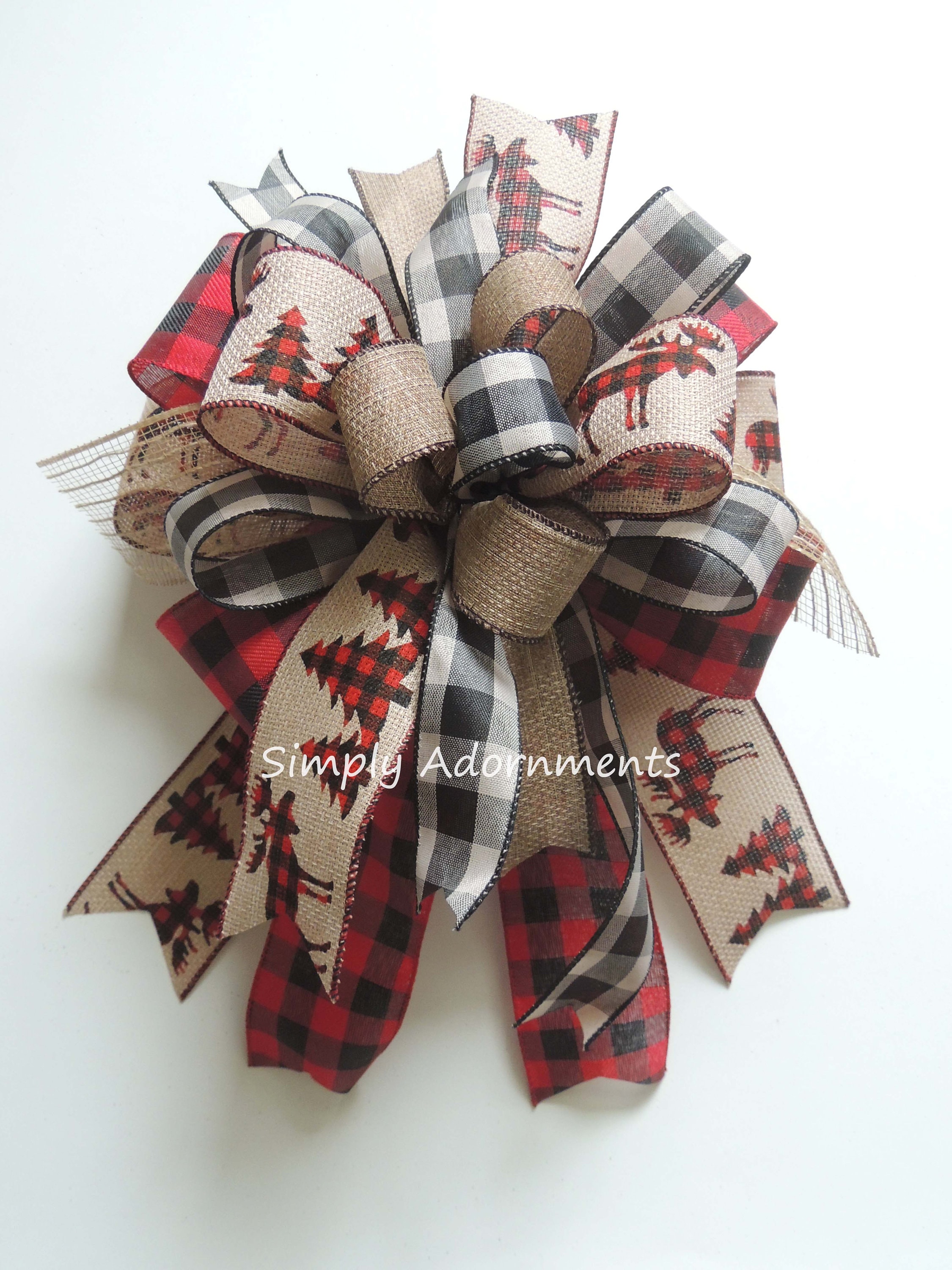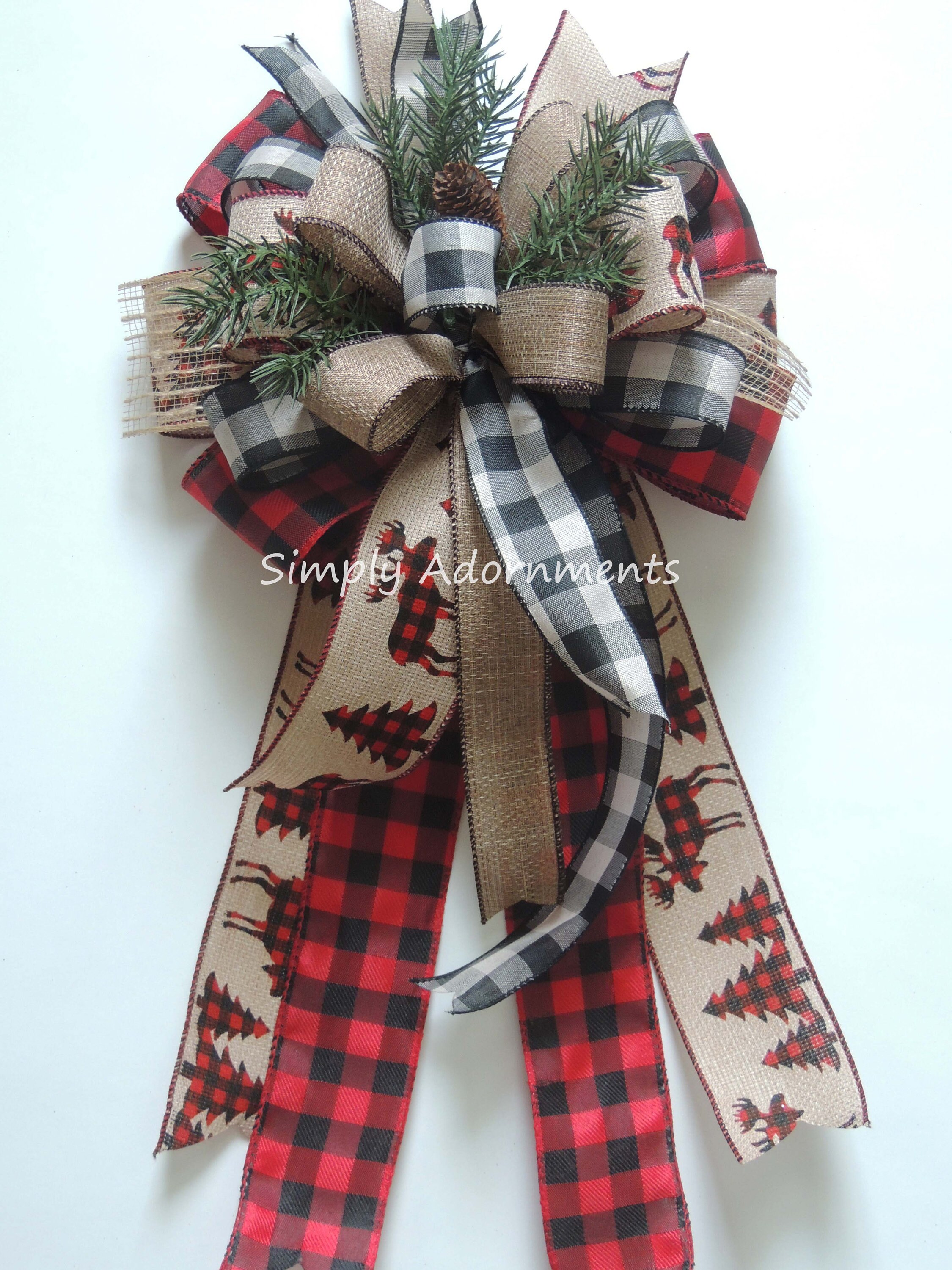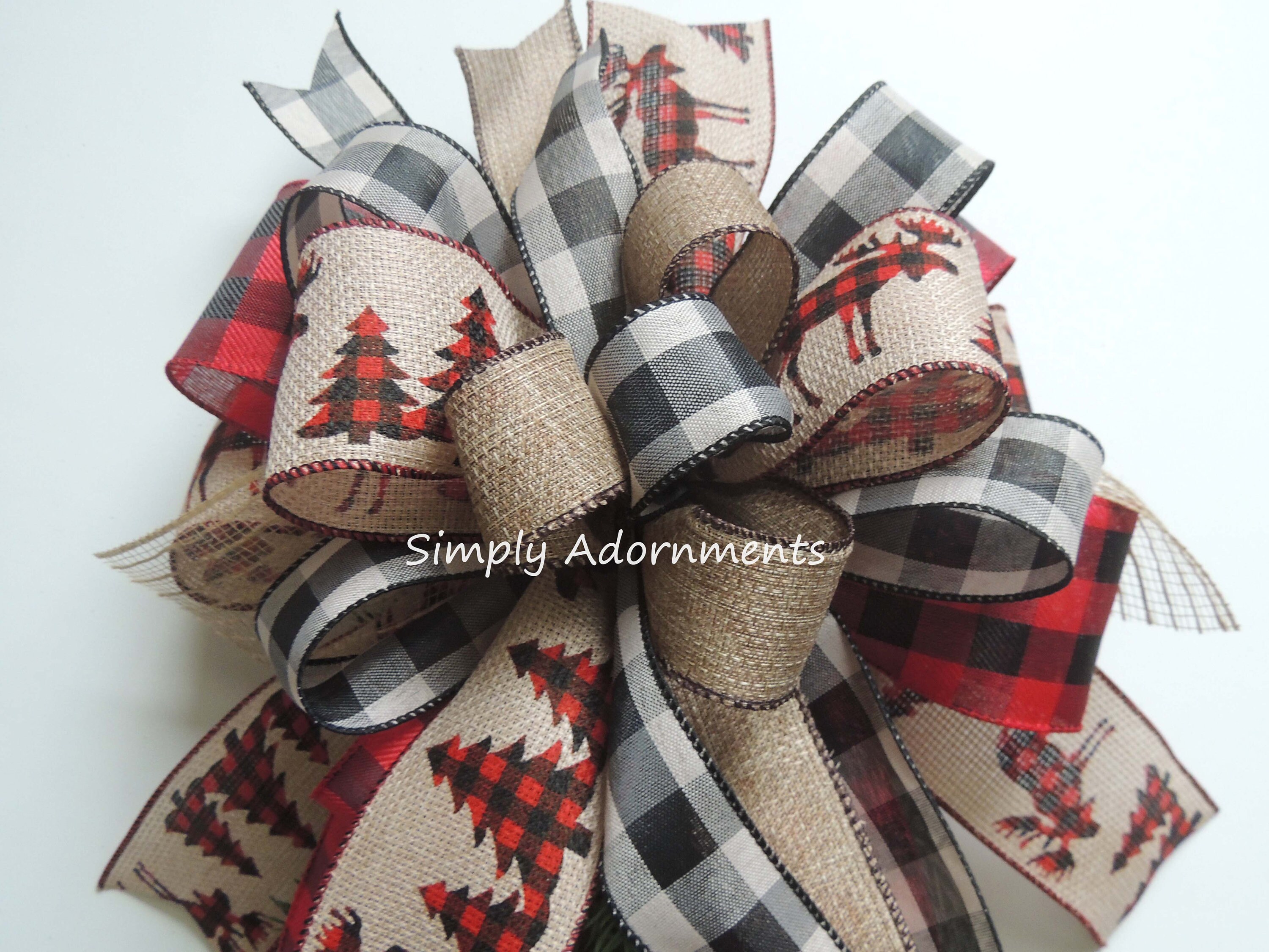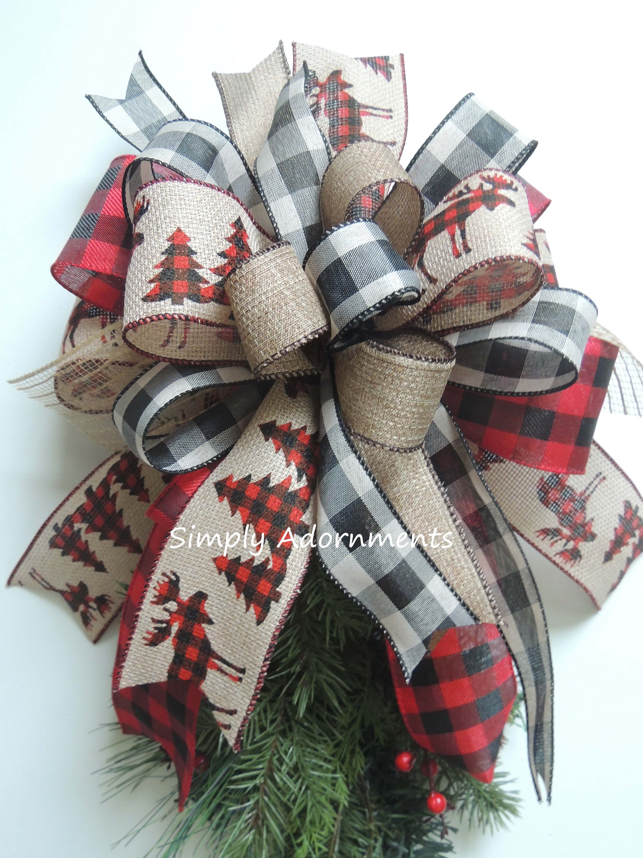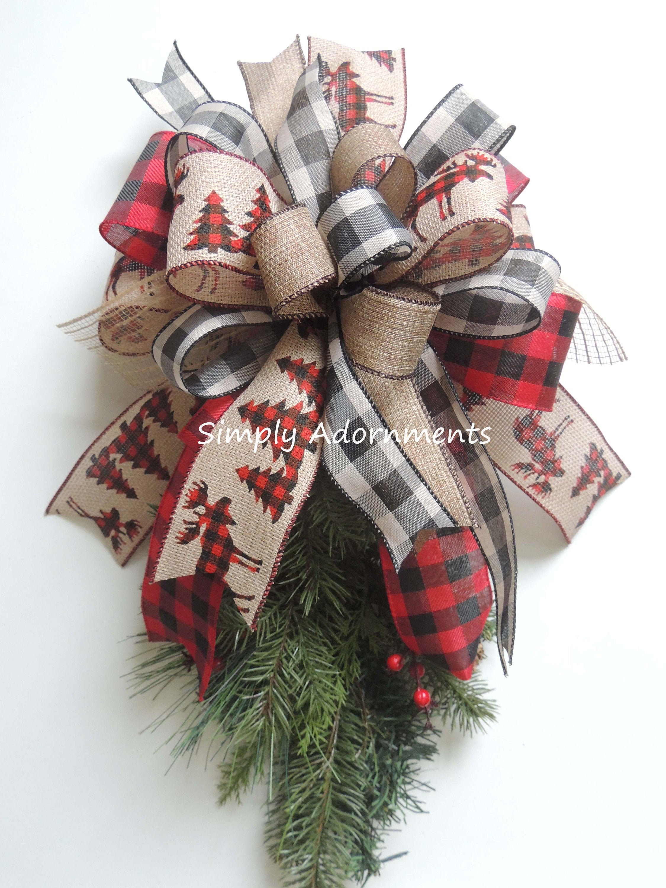 Farmhouse Christmas Wreath Bows Rustic Farmhouse Red Black Tan Christmas Bow. Farmhouse Tree Bows, Red Black buffalo Check Tree Topper Bow