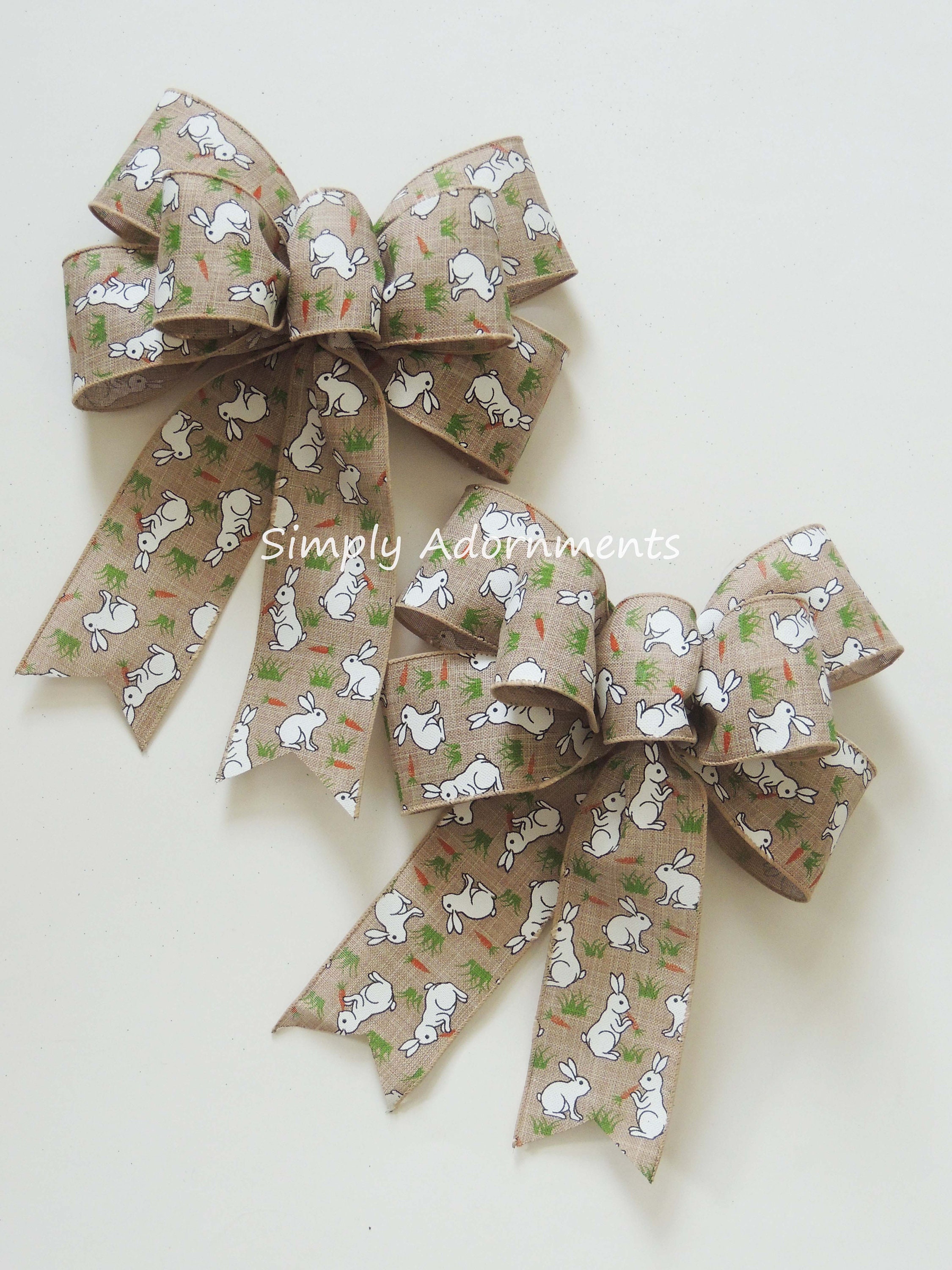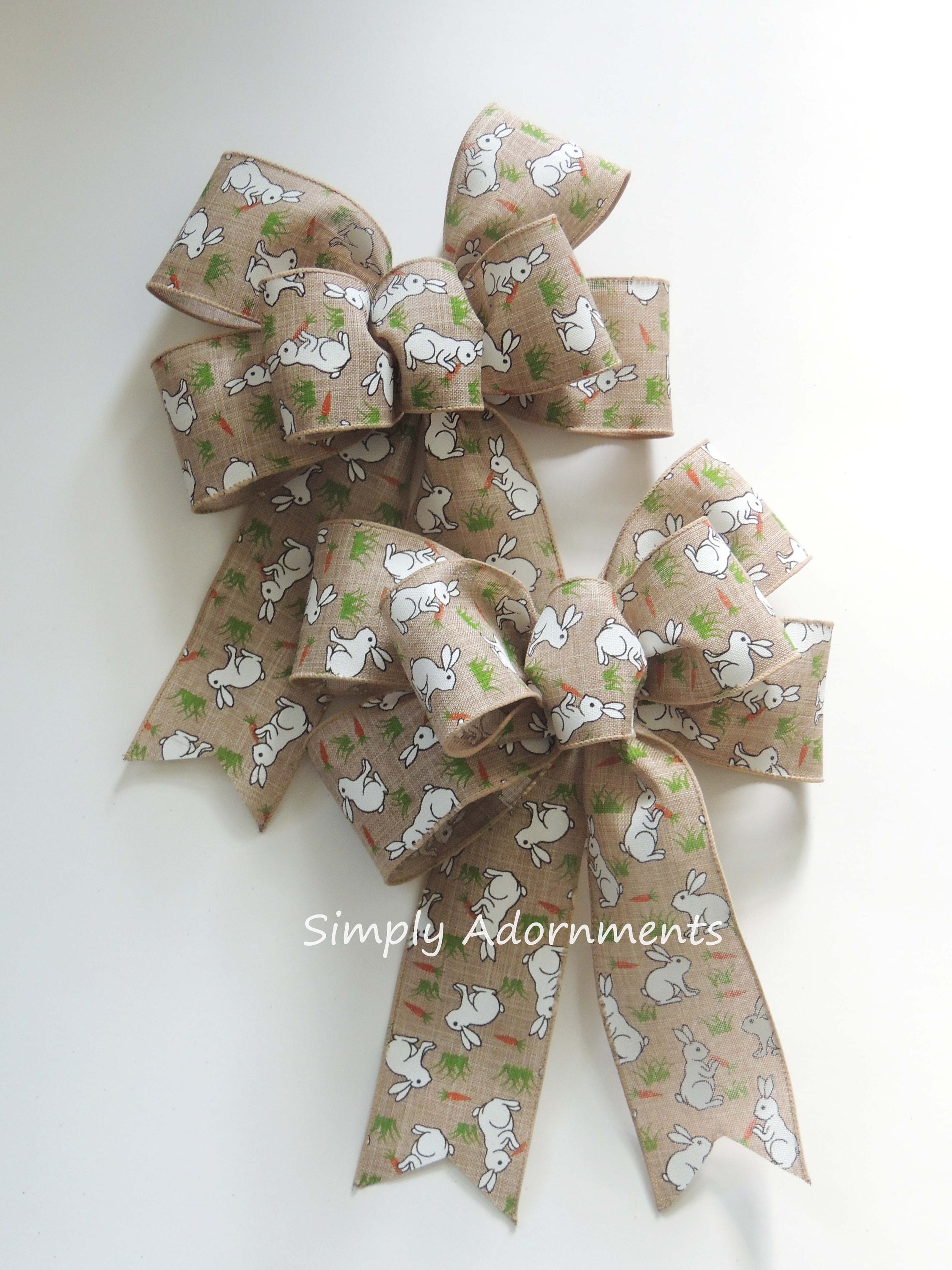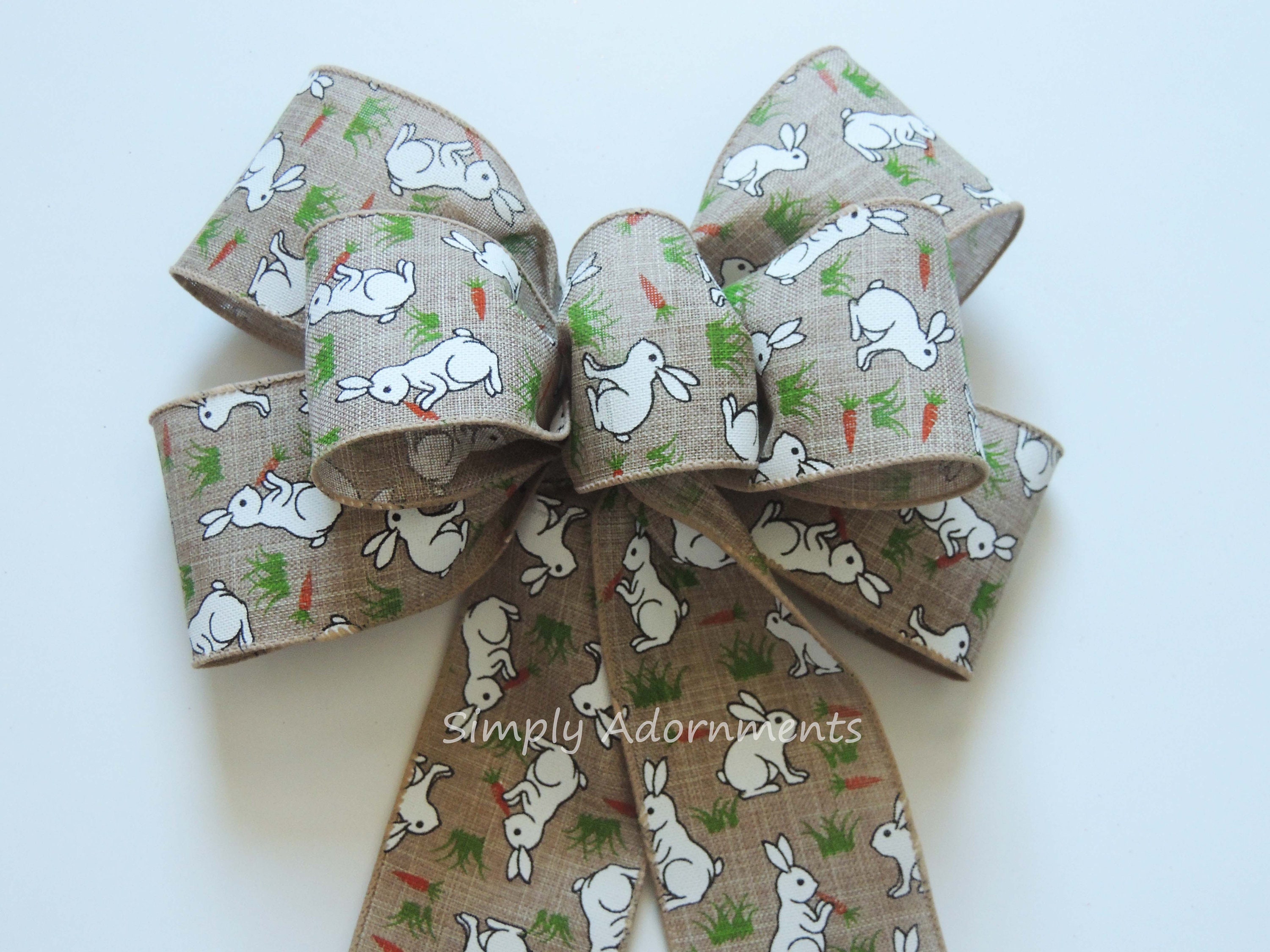 This rustic natural tan Easter bow is made of 2.5" wired white bunny & carrot pattern on natural linen wired ribbon. The bow length(L) is from top of the bow to the end of it tails. Please select the bow size before checking out.