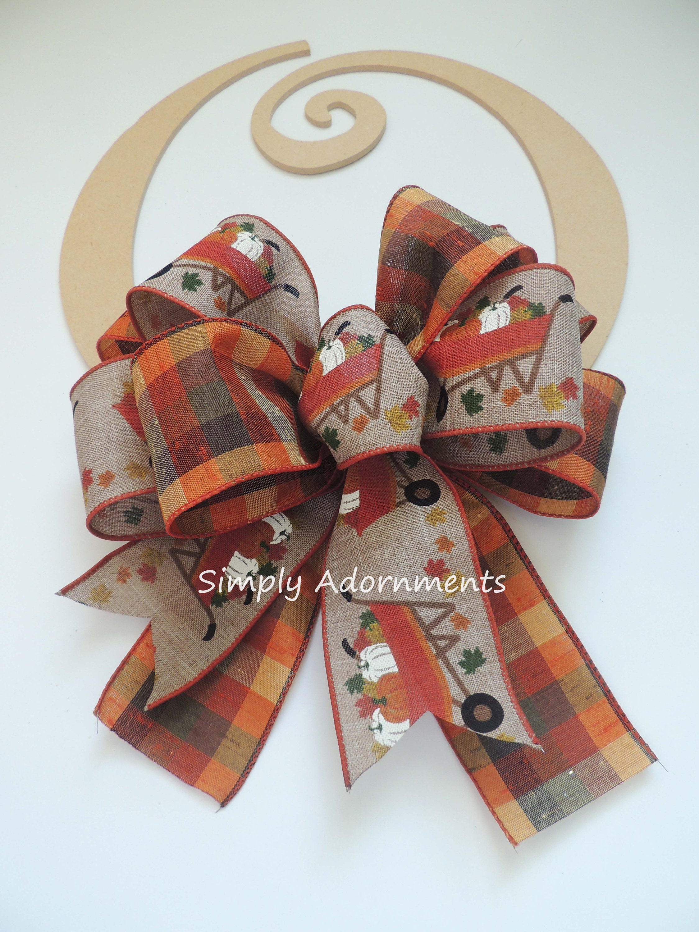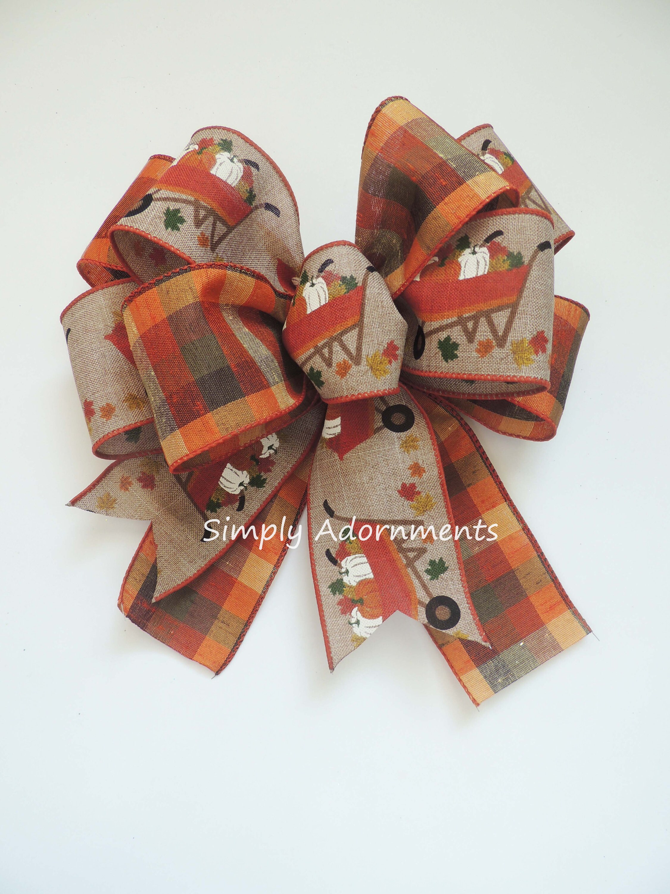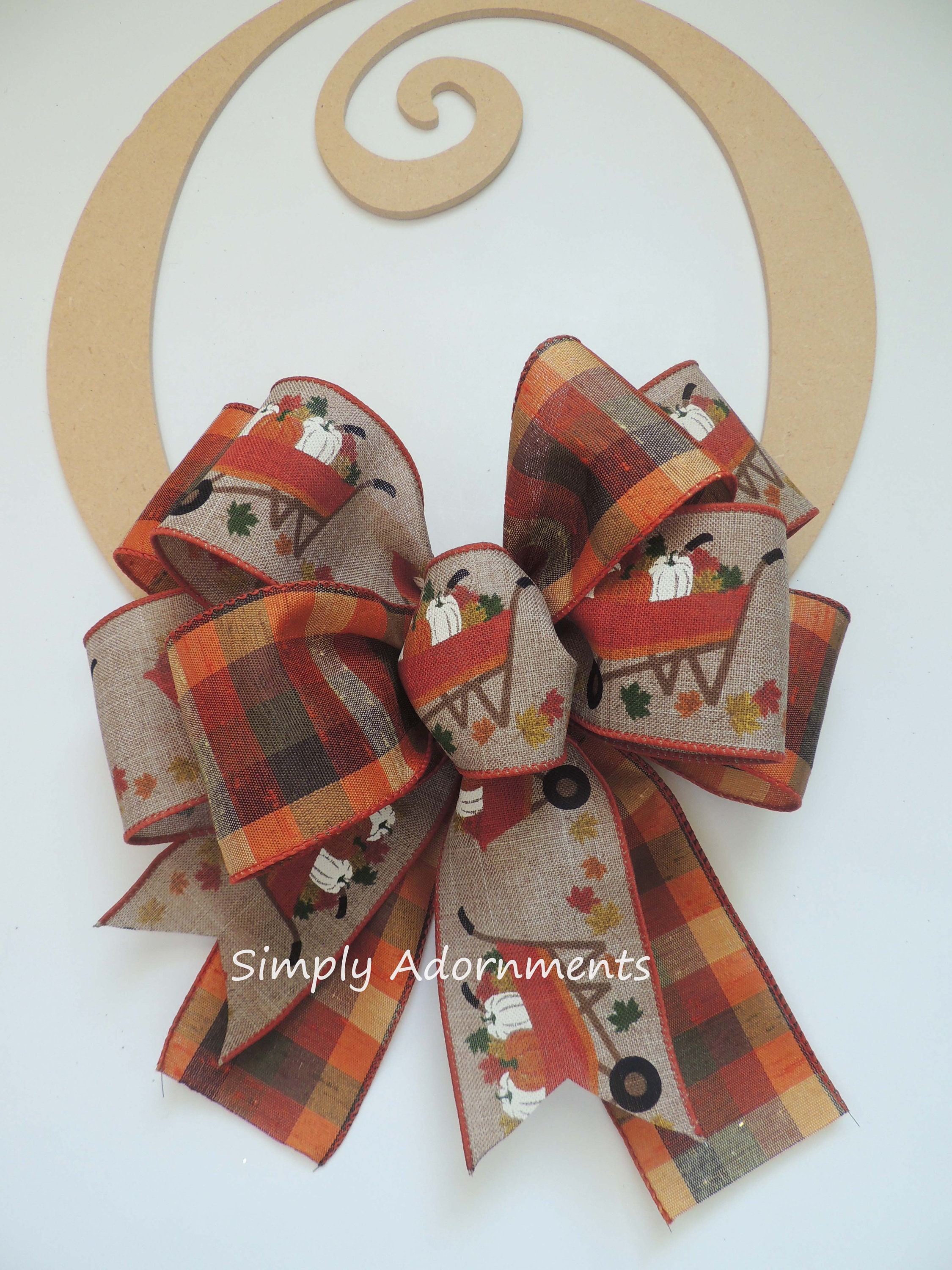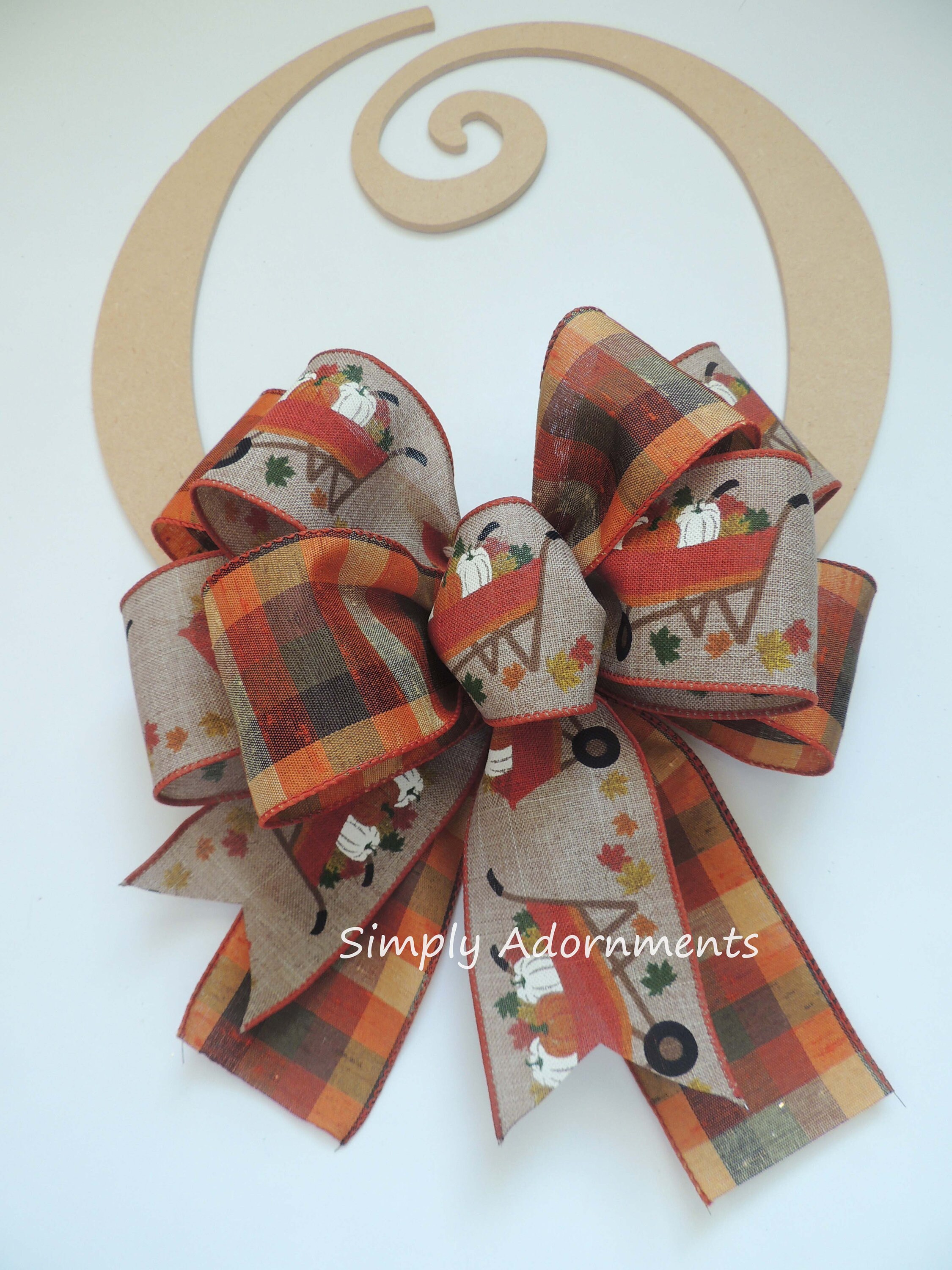 The bow is created with 2.5" width rust orange brown buffalo plaid wired ribbon and pumpkin wheelbarrow on beige canvas liked wired ribbon. The bow length (L) is from top of the bow to the end of its longest tails. Please select the bow size before checking out.