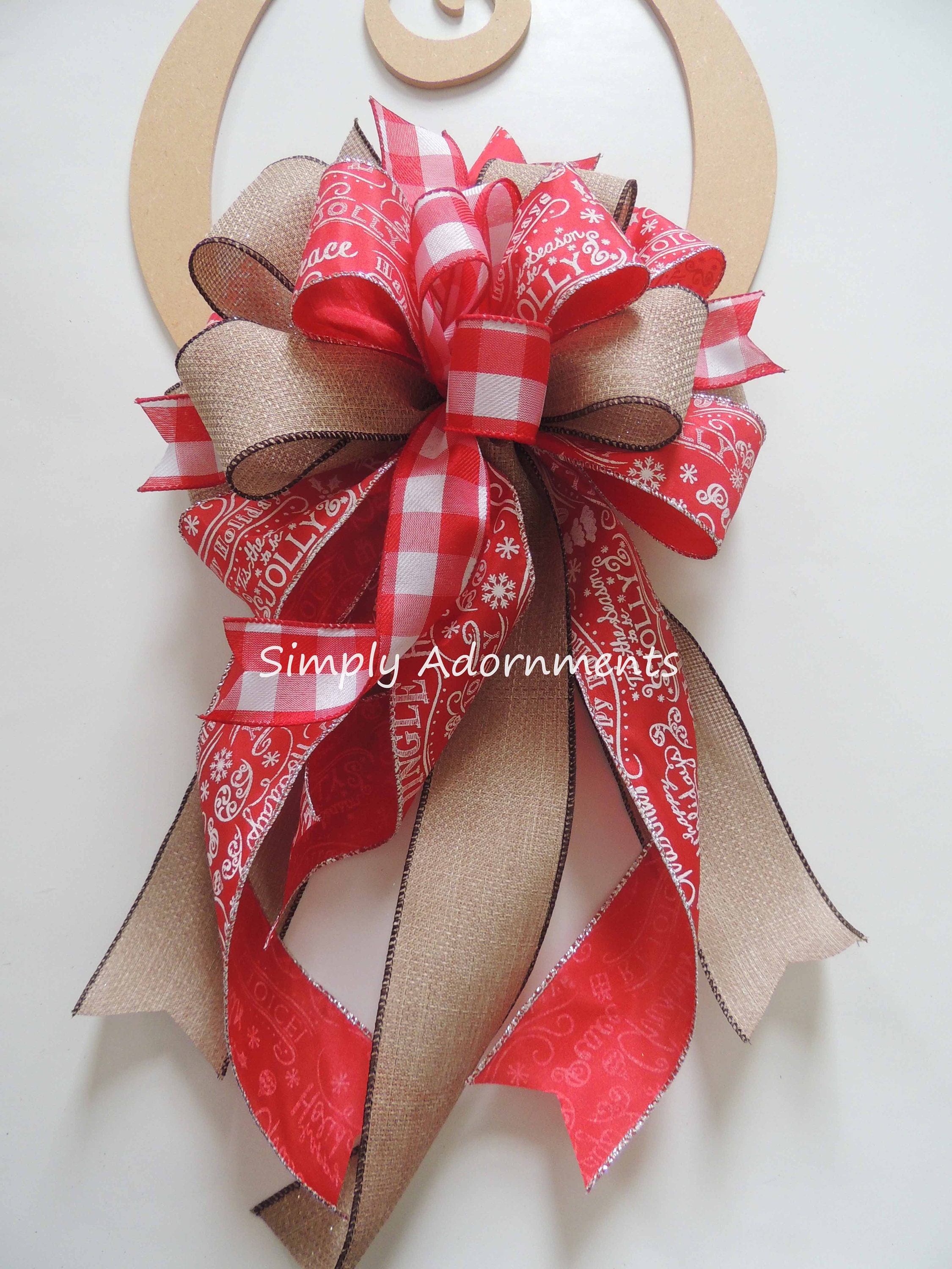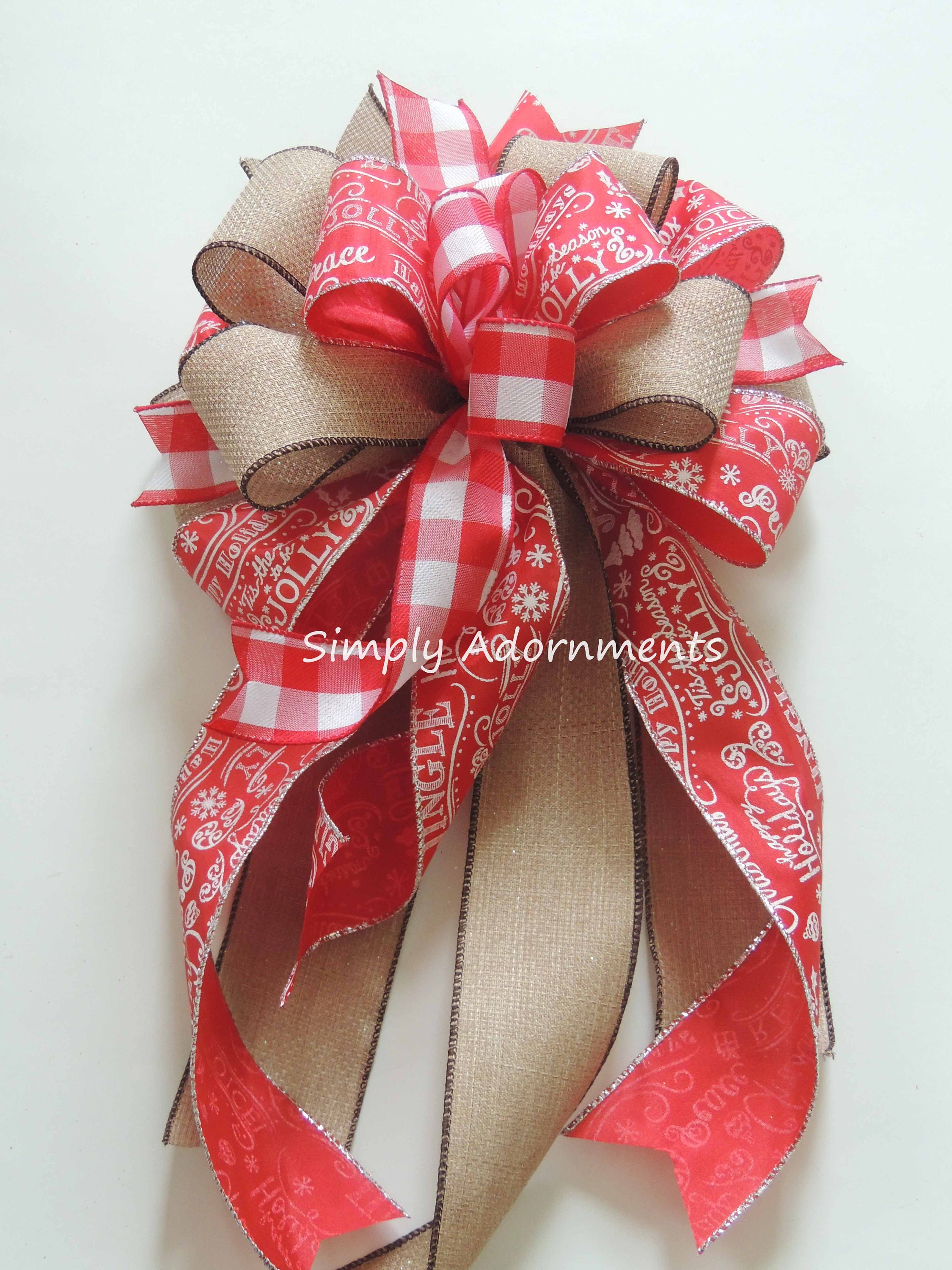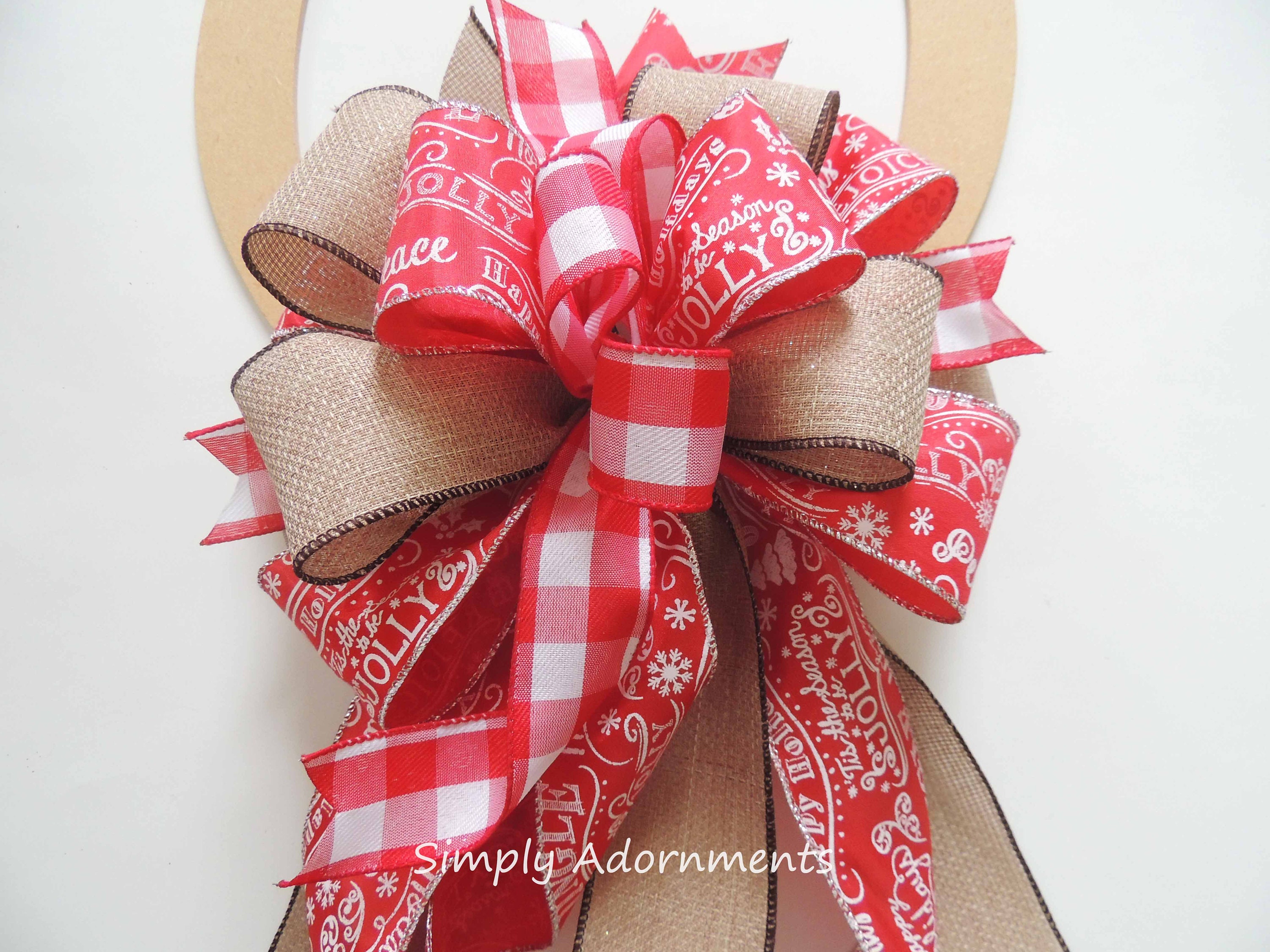 Red white Farmhouse Christmas Bow, Farmhouse Christmas Scripts Wreath Bow, Farmhouse Christmas Tree Topper, Red White check Farmhouse Bow