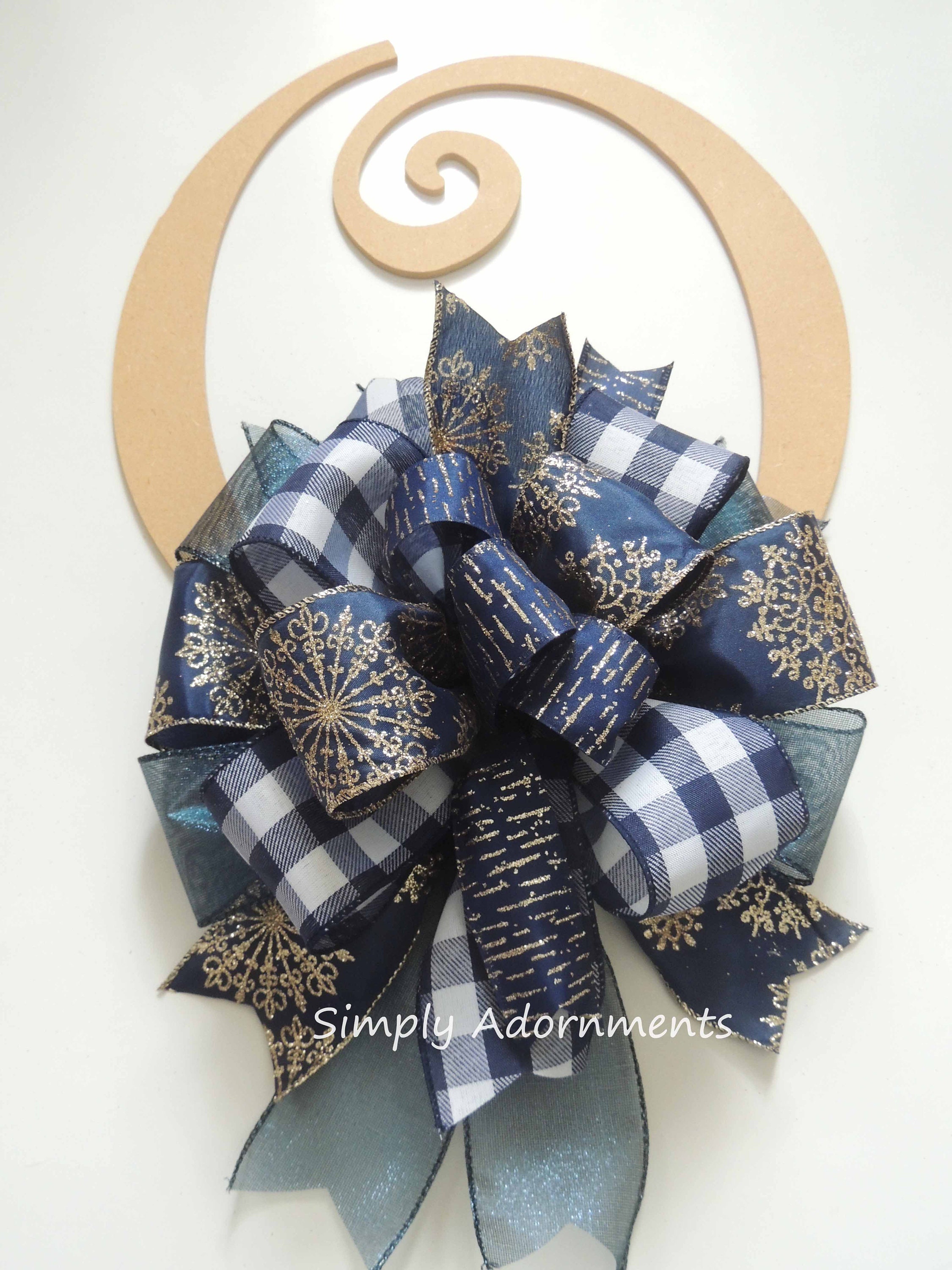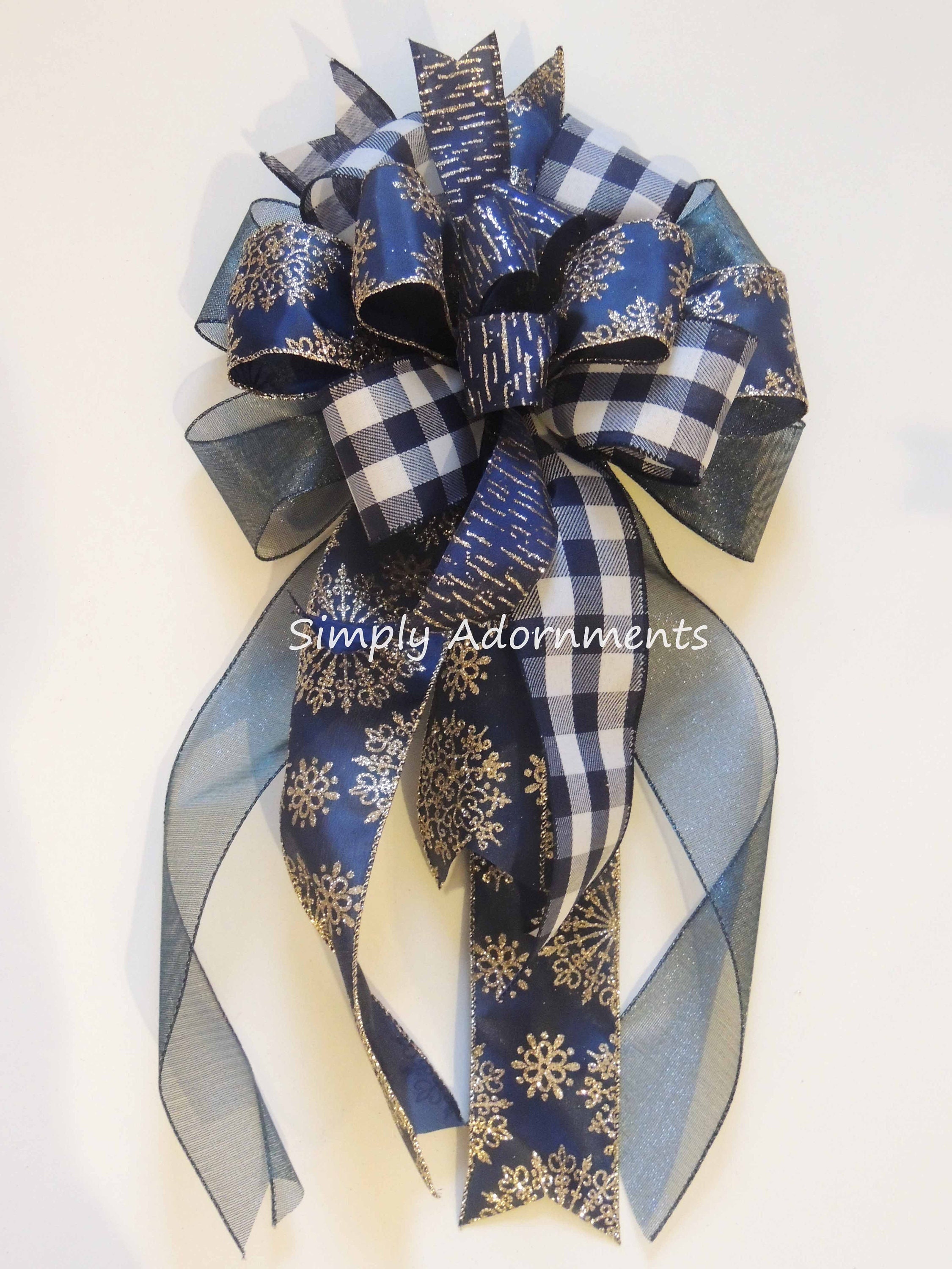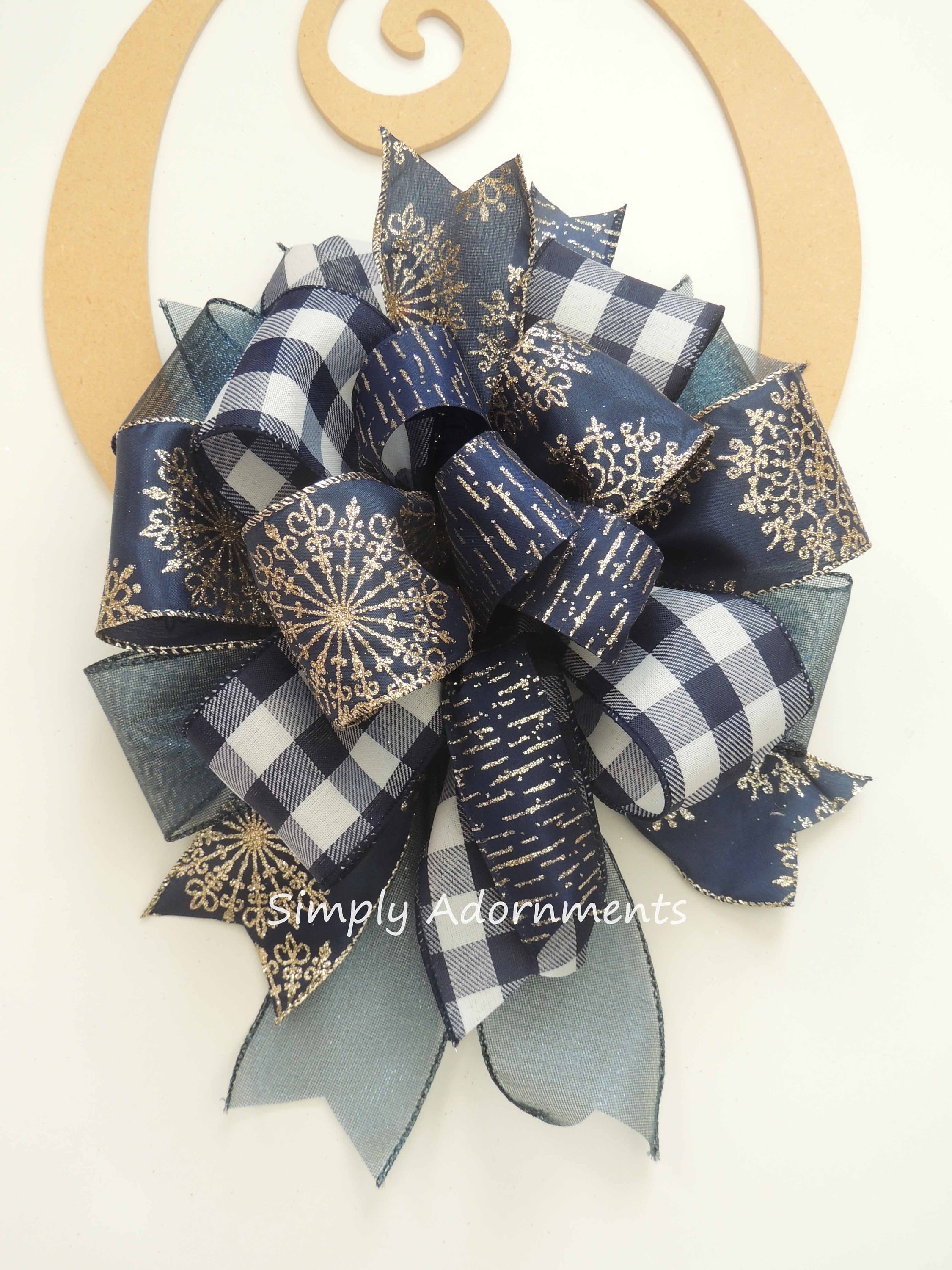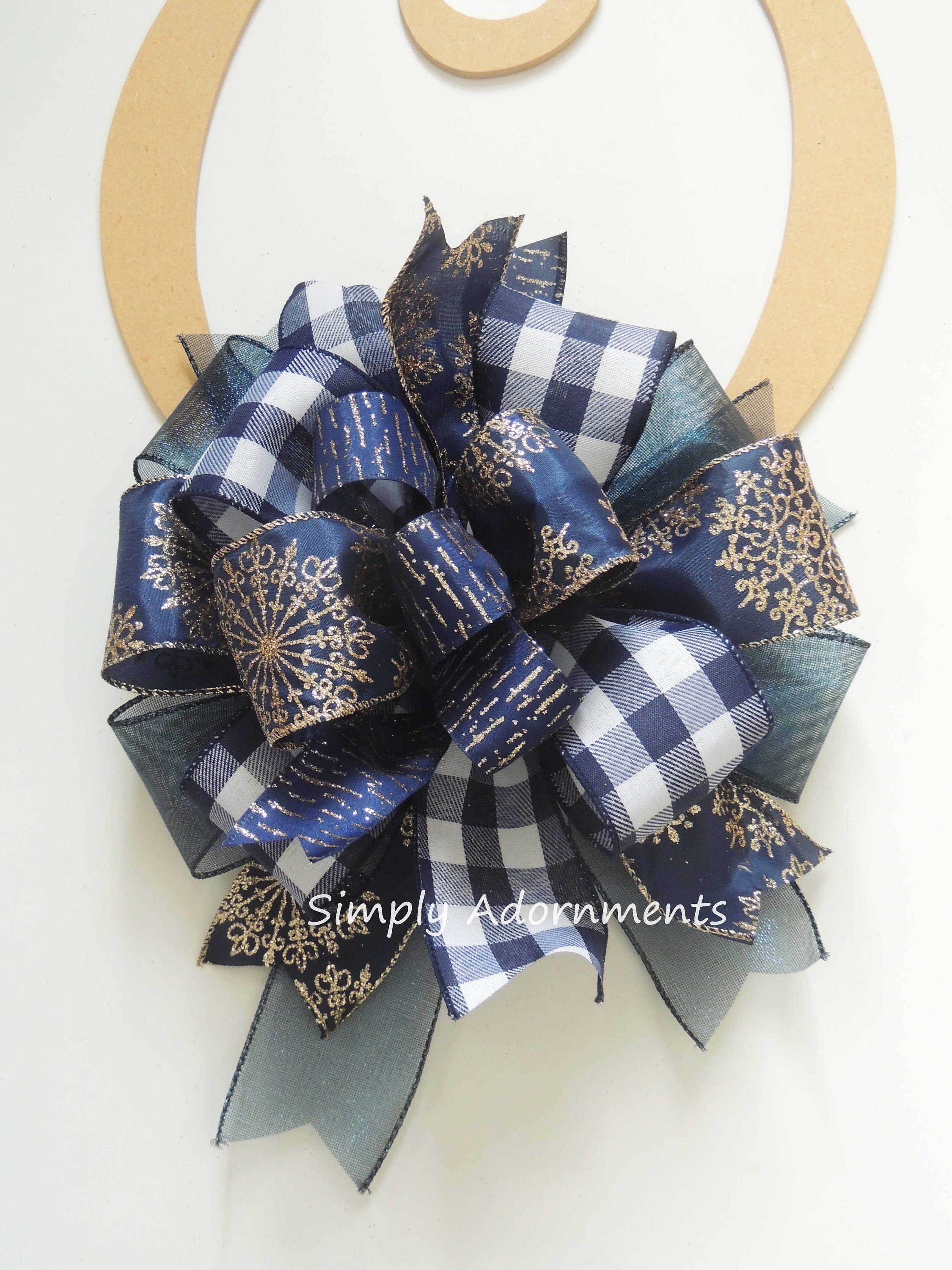 Navy Check Christmas Bow, Whimsical Navy Christmas Snowflakes Bow, Midnight Navy Christmas Wreath Bow, Holiday Bow, Navy Silver Lantern Bow