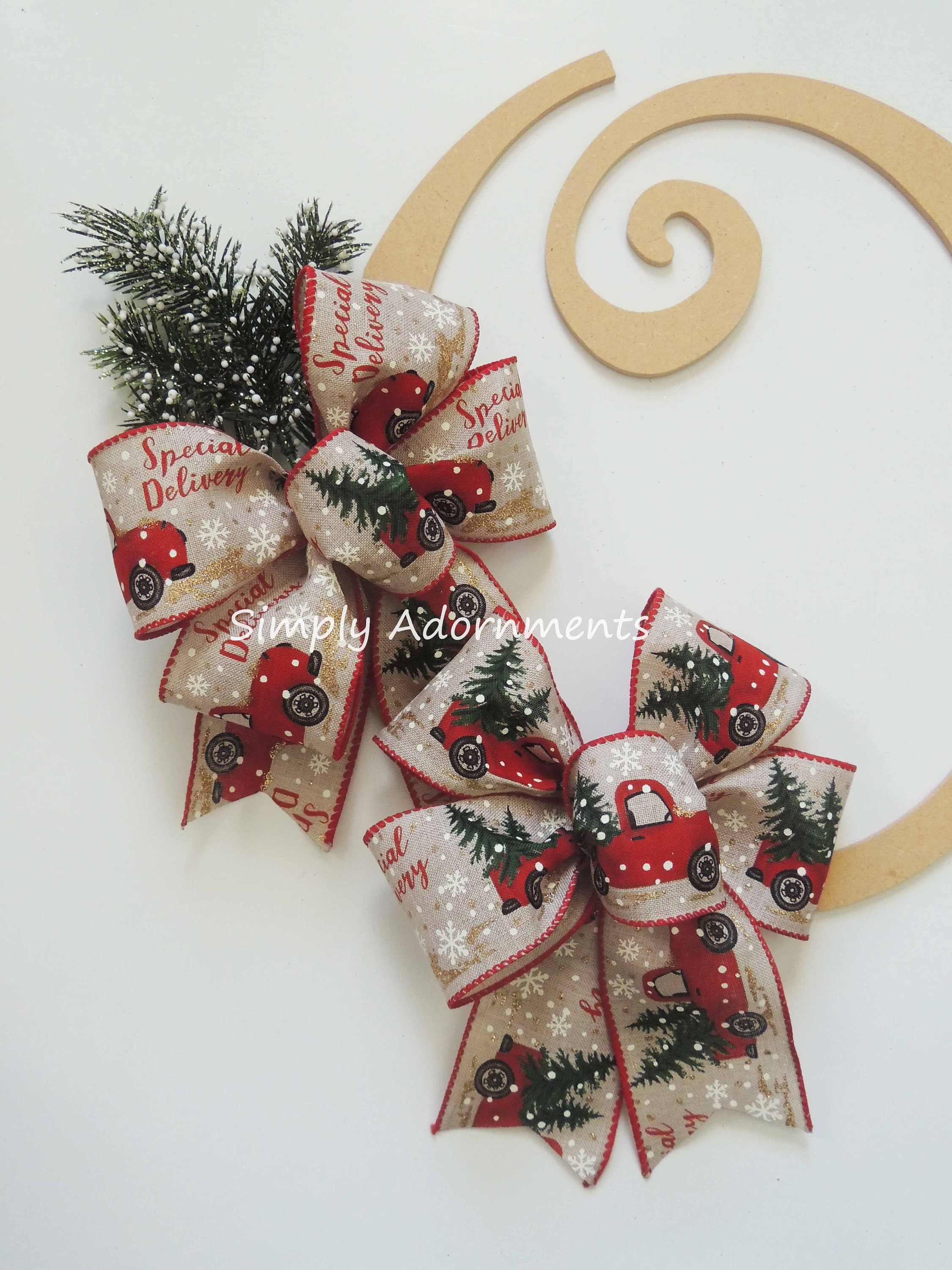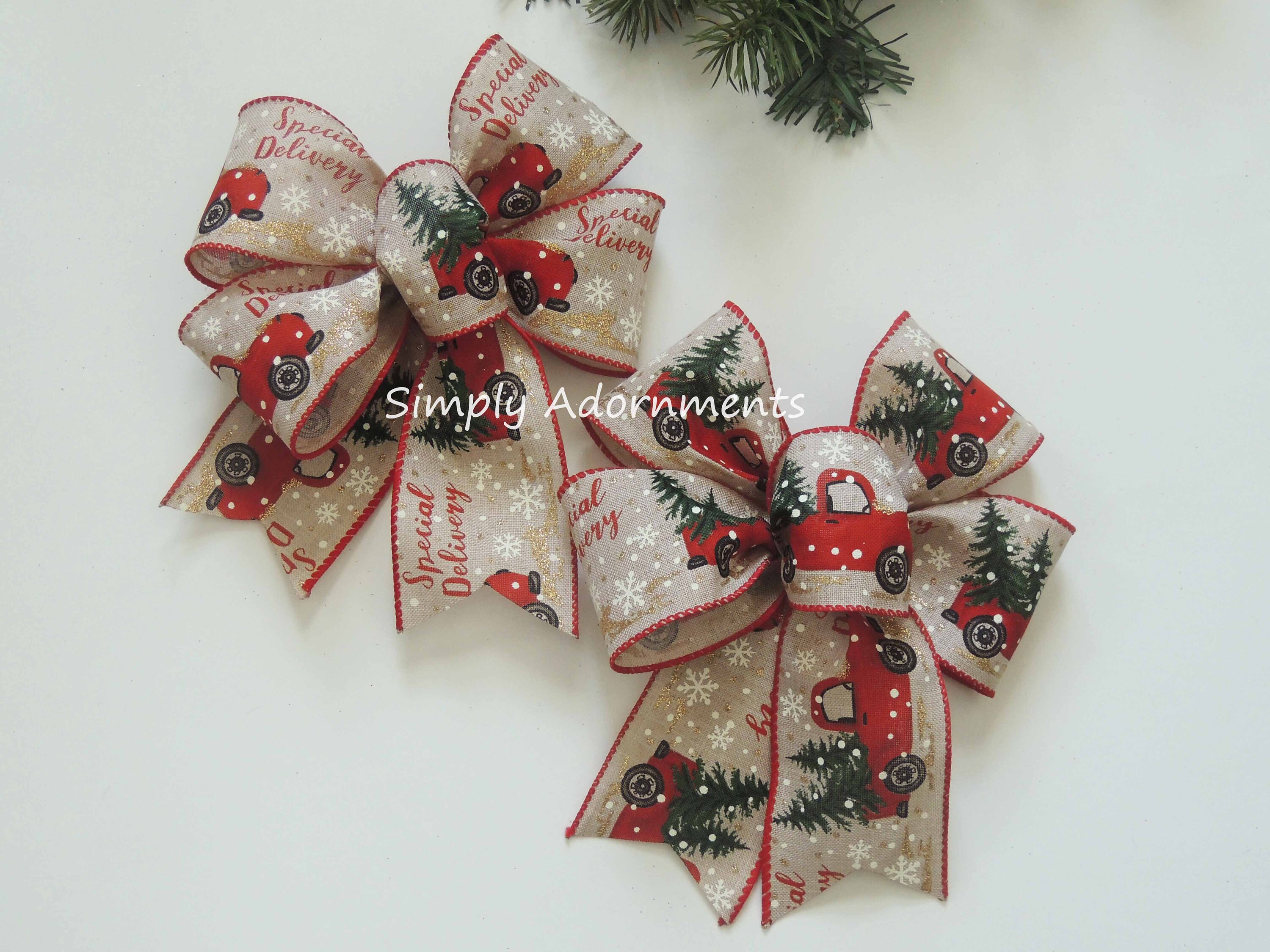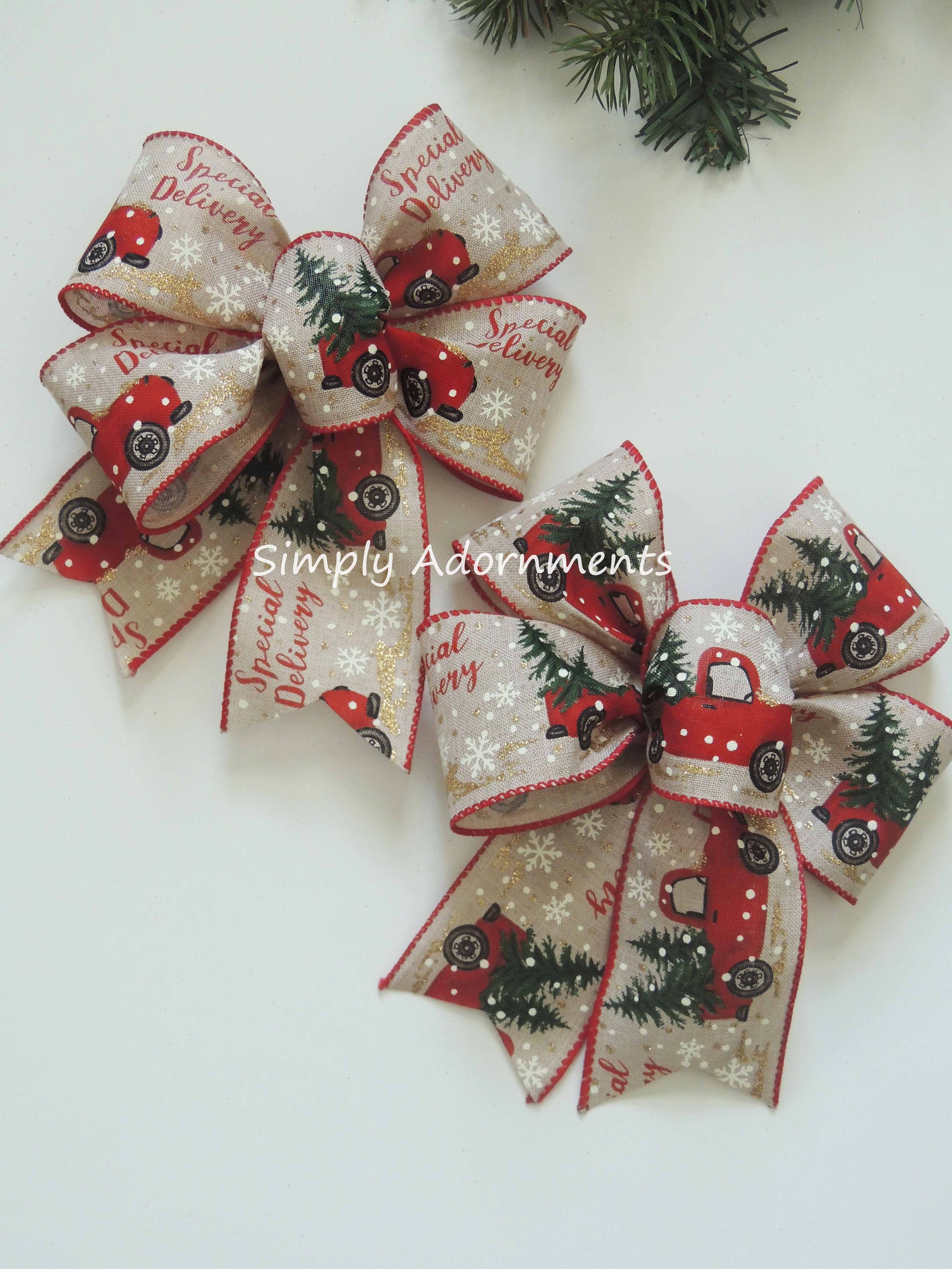 2 Mini Vintage Red Truck Christmas Bows, Red Truck Farmhouse Christmas Gift bows, Red Truck sign Bows, Rustic Red Truck Farmhouse door bows