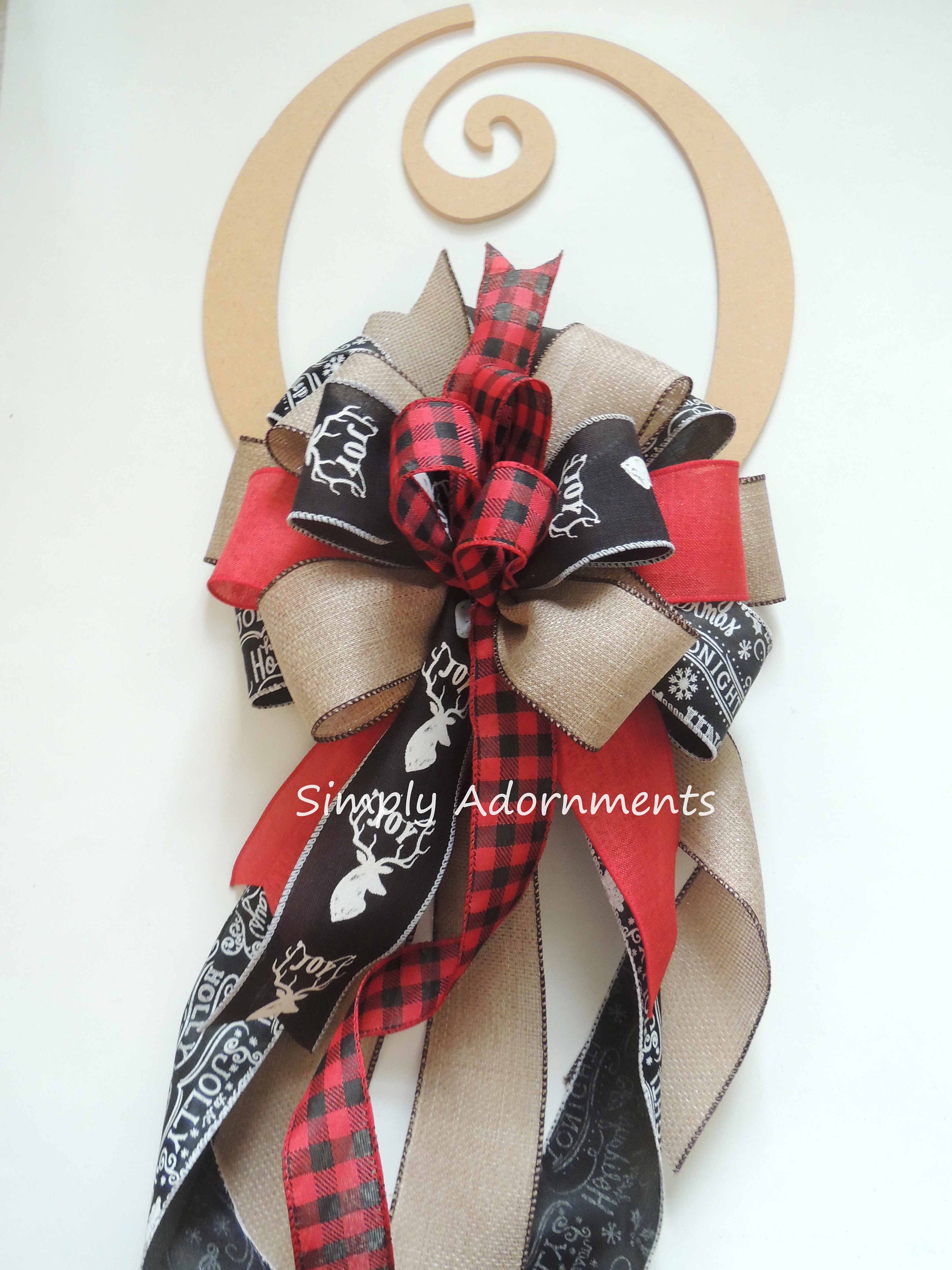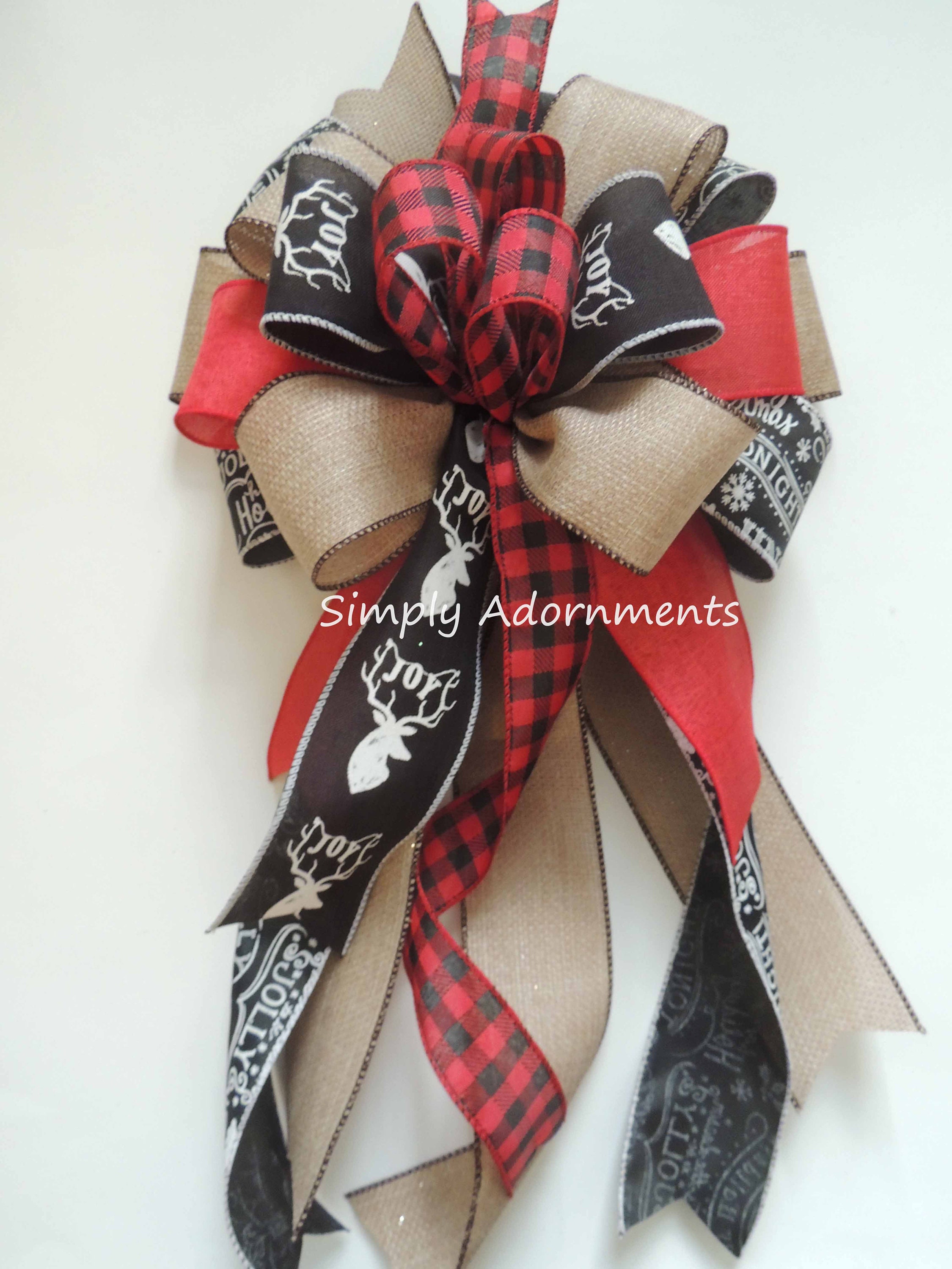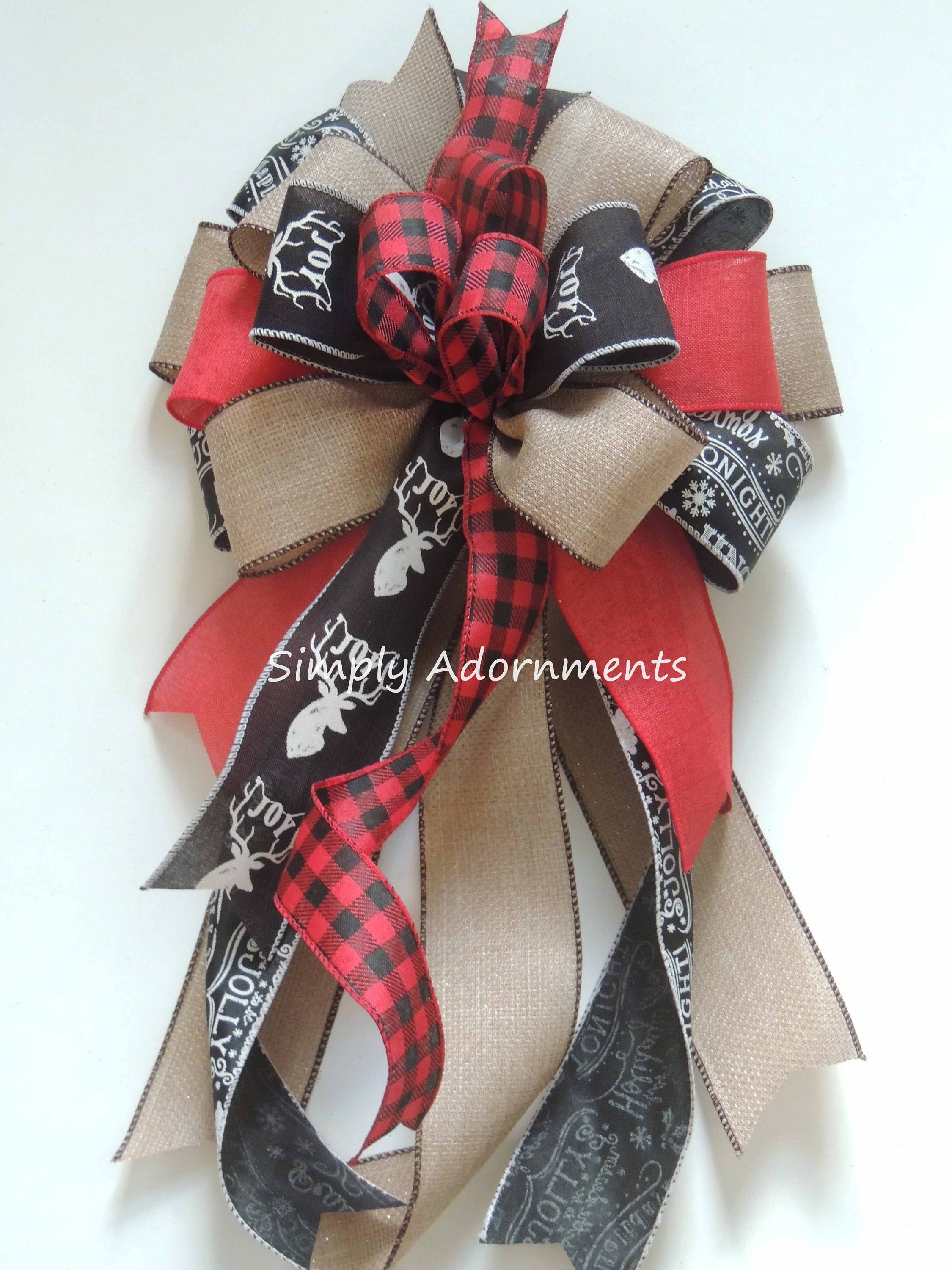Red Black Reindeer Bow, Reindeer Plaid Check bow, Christmas farmhouse Wreath Bow, Rustic Deer head Tree Topper Bow, Red Black Tan lantern bow