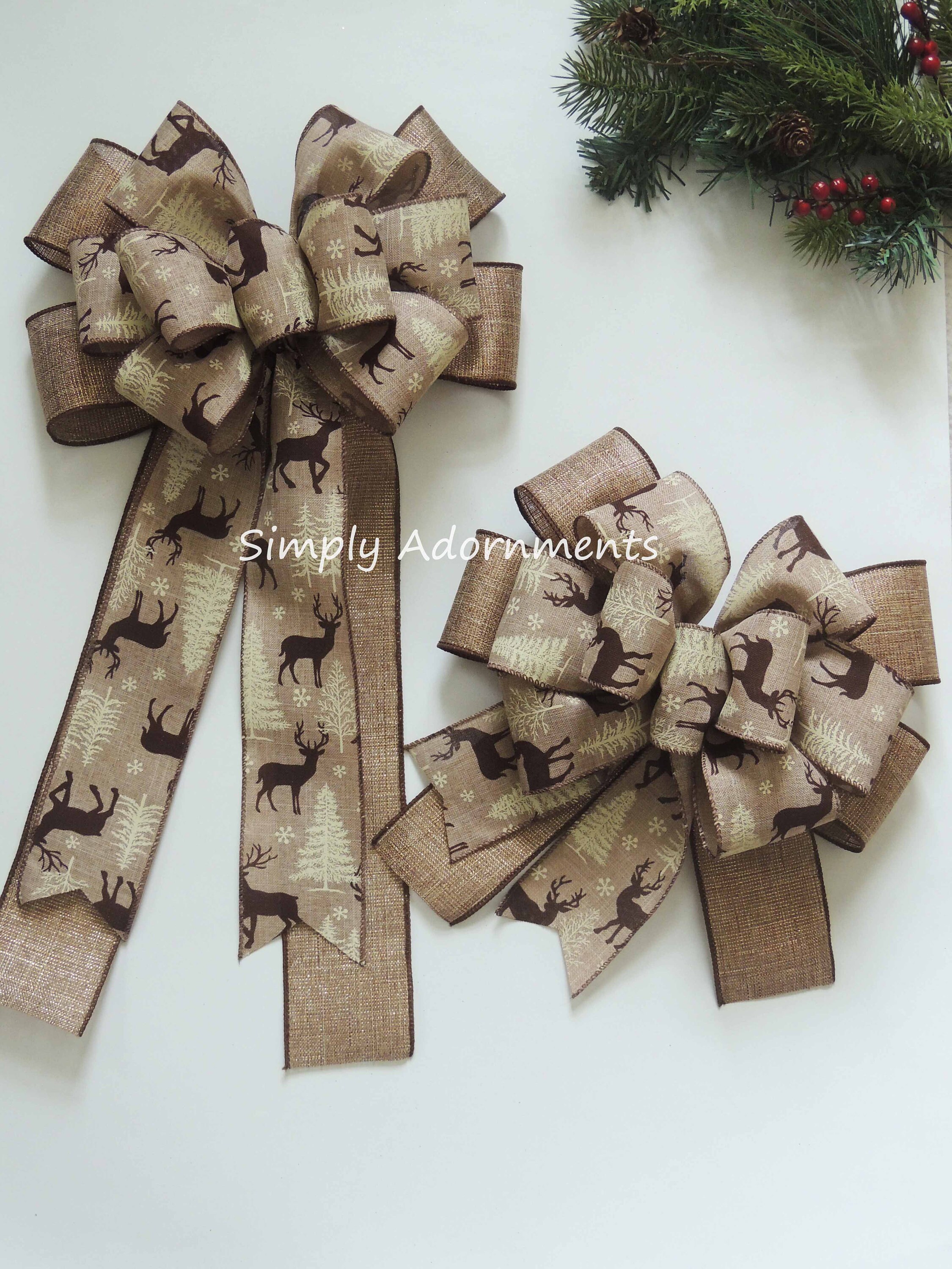 This beautiful woodland reindeer bow is made of 2 different pattern 2.5" in width wired ribbons. The bow length (L) is from top of the bow to the end of the tails. Please select the bow size before checking out.