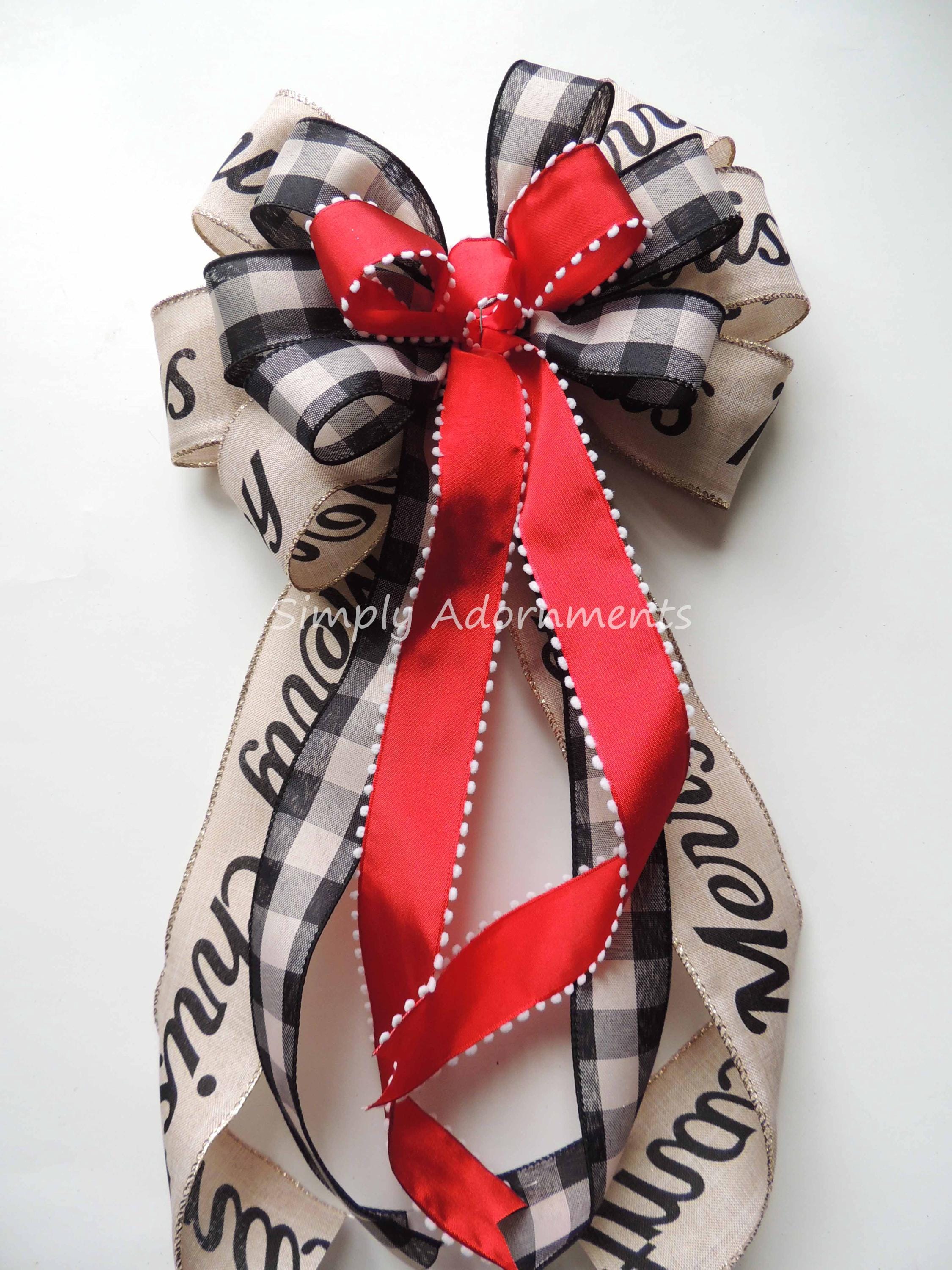 The black buffalo bow is create with three wired ribbons: two ribbon is 1.5" wide black tan buffalo check and one 2.5" ribbon is "MERRY CHRISTMAS" scripts on tan with gold trim wired ribbon. For this particular bow, it has 6 varying length streamers, two of each type of ribbons, with length measuring from the top of the bow to the end of its streamers. Please select the bow size before checking out.
