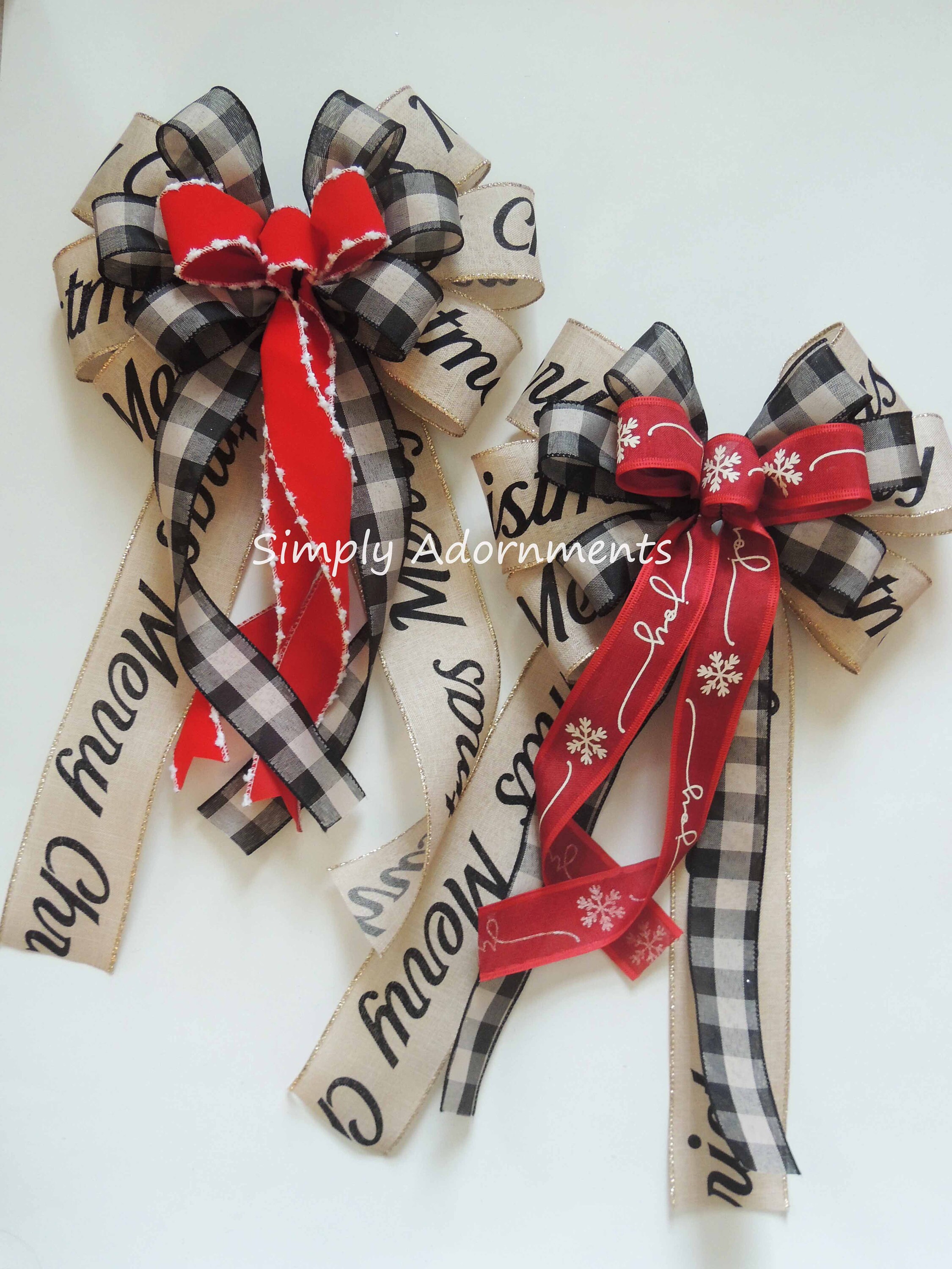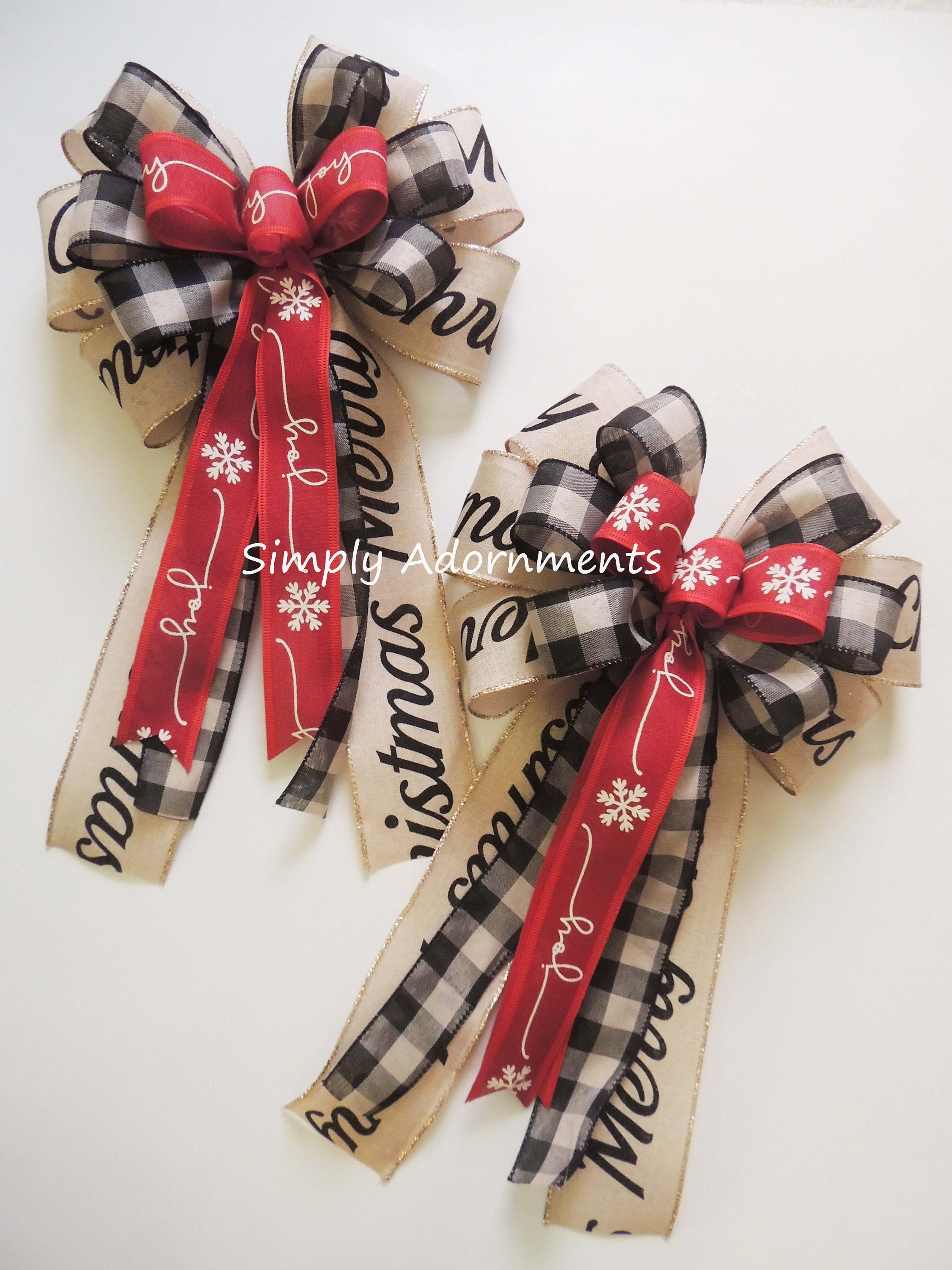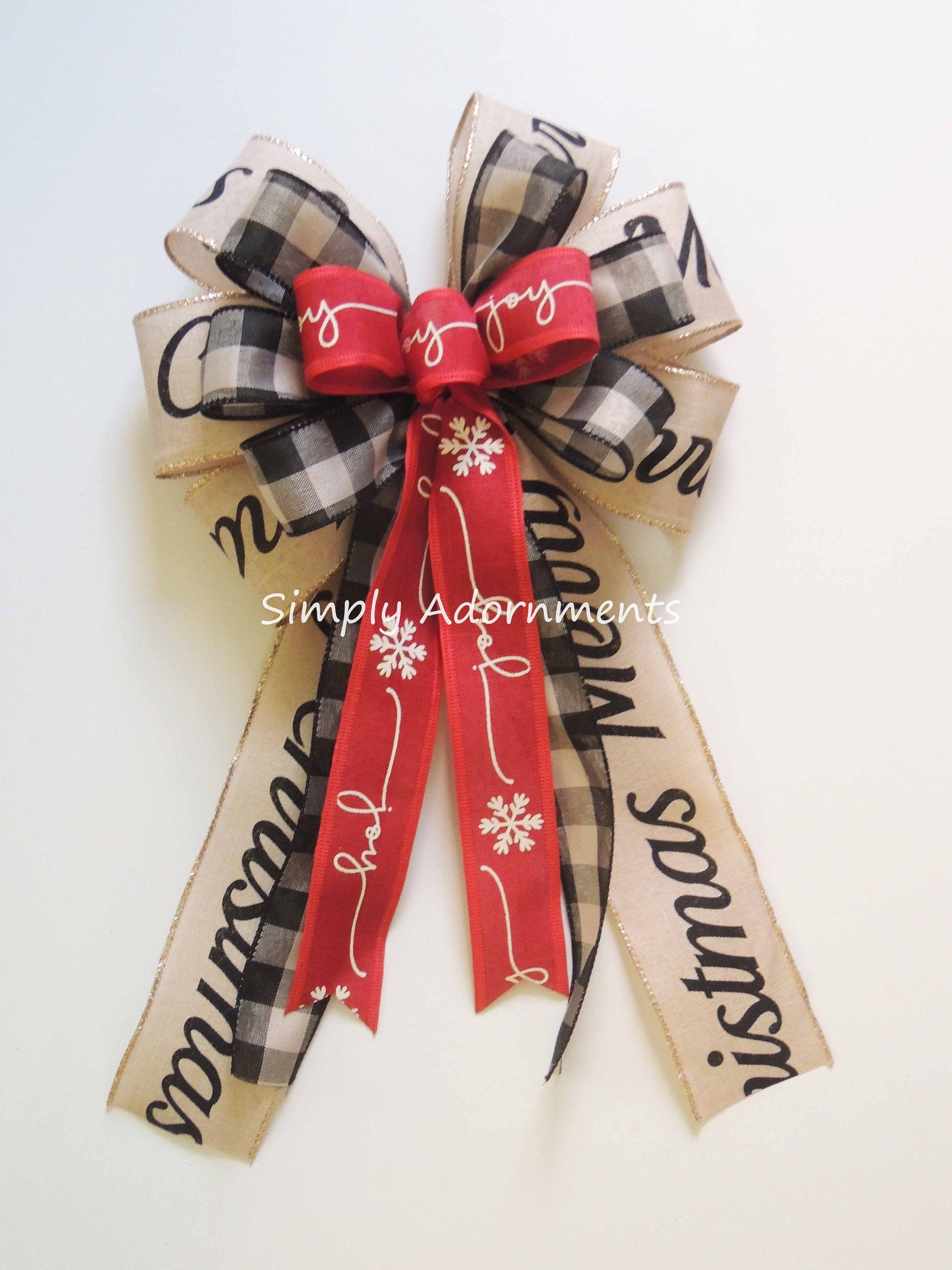The black buffalo bow is create with three wired ribbons: two ribbon is 1.5" wide black tan buffalo check and one 2.5" ribbon is "MERRY CHRISTMAS" scripts on tan with gold trim wired ribbon. For this particular bow, it has 6 varying length streamers, two of each type of ribbons, with length measuring from the top of the bow to the end of its streamers. Please select the bow size before checking out.