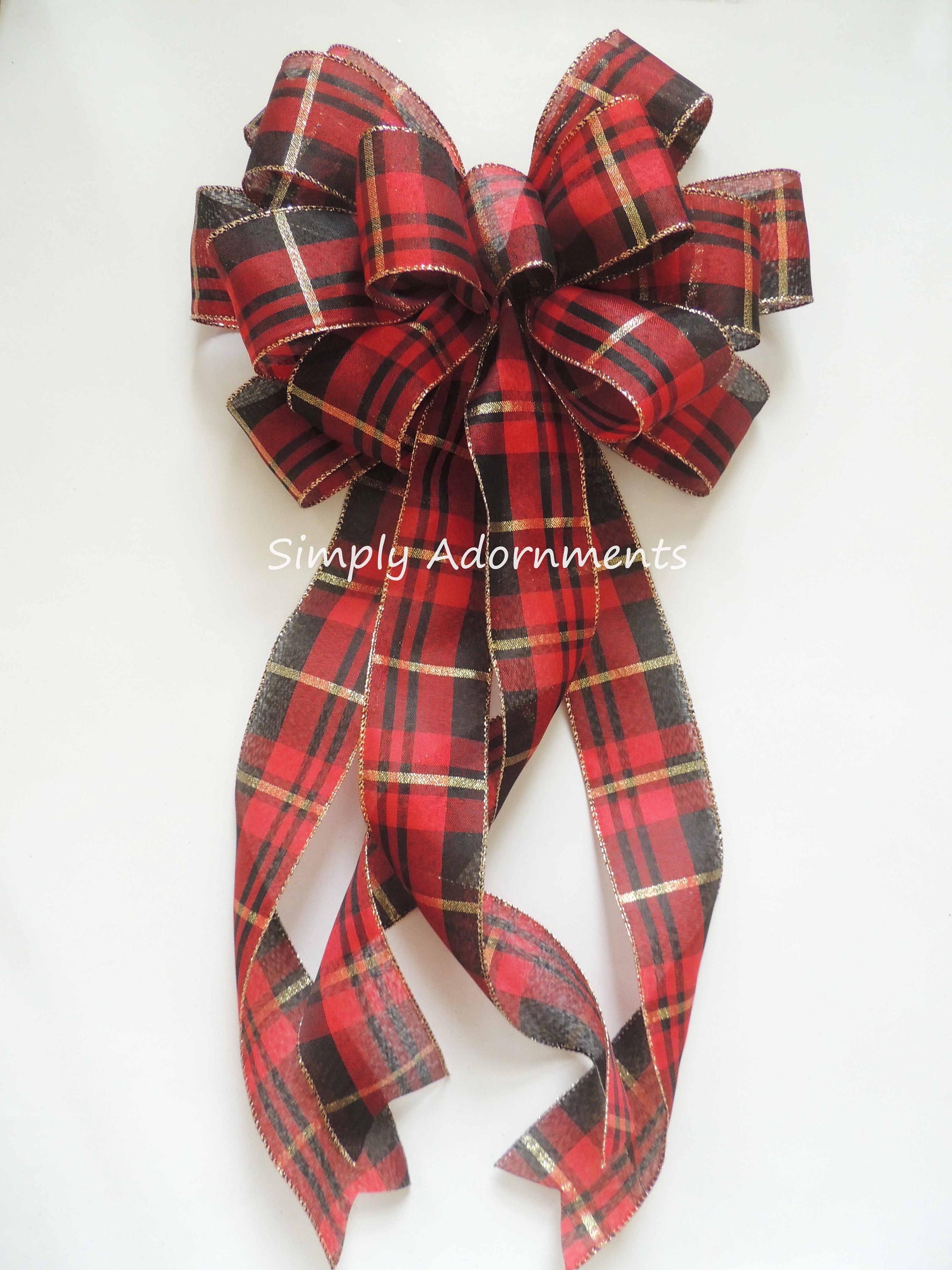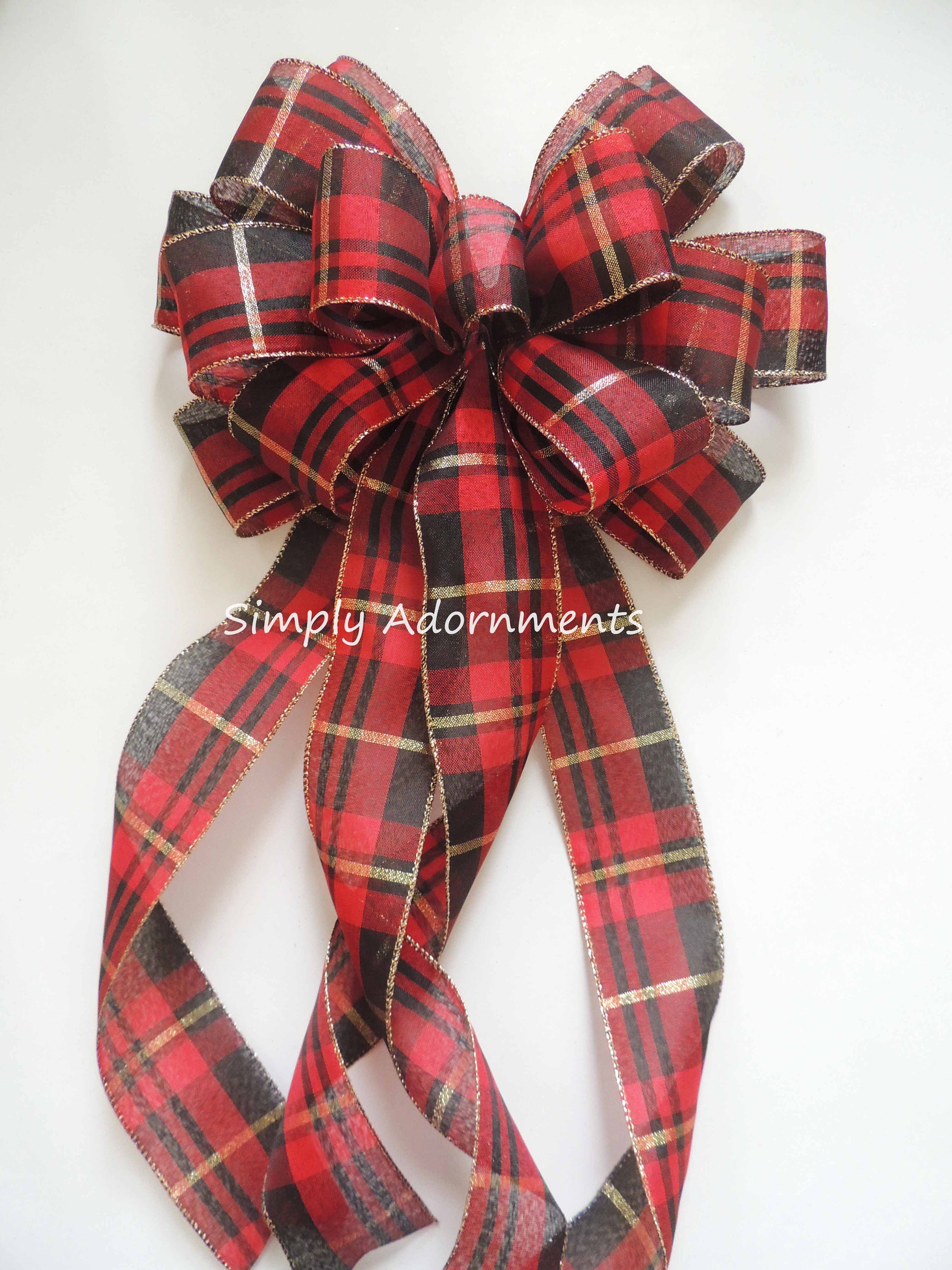 Each bow is create with 2.5" black red gold plaid wire-edged ribbons (or Red Green Gold plaid wired ribbon). Please select the bow size and the color combinations options before checking out.